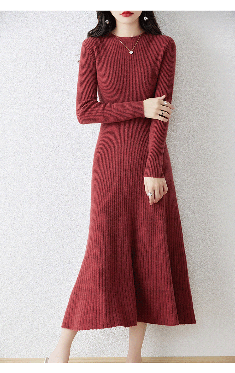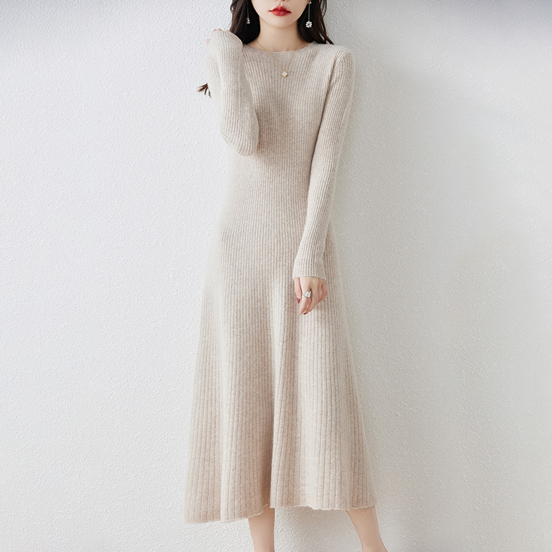 크루넥 울 니트 원피스 어린이 가을과 겨울 중간 길이 슬림 핏 슬리밍 스웨터 원피스 무릎 위 긴 소매 베이스 원피스