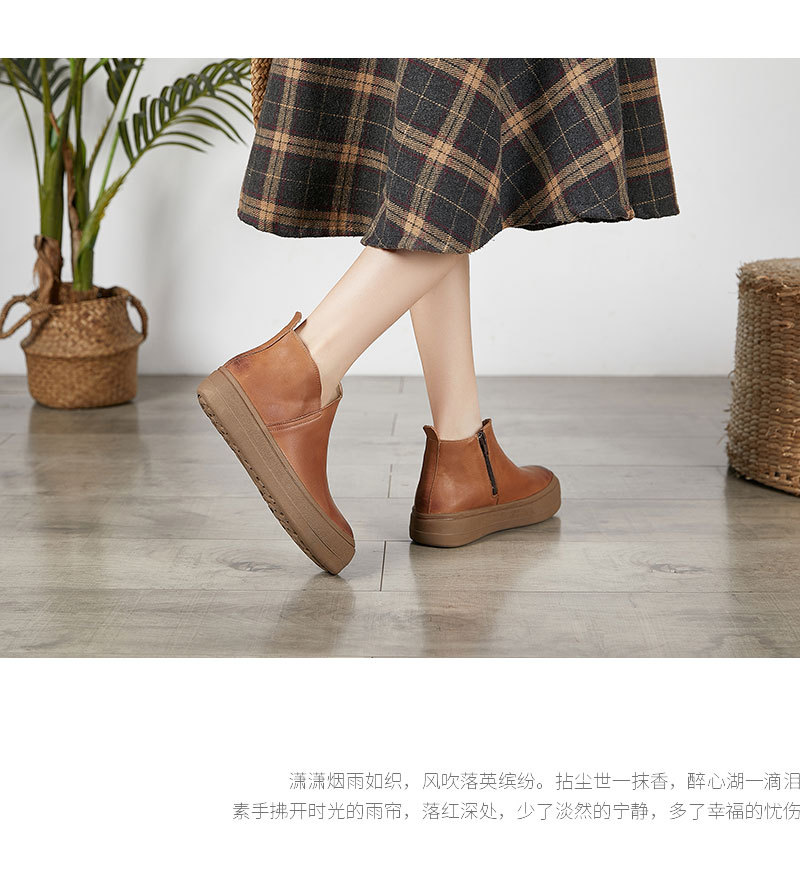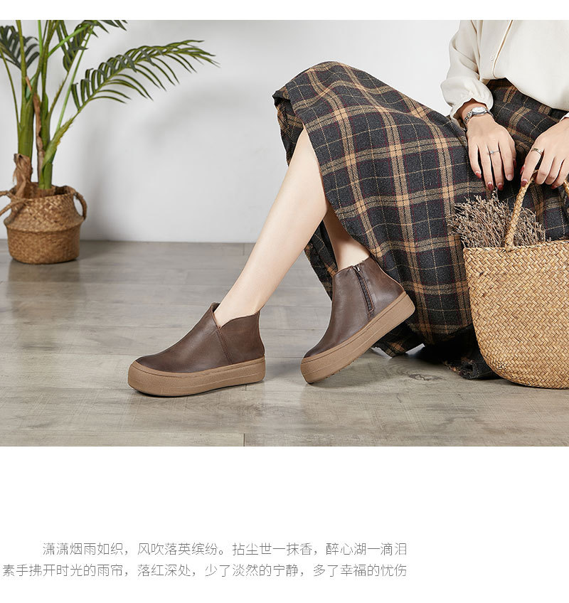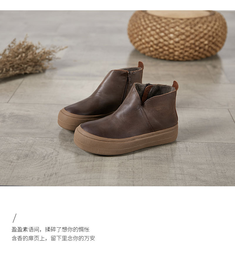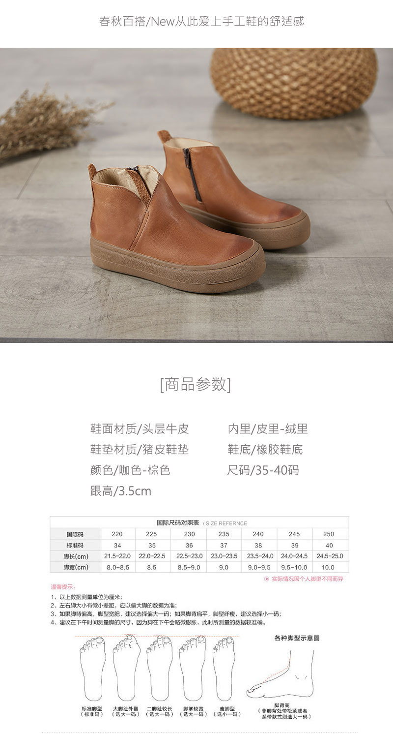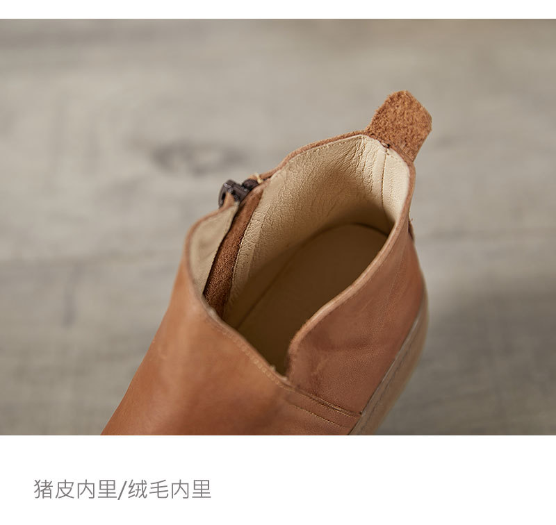 가을과 겨울 새로운 수제 소가죽 짧은 부츠 여성용 모리 스타일 레트로 라운드 헤드 두꺼운 바닥 예술적 모든 매치 정품 가죽 짧은 부츠 여성용 코튼 부츠