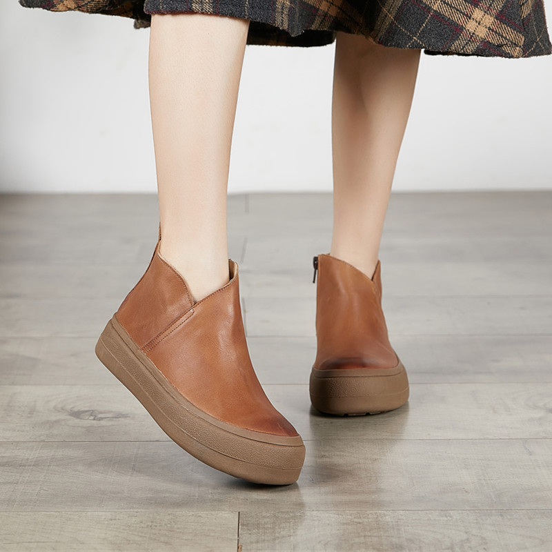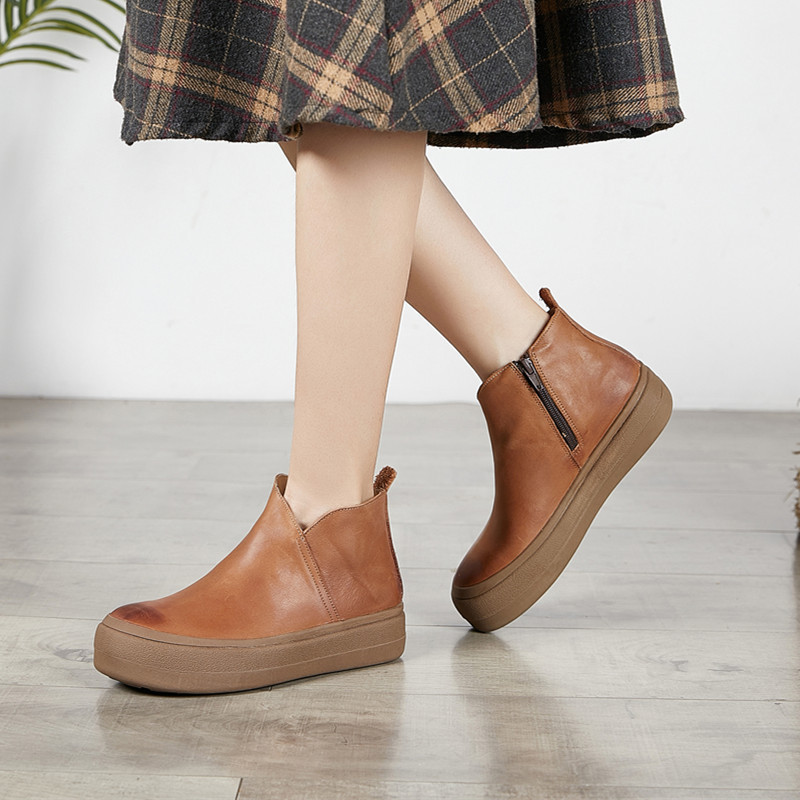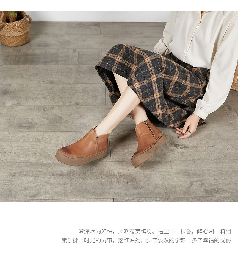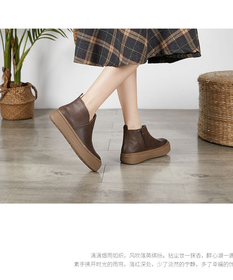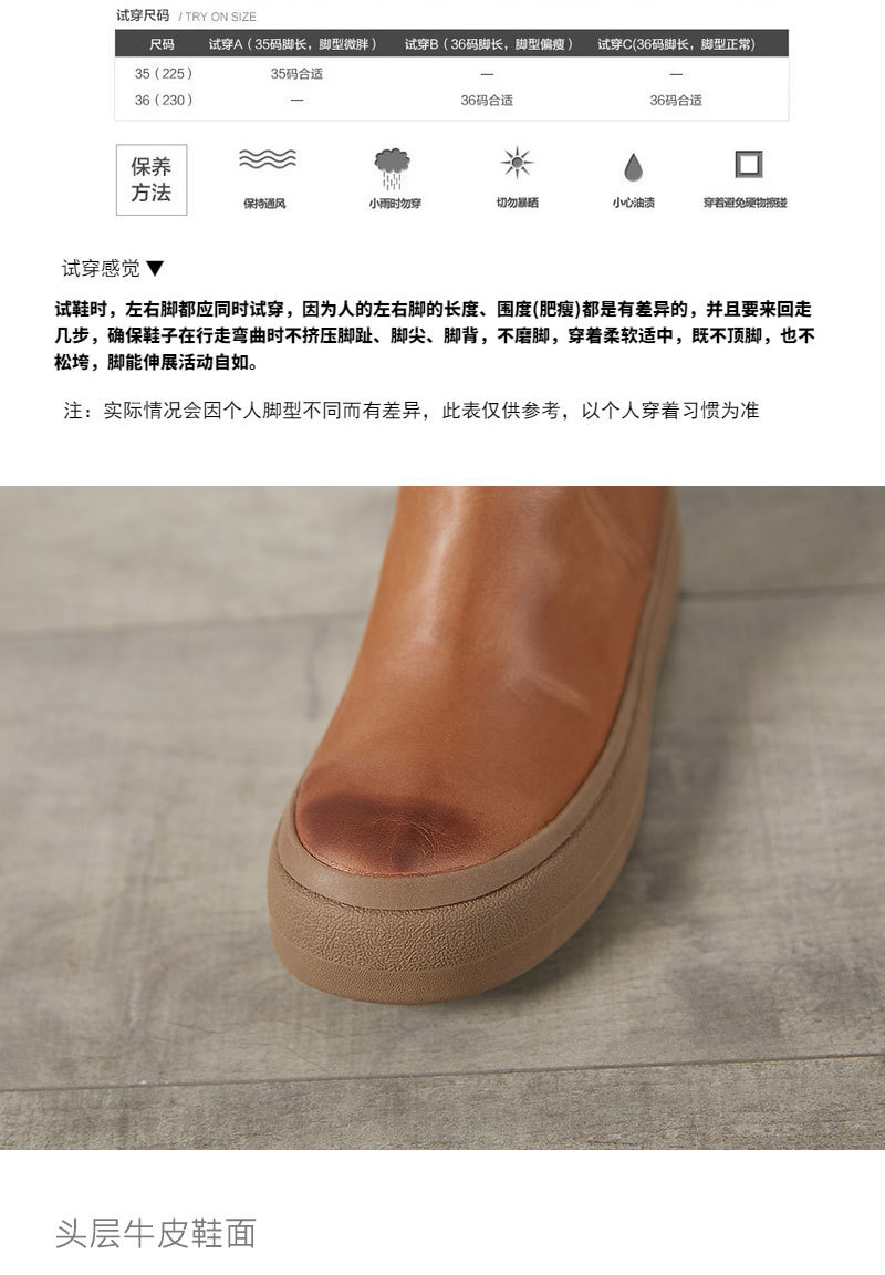 가을과 겨울 새로운 수제 소가죽 짧은 부츠 여성용 모리 스타일 레트로 라운드 헤드 두꺼운 바닥 예술적 모든 매치 정품 가죽 짧은 부츠 여성용 코튼 부츠