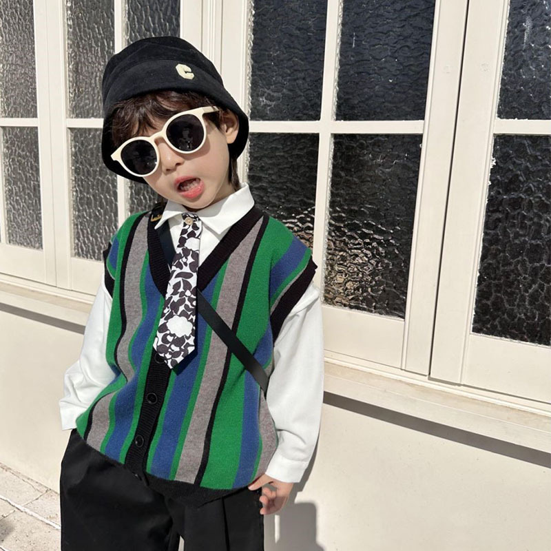 수직 줄무늬 만화 니트 조끼 한국 어린이 2025 봄 새로운 스타일 소년 소녀 아기 따뜻한 왁스 코트를 입고