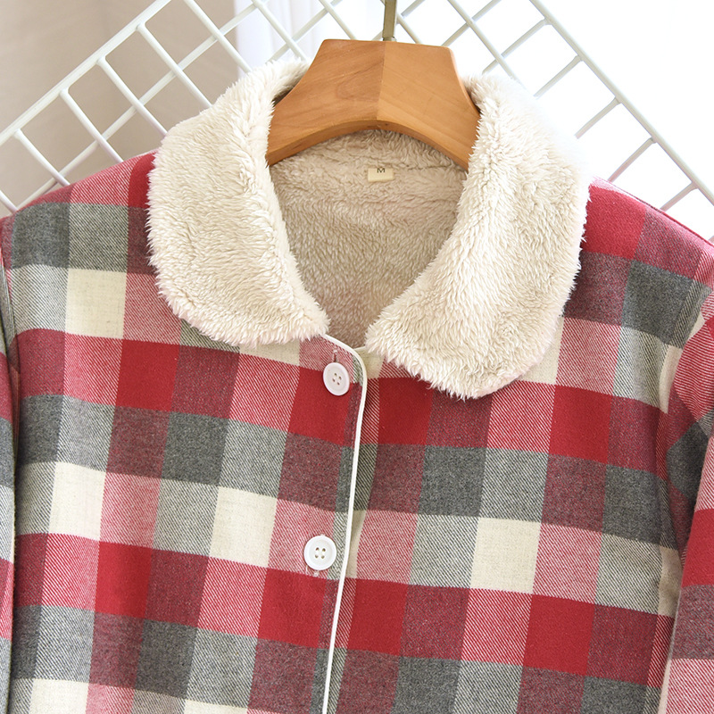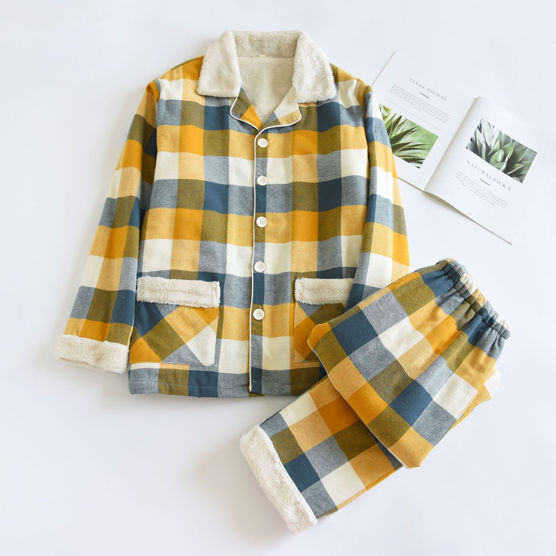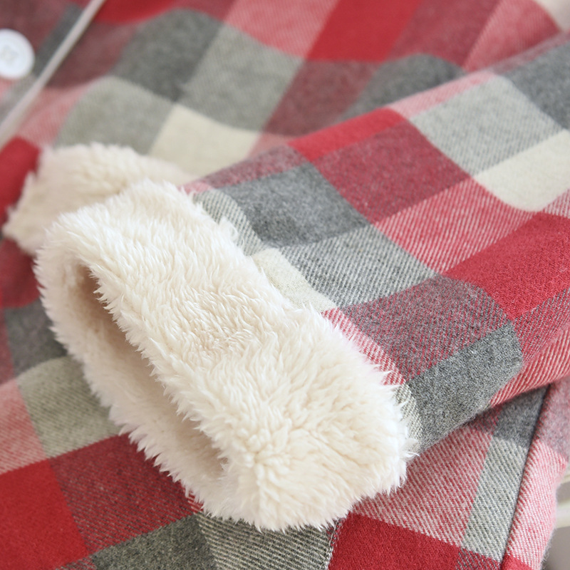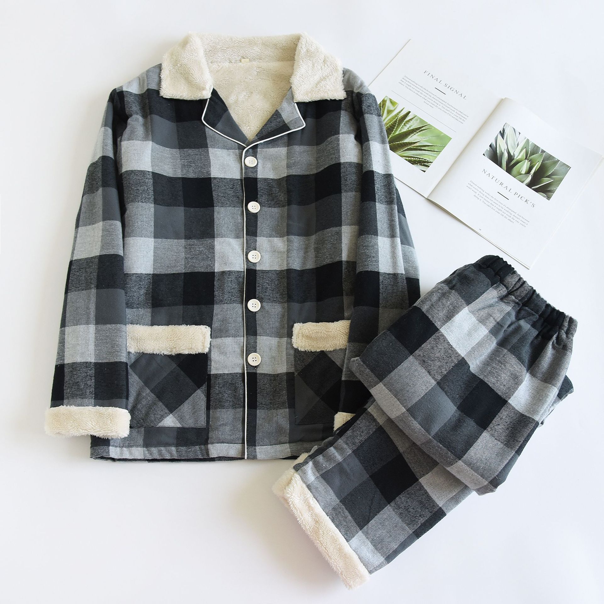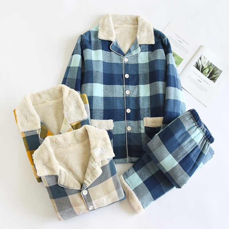 가을과 겨울 새로운 두꺼운 커플 격자 무늬 캐주얼 잠옷 더블 레이어 벨벳 램 벨벳 따뜻한 남성과 여성의 가정복
