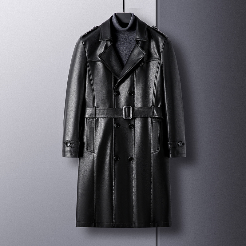 남자의 긴 가죽 코트 가을과 겨울 새로운 기모 더블 브레스트 비즈니스 캐주얼 벨트 부드러운 가죽 코트 가죽 트렌치 코트 남성 코트스토어 가기