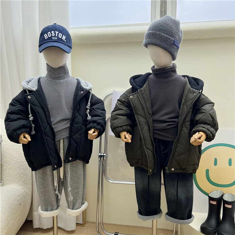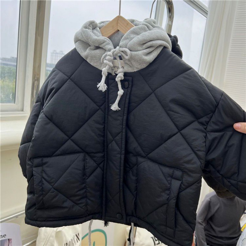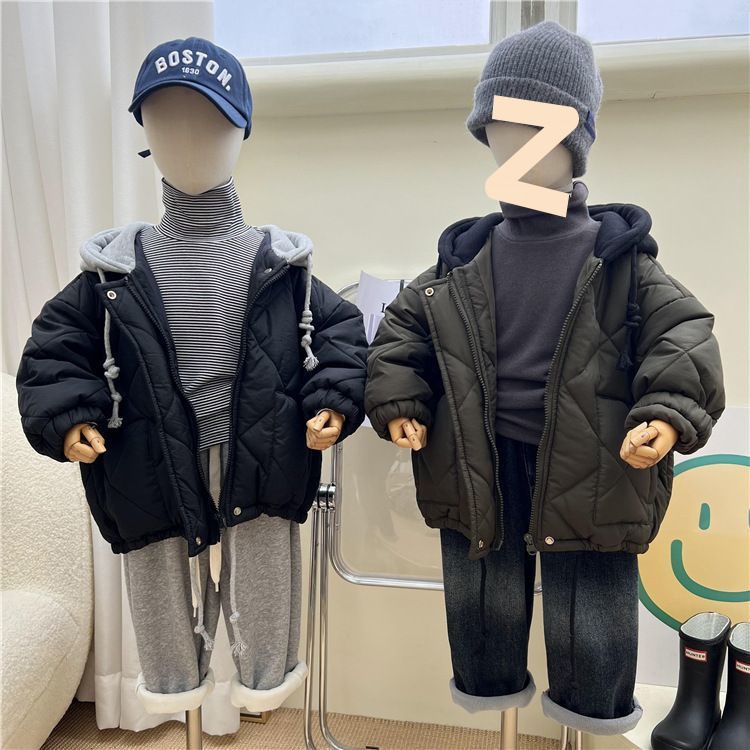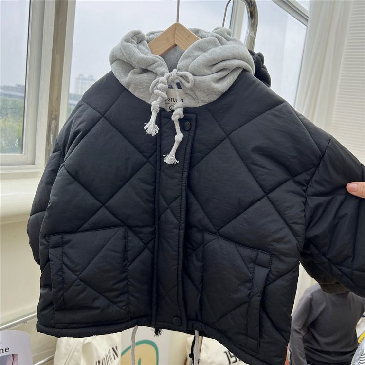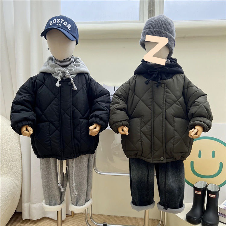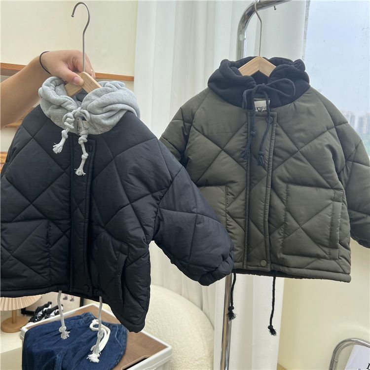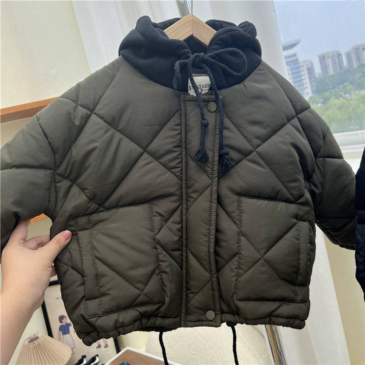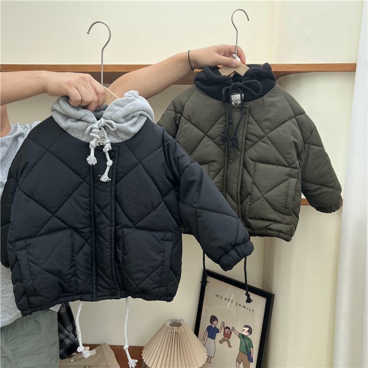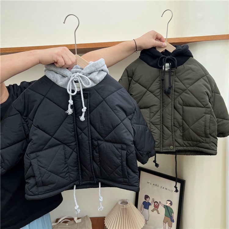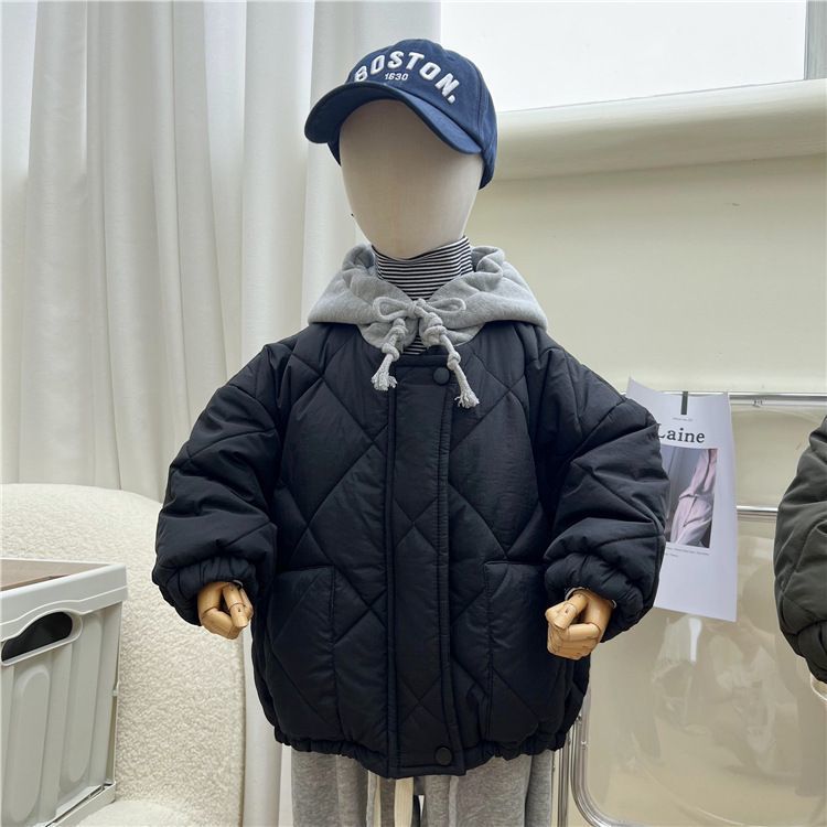 한국 아동복 겨울 소년 소녀 두꺼운 마름모 중간 길이 면 패딩 재킷 트렌디한 아동용 가짜 투피스 후드 코튼 패딩 코트스토어 가기