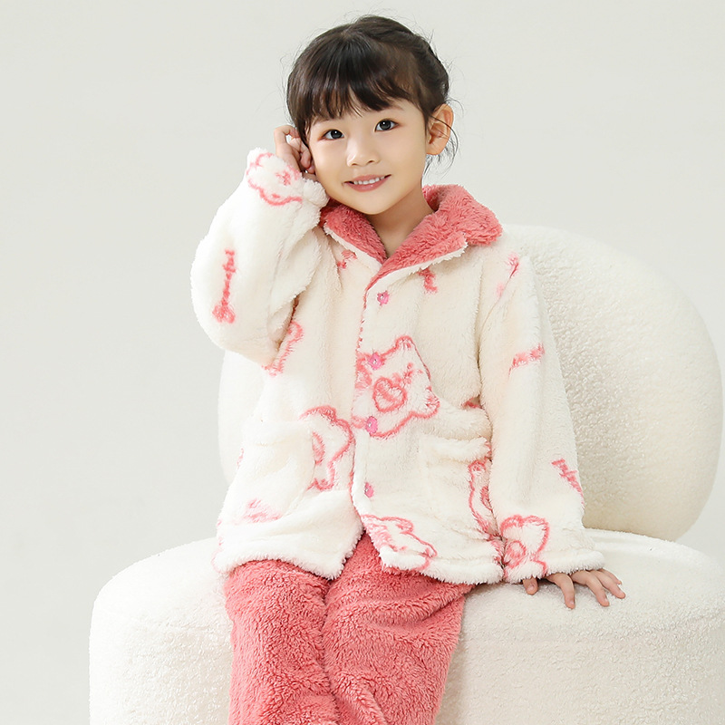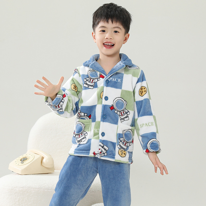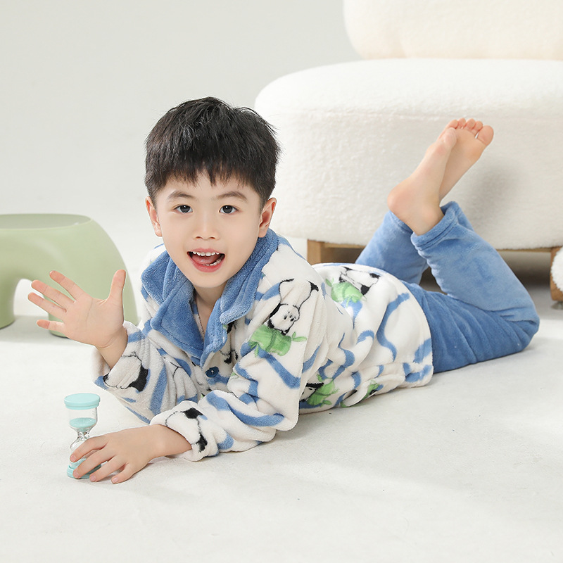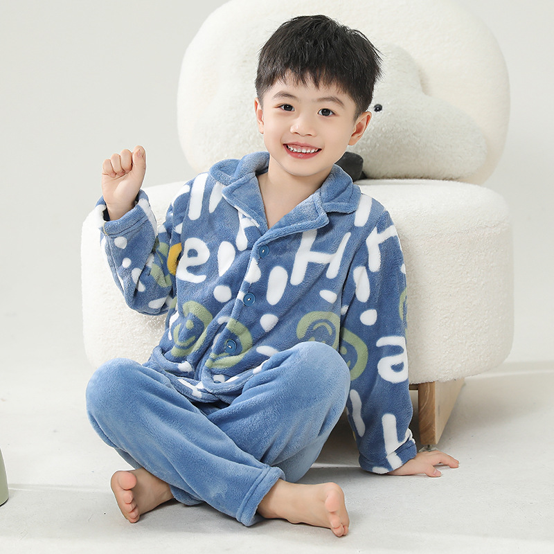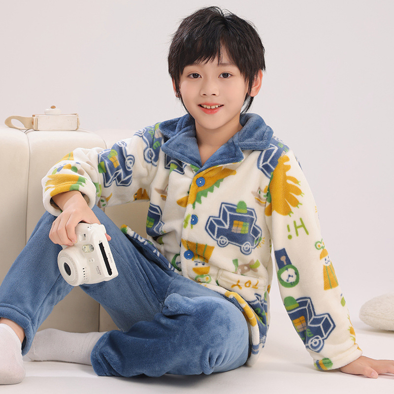 어린이 잠옷 플란넬 가정 의류 가을과 겨울 옷 남학생 산호 벨벳 아기의 중간 및 큰 어린이 두꺼운 세트스토어 가기