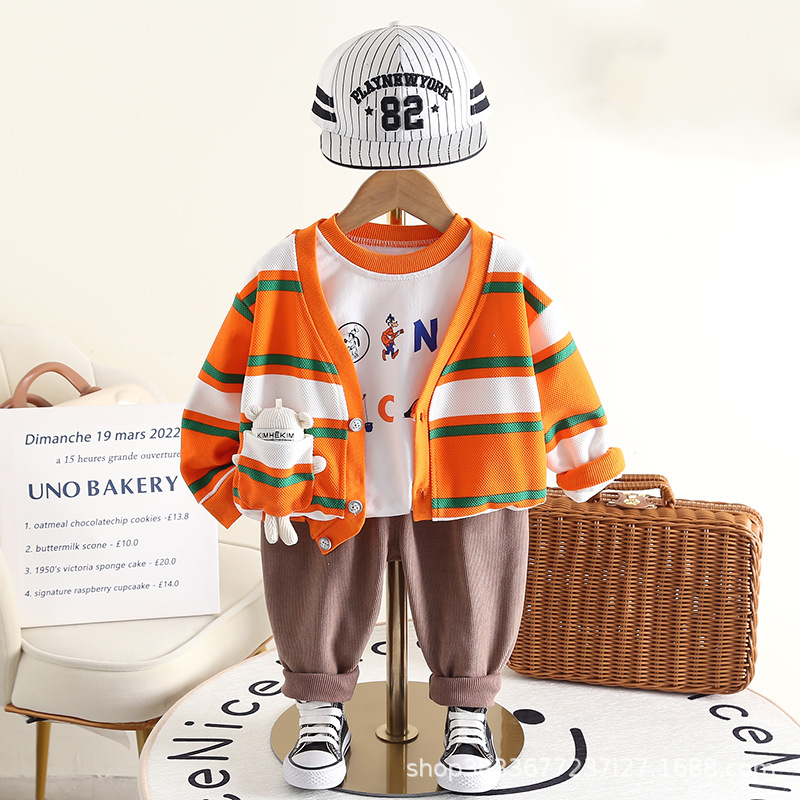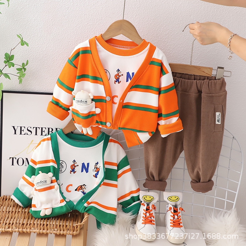 어린이 가을 줄무늬 인형 곰 가디건 쓰리피스 세트 남아 세트 2023 새로운 스타일 양식 어린이 가을 남성스토어 가기