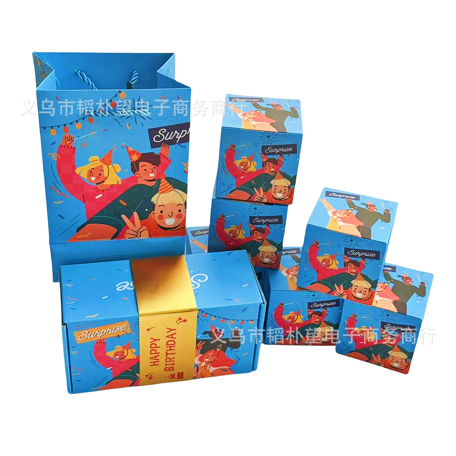 • 블루 케이크 HAPPY BIRTHDAY; 바운스 박스 18개 + 선물 상자 + 선물 가방
