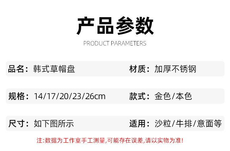 304 스테인레스 스틸 한국 밀짚 모자 접시 서양 스테이크 디저트 스파게티 상업용 스타일 냄비 접시 빈티지