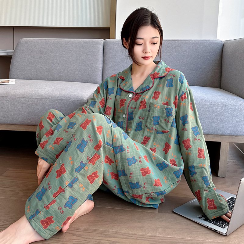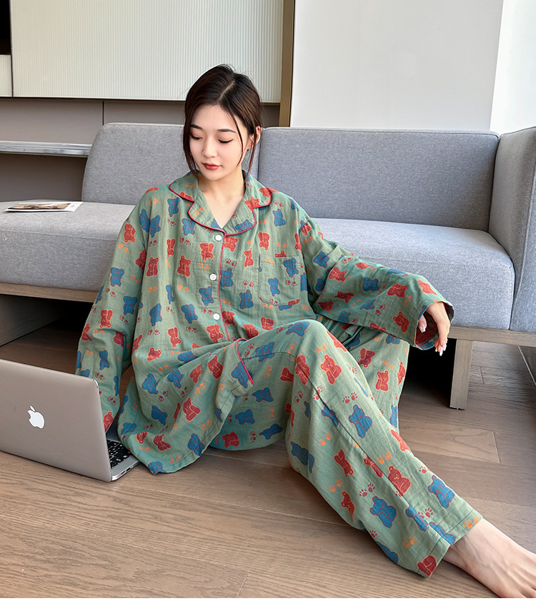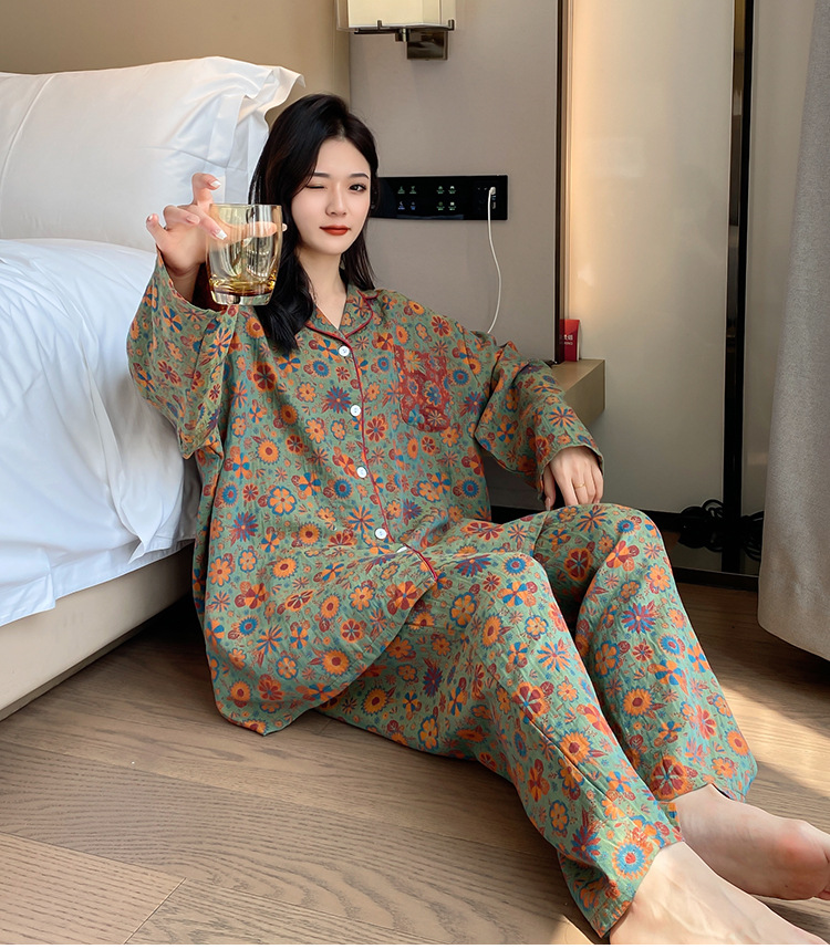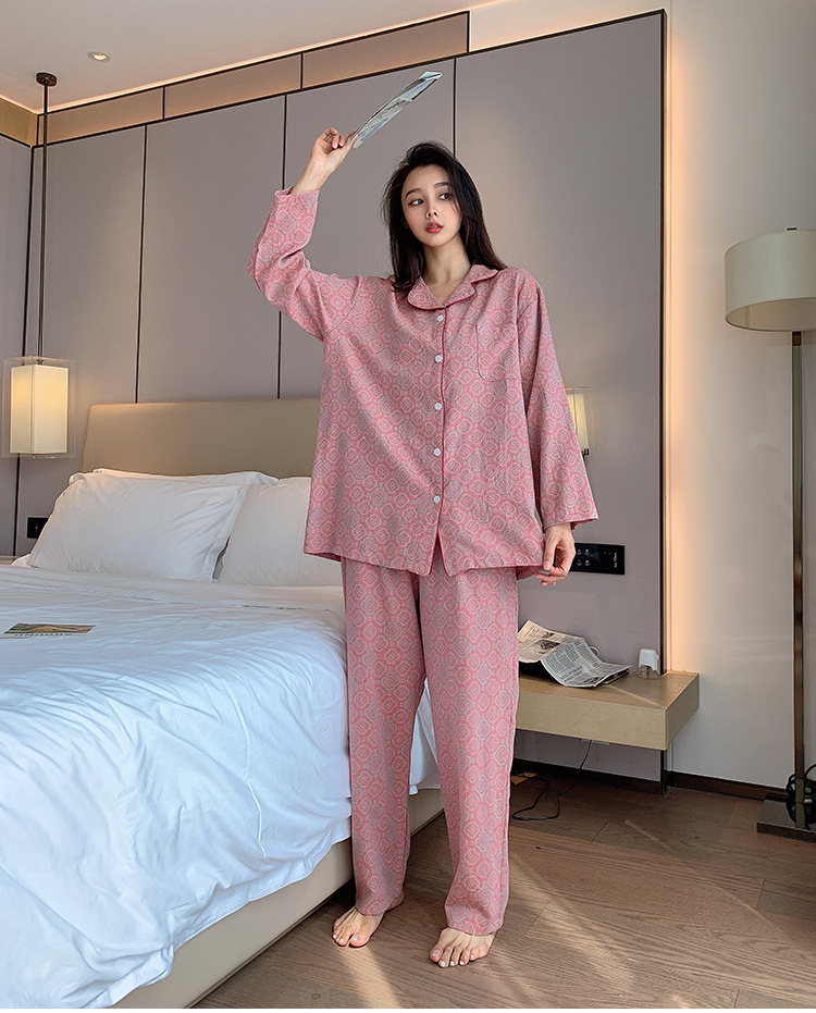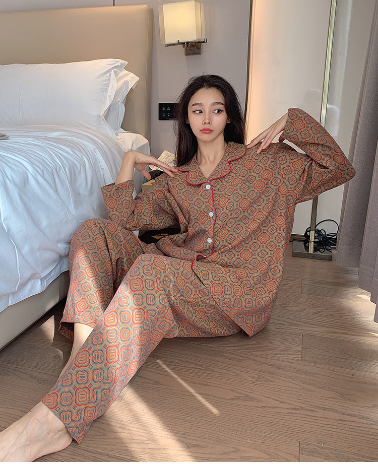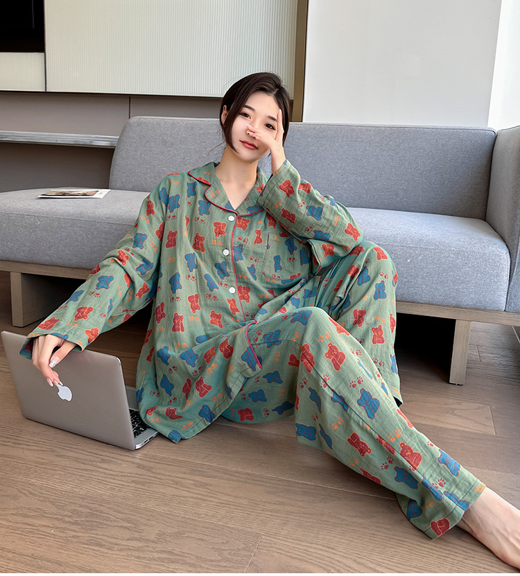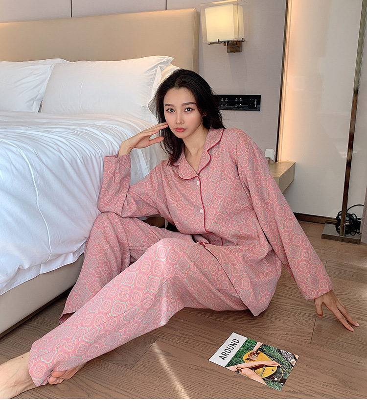 봄과 가을 플러스 사이즈 긴팔 바지 잠옷 여자의 면 가정 옷 세트 만화 얇은 두 조각 느슨한 옷깃 잠옷스토어 가기