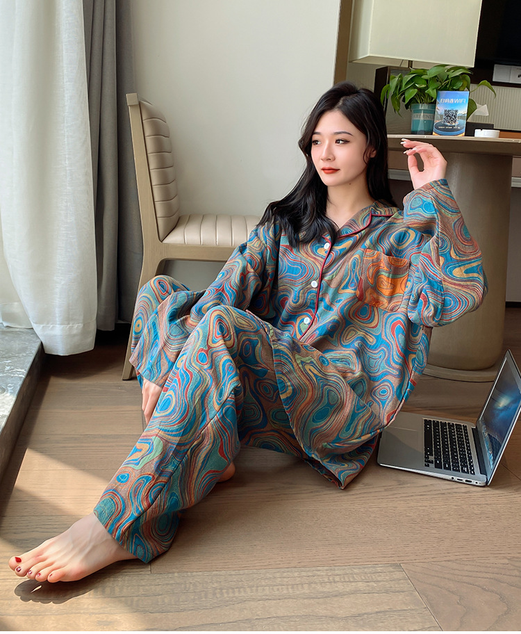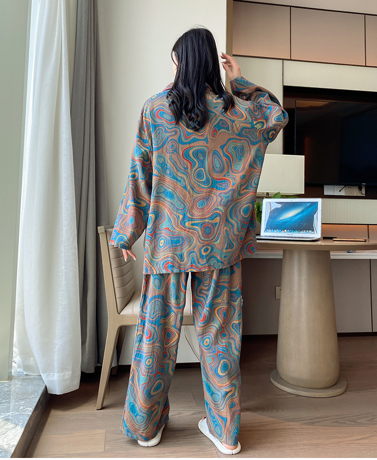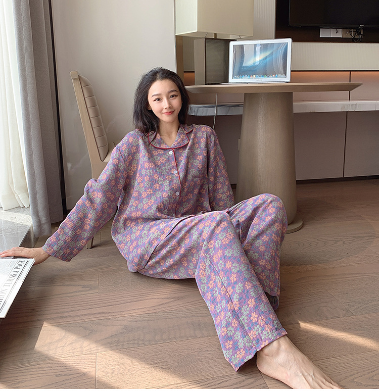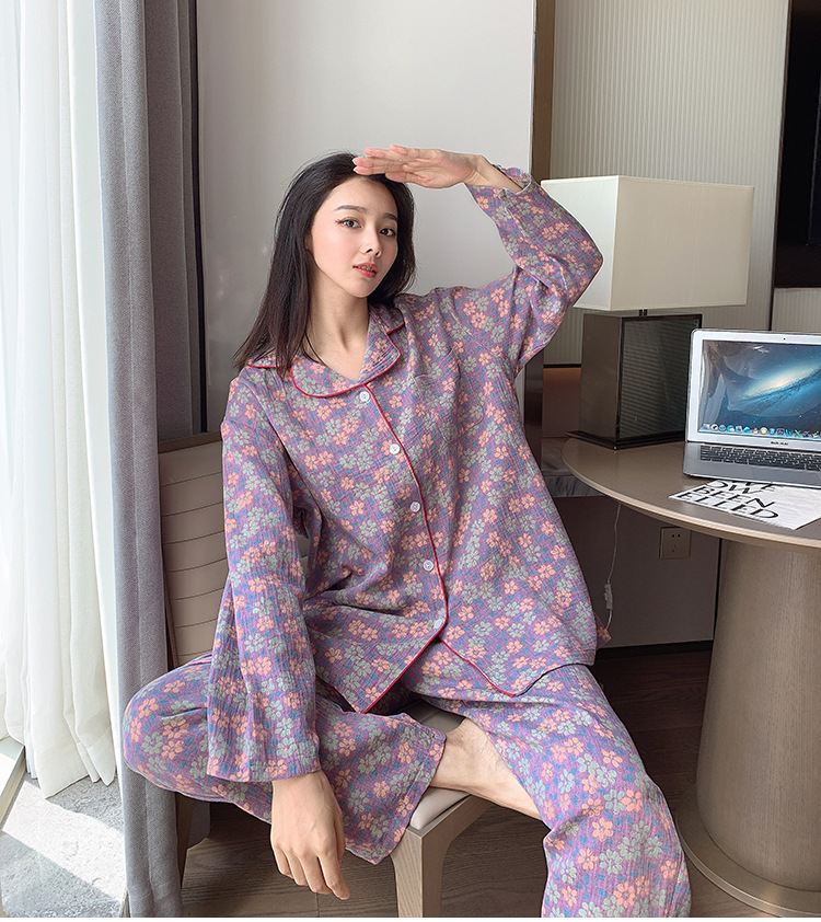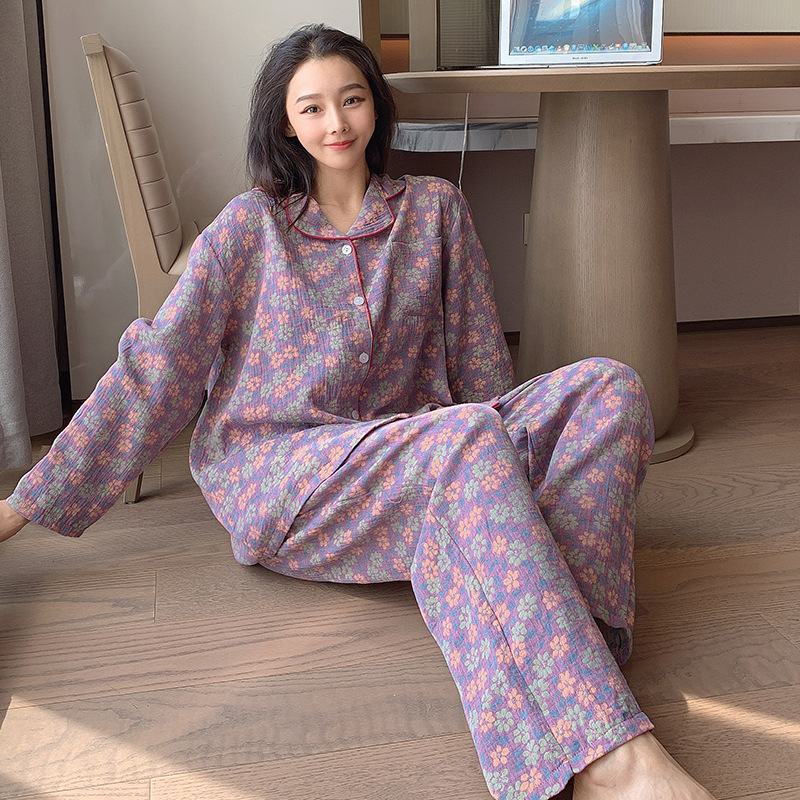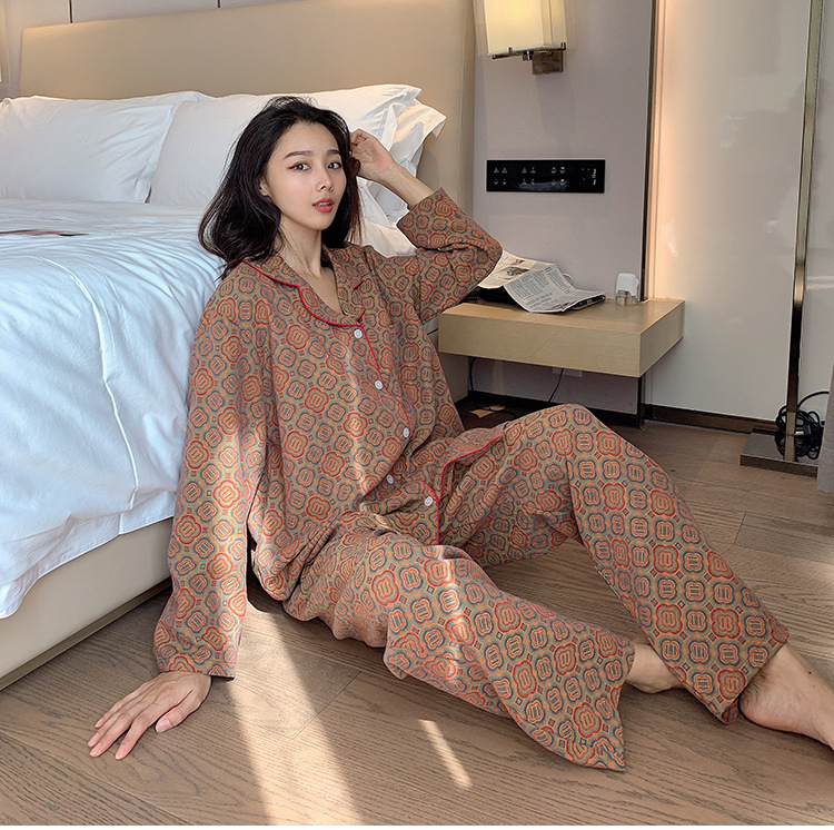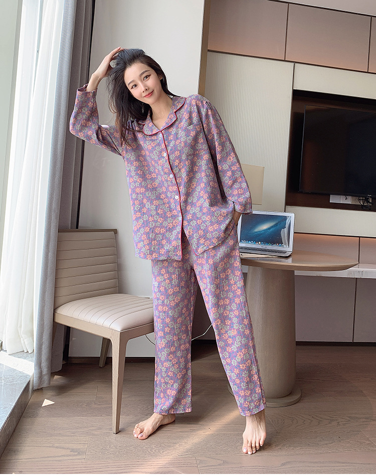 봄과 가을 플러스 사이즈 긴팔 바지 잠옷 여자의 면 가정 옷 세트 만화 얇은 두 조각 느슨한 옷깃 잠옷스토어 가기