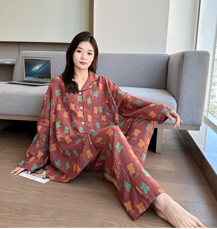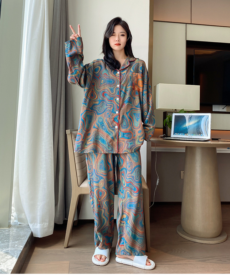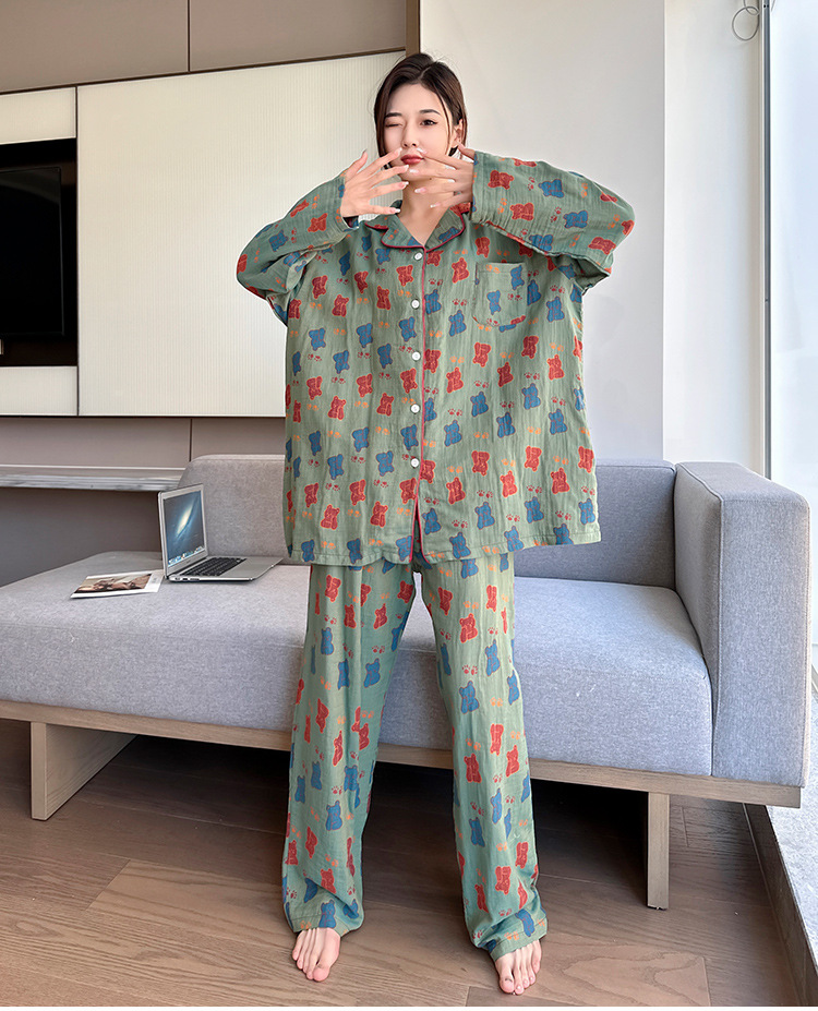 봄과 가을 플러스 사이즈 긴팔 바지 잠옷 여자의 면 가정 옷 세트 만화 얇은 두 조각 느슨한 옷깃 잠옷