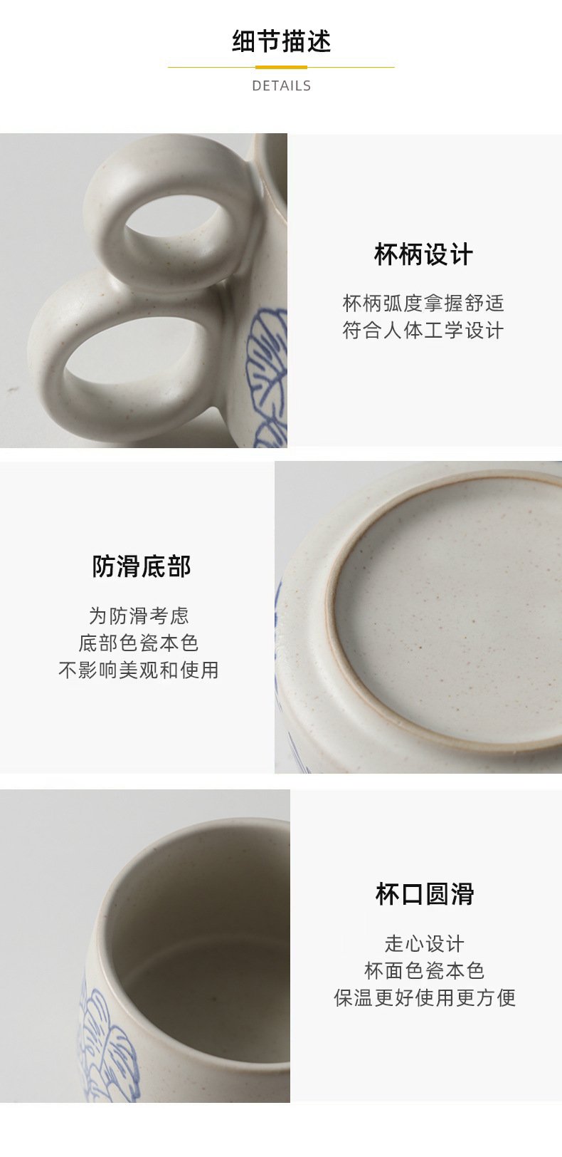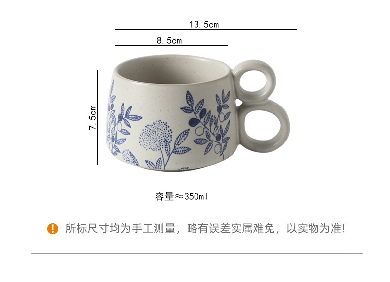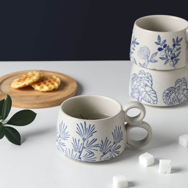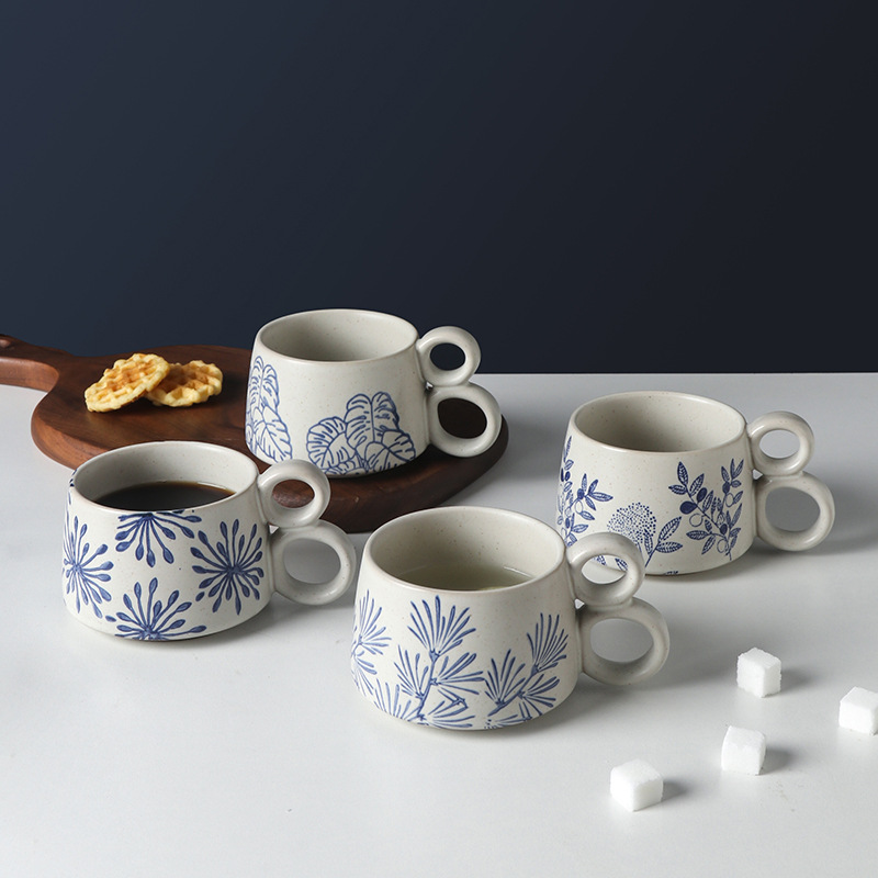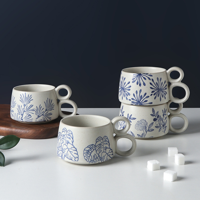 손으로 그린 파란색과 흰색 유약 머그잔 빈티지 석기 창조적 인 가정용 물 컵 언더 글레이즈 커피 아침 식사 컵 연인을위한 선물스토어 가기