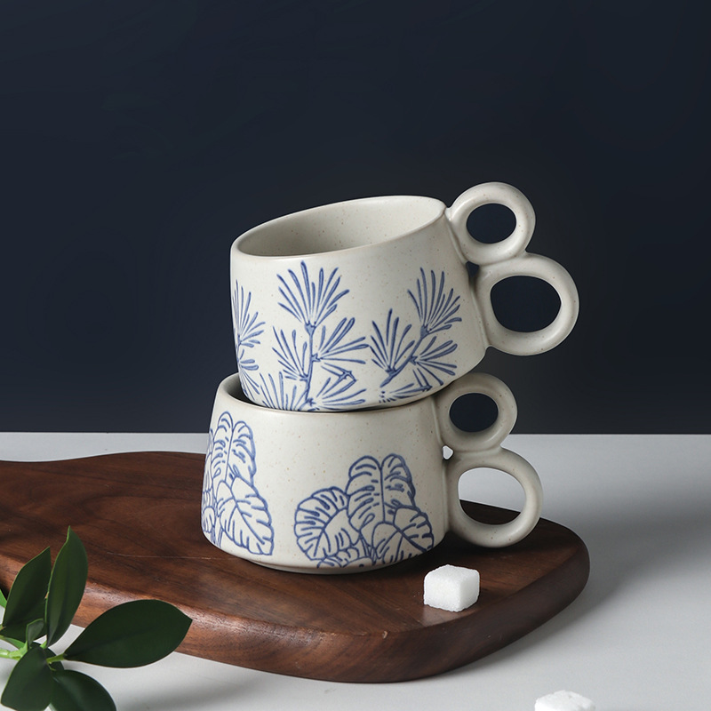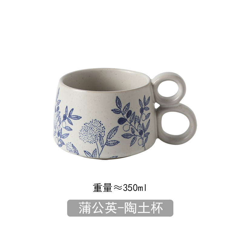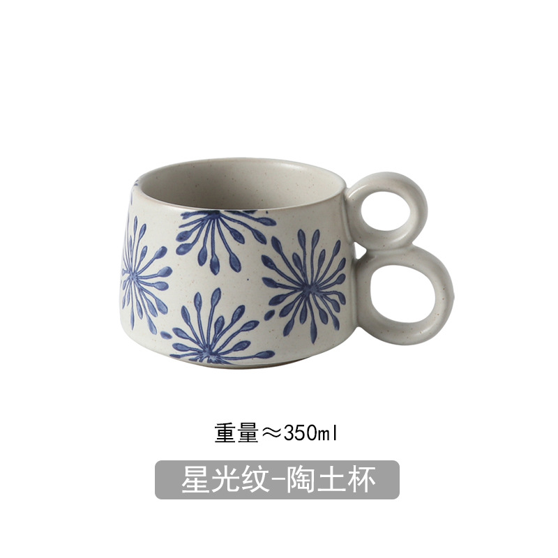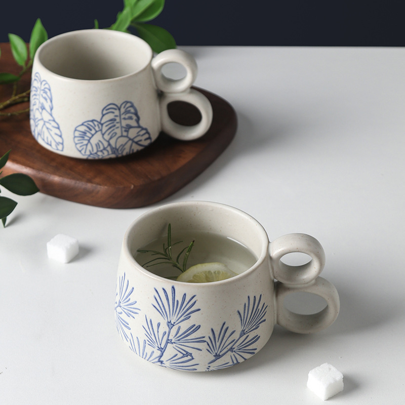 손으로 그린 파란색과 흰색 유약 머그잔 빈티지 석기 창조적 인 가정용 물 컵 언더 글레이즈 커피 아침 식사 컵 연인을위한 선물