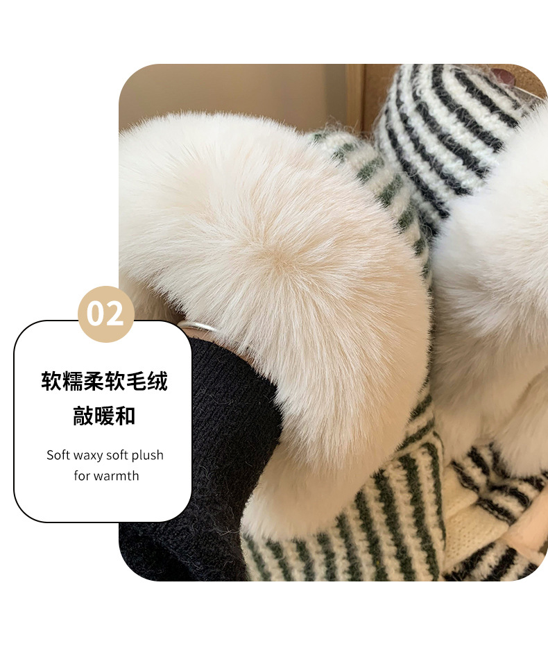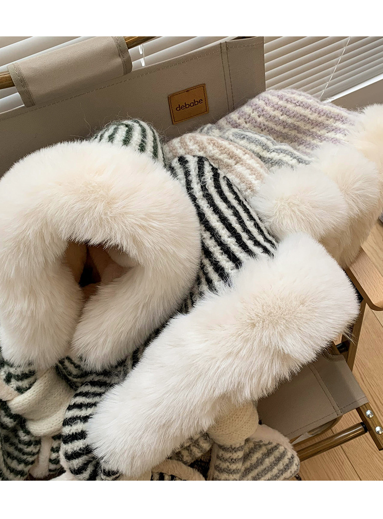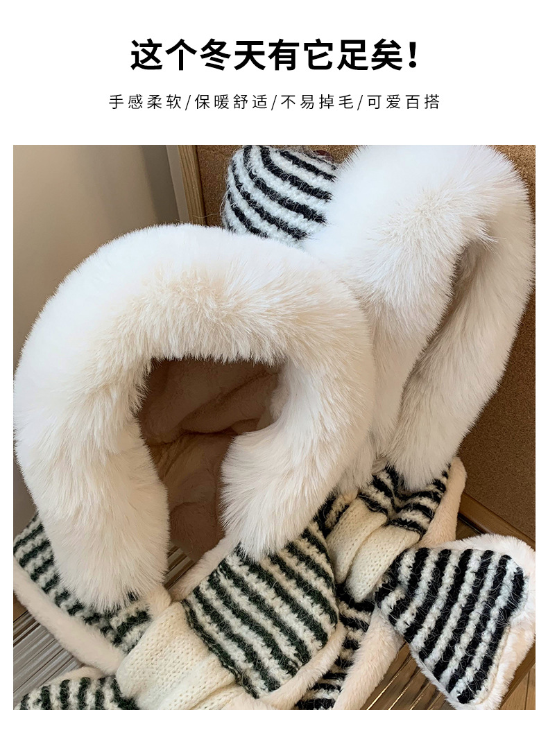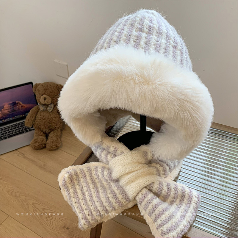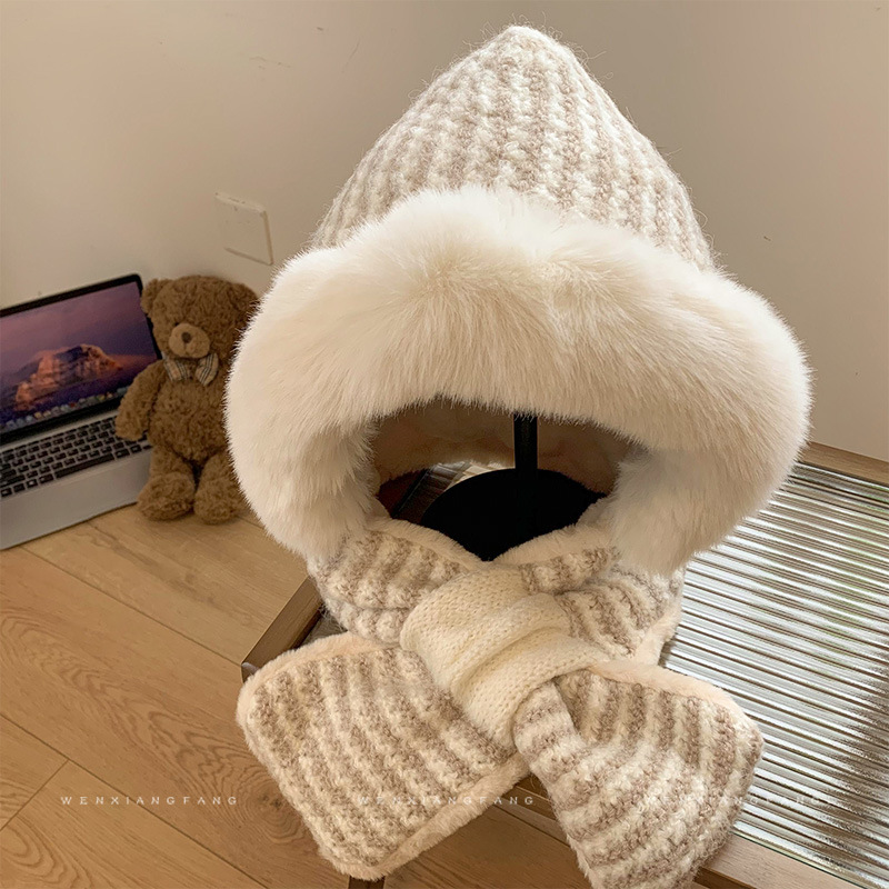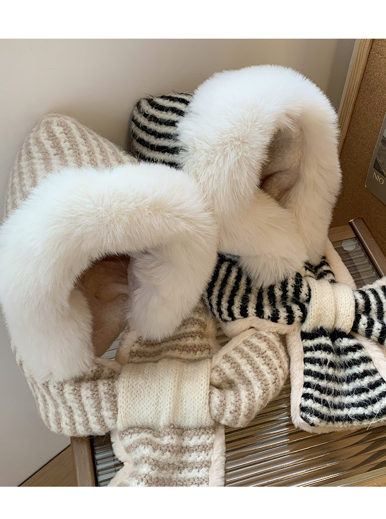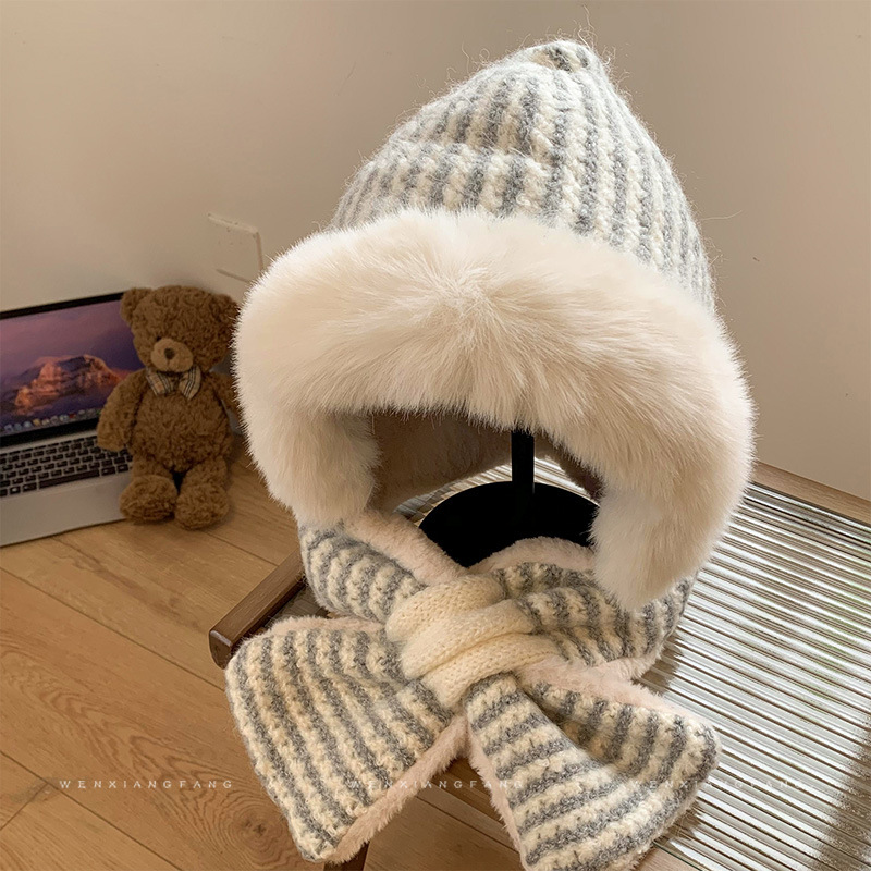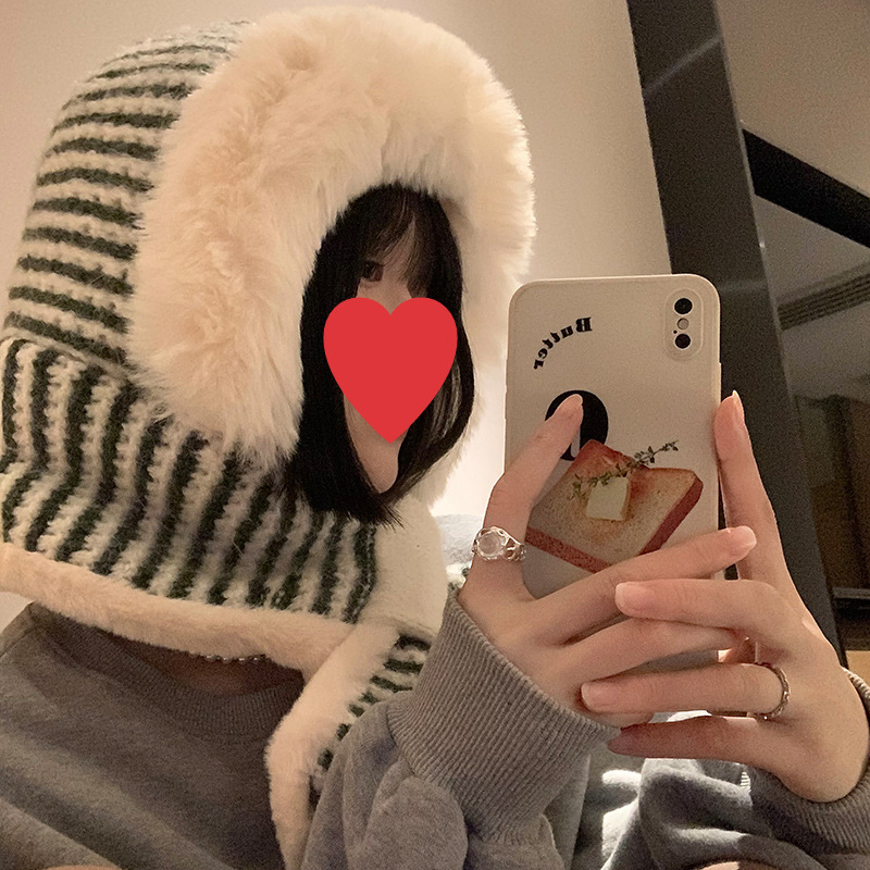 스트라이프 플러시 모자와 스카프 올인원 여성용 겨울 한국식 얼굴 작은 자전거 방한 니트 귀 보호대 Lei Feng Cap 트렌디