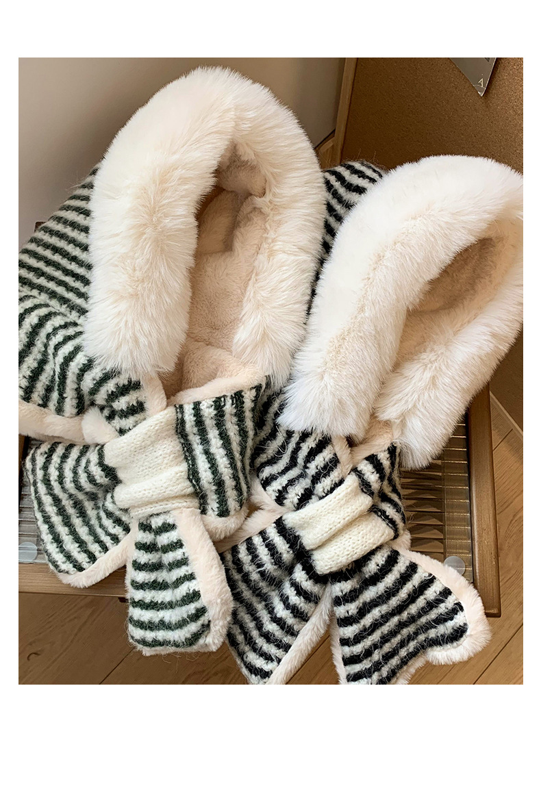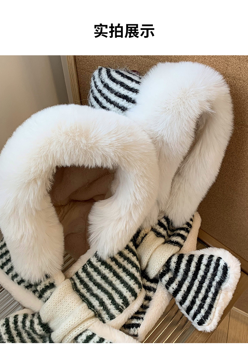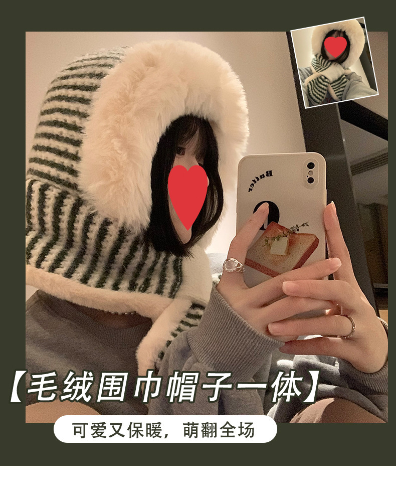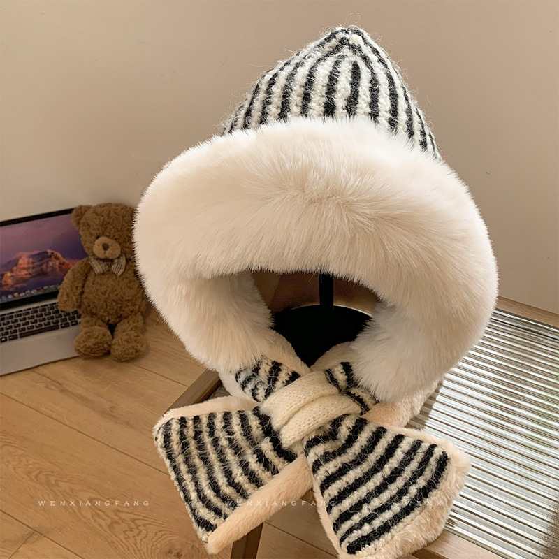 스트라이프 플러시 모자와 스카프 올인원 여성용 겨울 한국식 얼굴 작은 자전거 방한 니트 귀 보호대 Lei Feng Cap 트렌디스토어 가기
