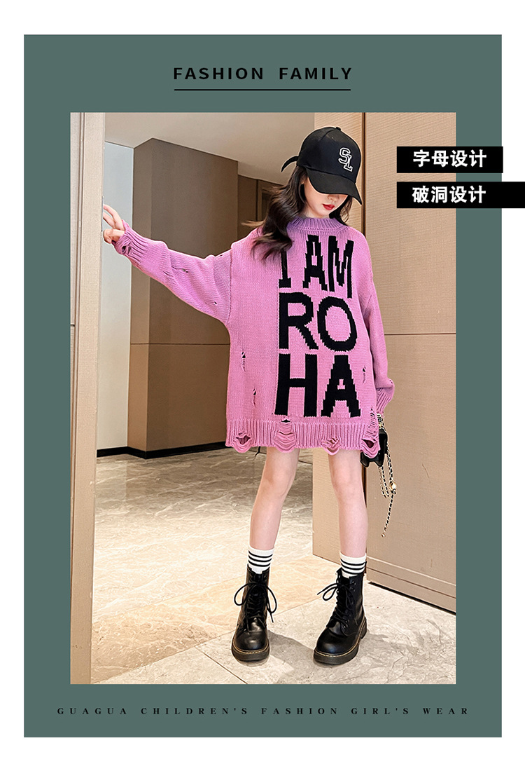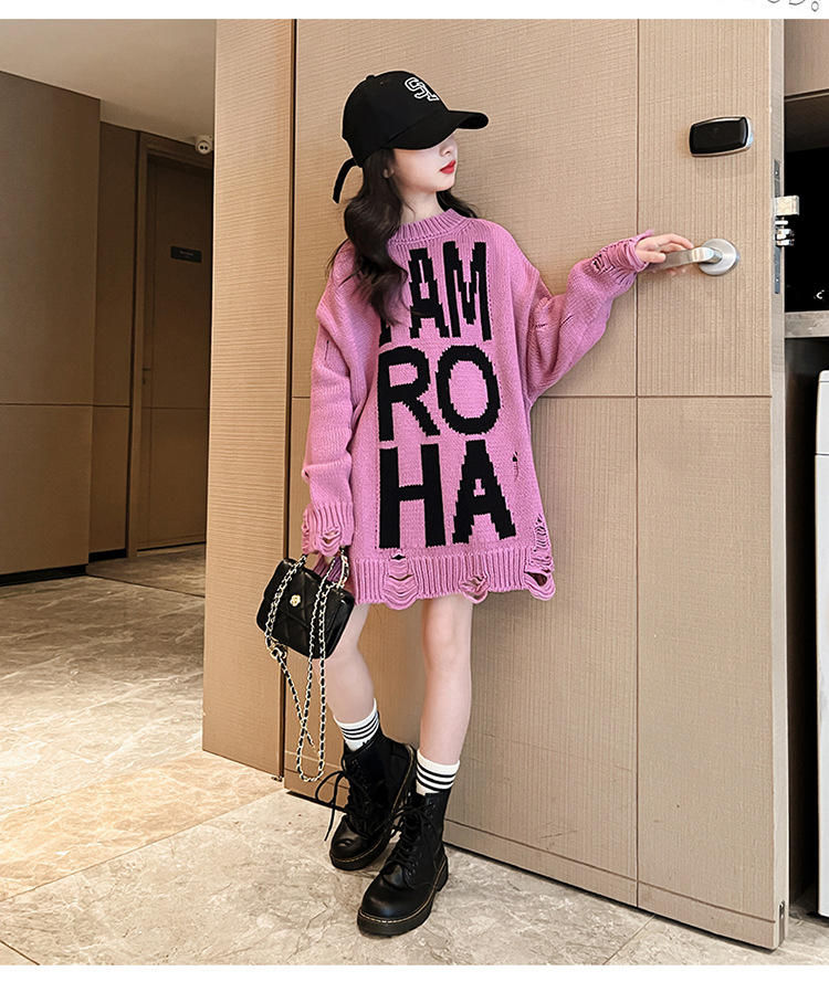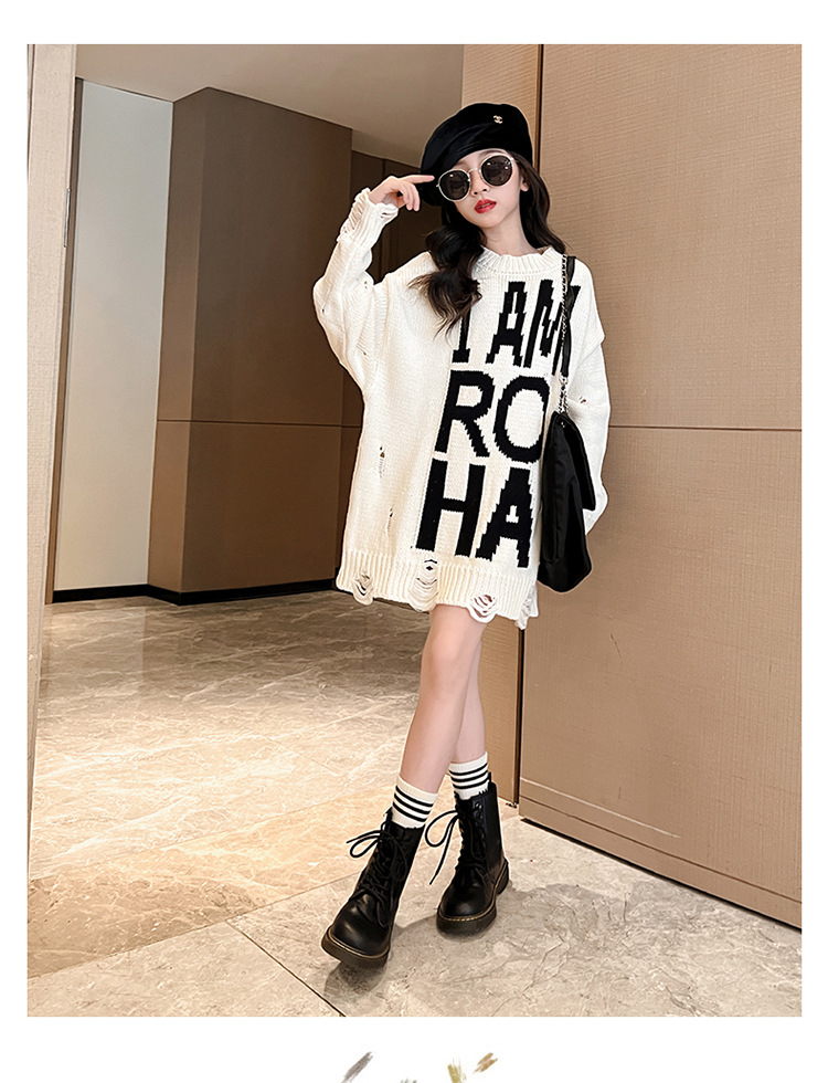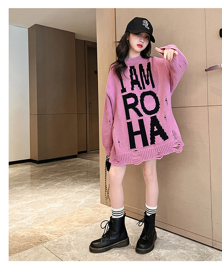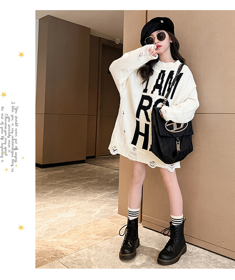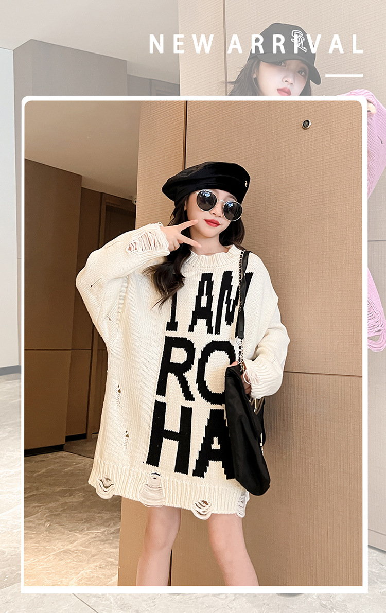 여자 찢어진 스웨터 느슨한 2024 가을 옷 어린 소녀 다목적 편지 중간 길이 긴 소매 라운드 넥 니트 탑