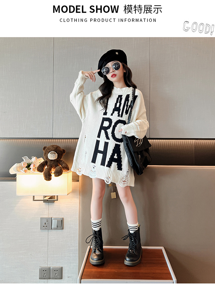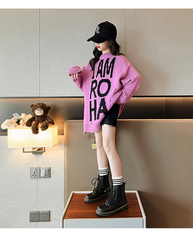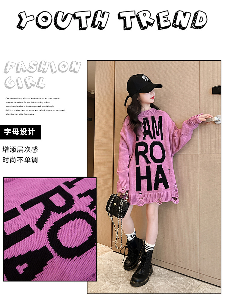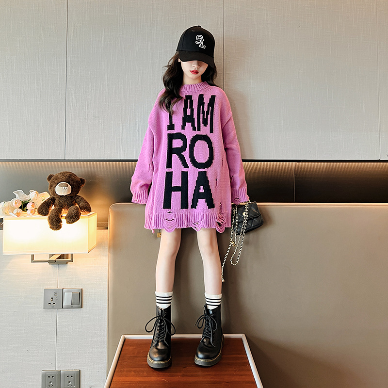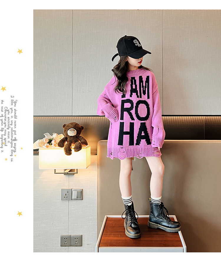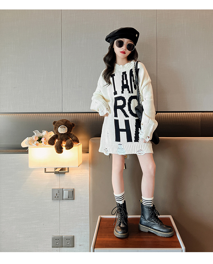 여자 찢어진 스웨터 느슨한 2024 가을 옷 어린 소녀 다목적 편지 중간 길이 긴 소매 라운드 넥 니트 탑