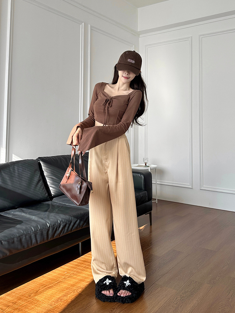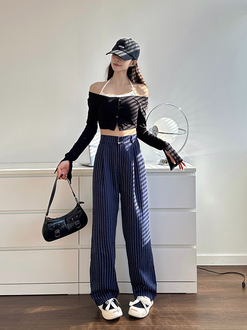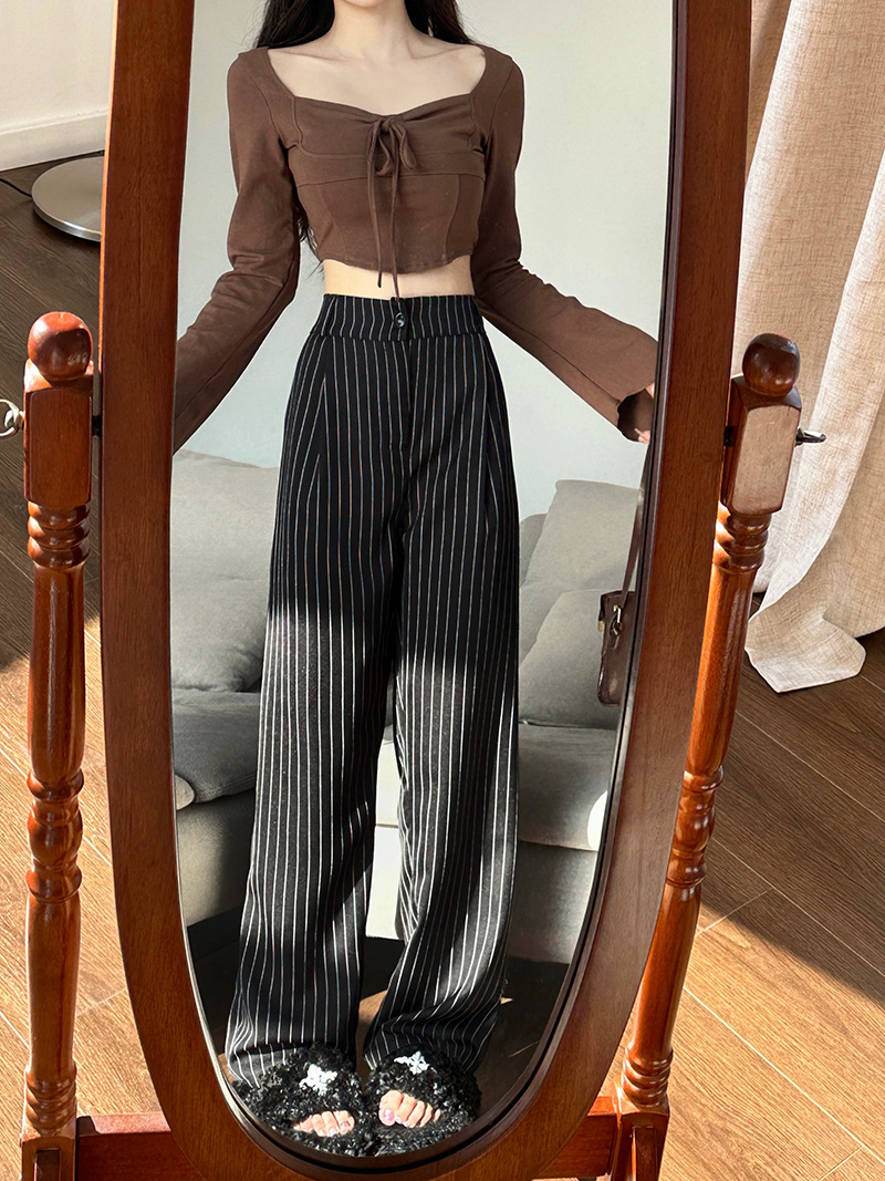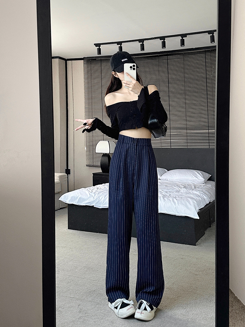 플러스 사이즈 세로 스트라이프 바지 여자의 2023 여름 새로운 하이 웨이스트 느슨한 슬리밍 좁은 와이드 레그 스트레이트 웨스턴 팬츠