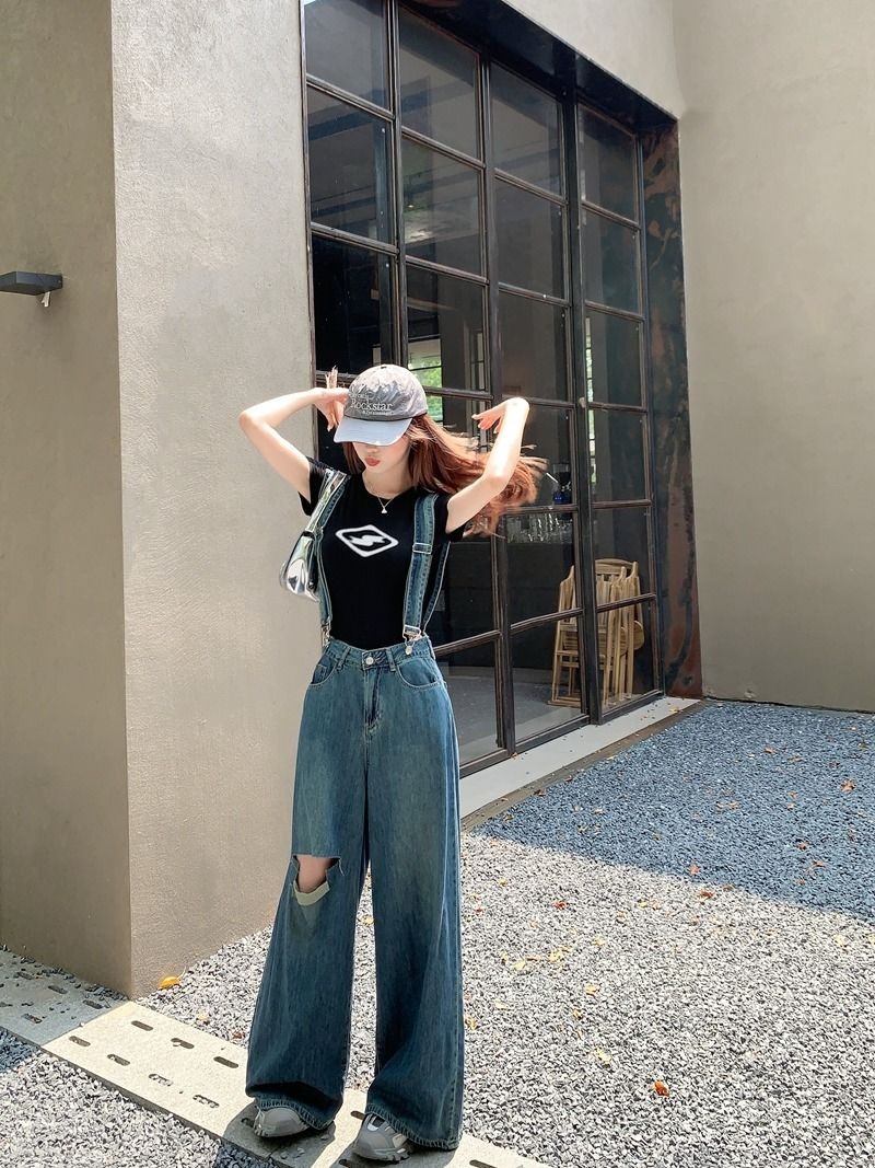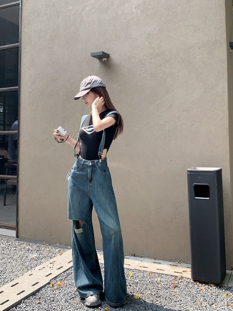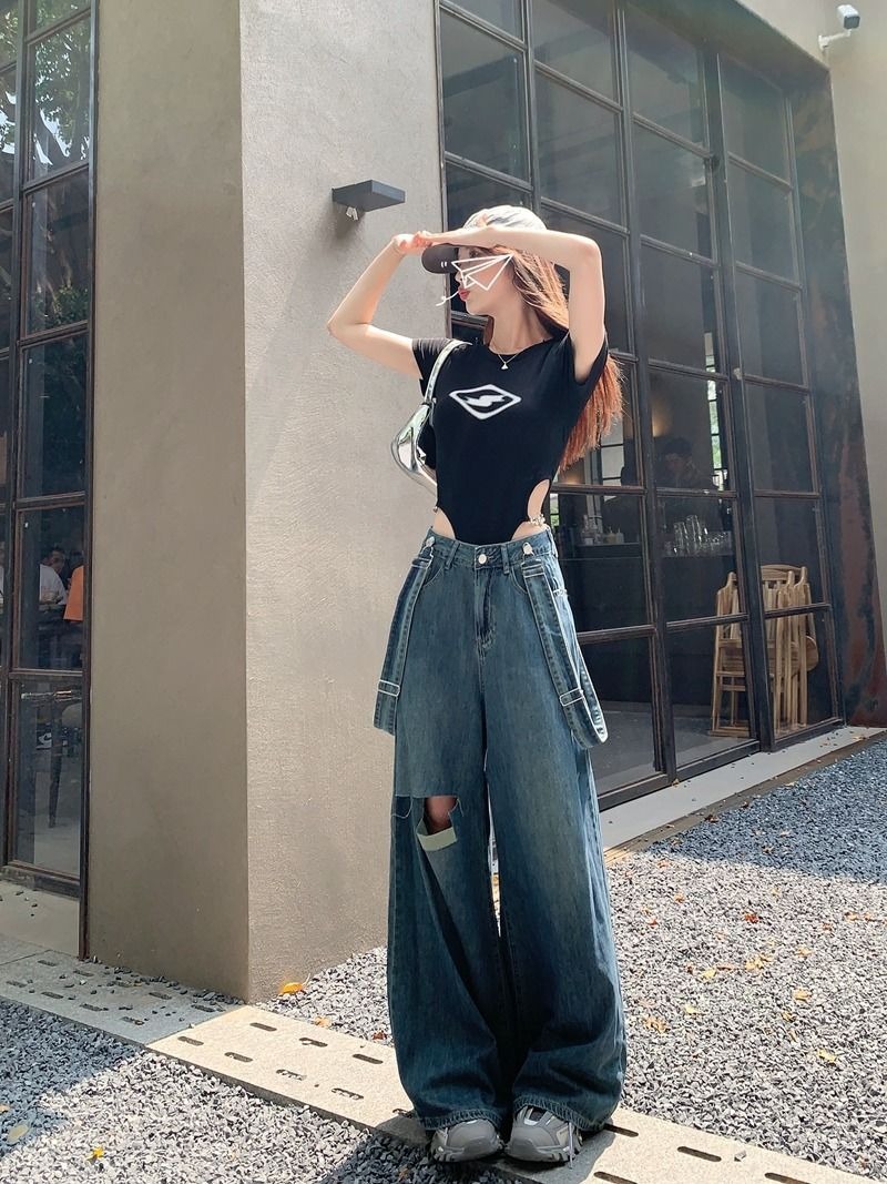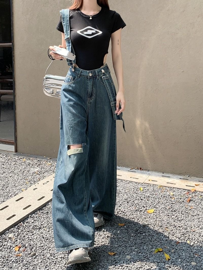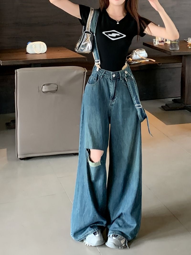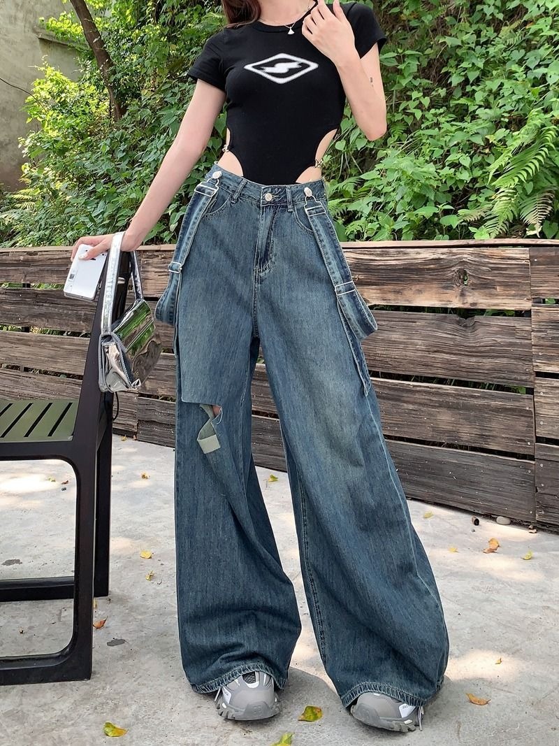 디자인 센스 틈새 스트랩 팬츠 여성의 여름 찢어진 청바지 느슨한 넓은 다리 바지 높은 허리 스트레이트 바지스토어 가기