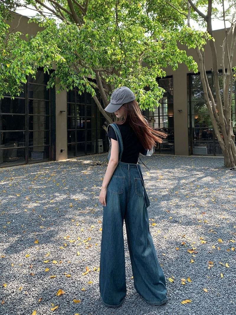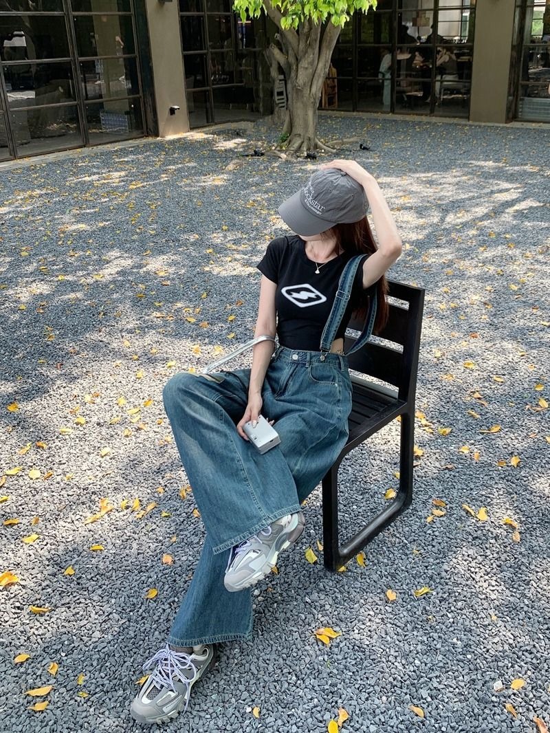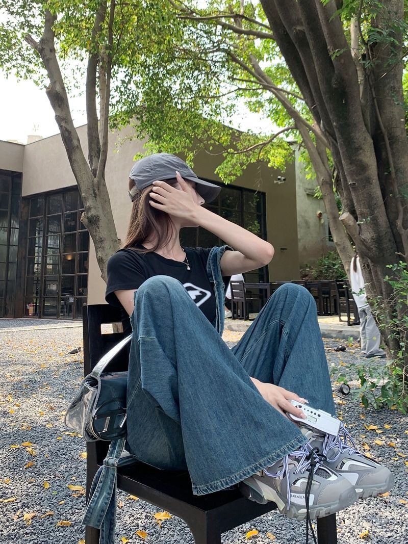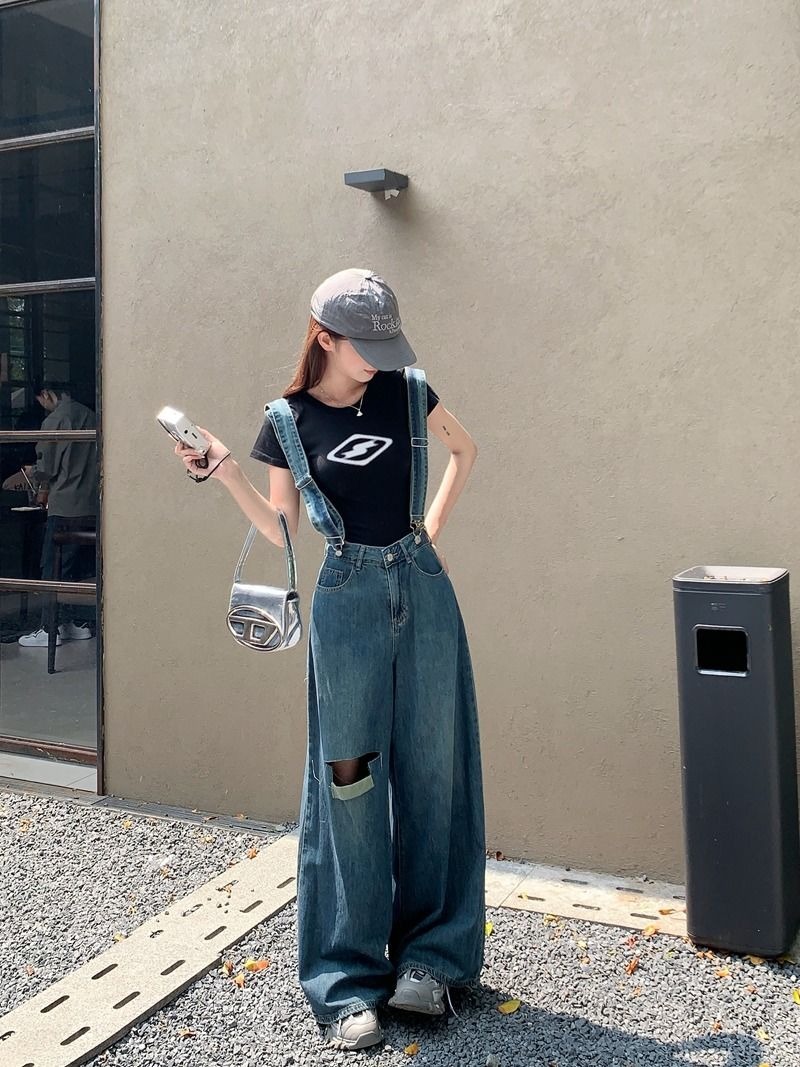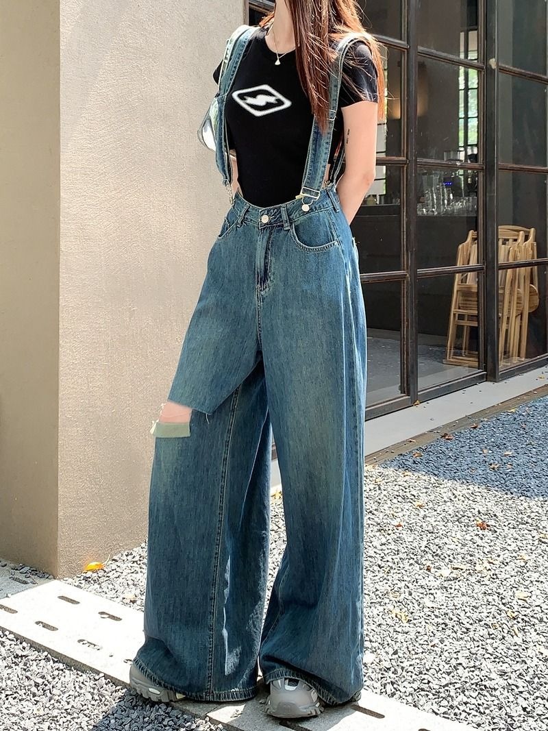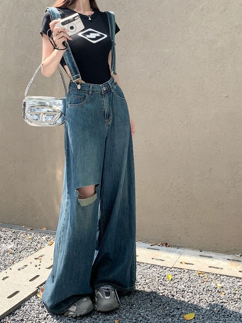 디자인 센스 틈새 스트랩 팬츠 여성의 여름 찢어진 청바지 느슨한 넓은 다리 바지 높은 허리 스트레이트 바지스토어 가기