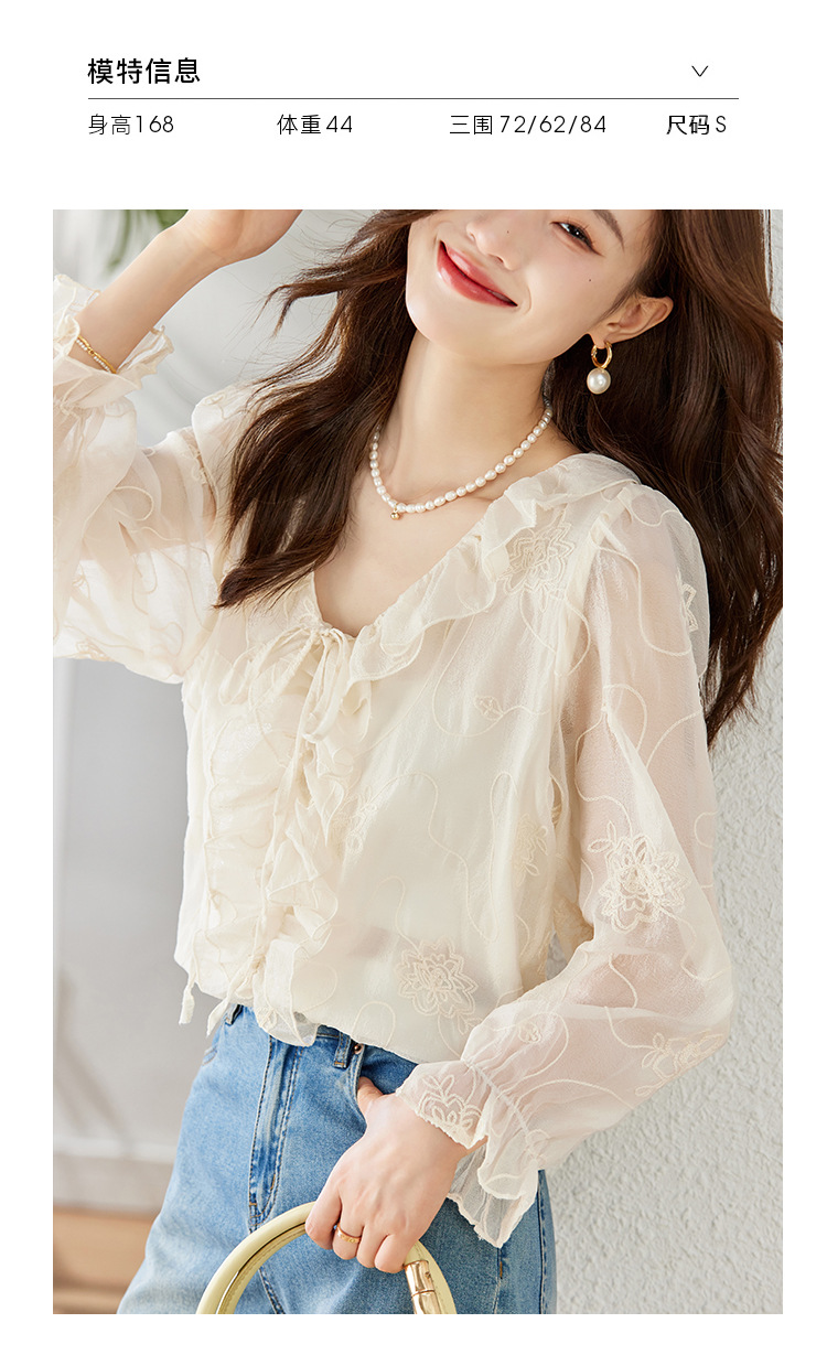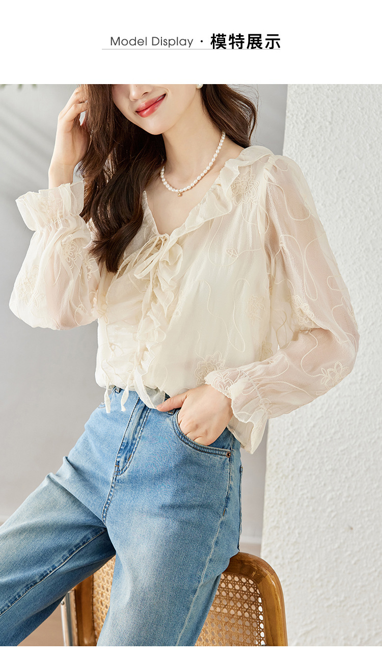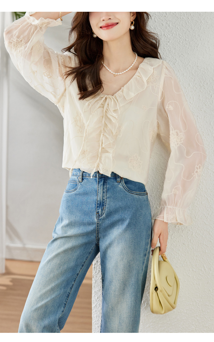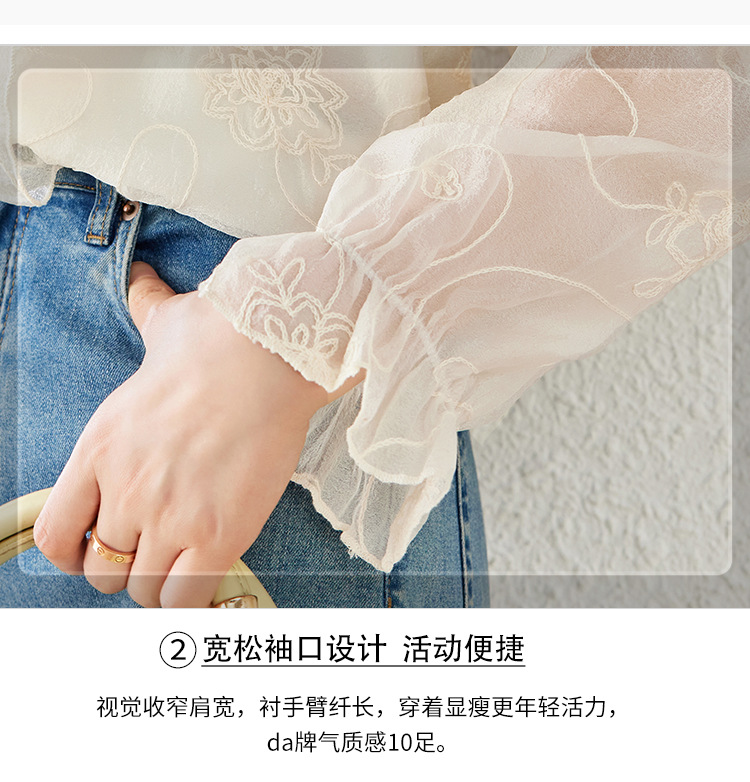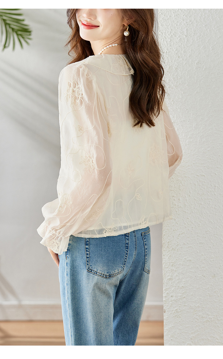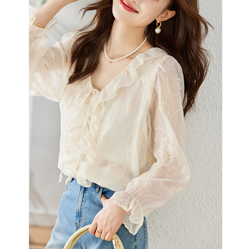 진짜 샷 2023 가을 새로운 한국 셔츠 달콤한 긴 소매 쉬폰 수 놓은 주름 셔츠 디자인 감각스토어 가기