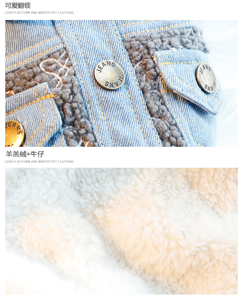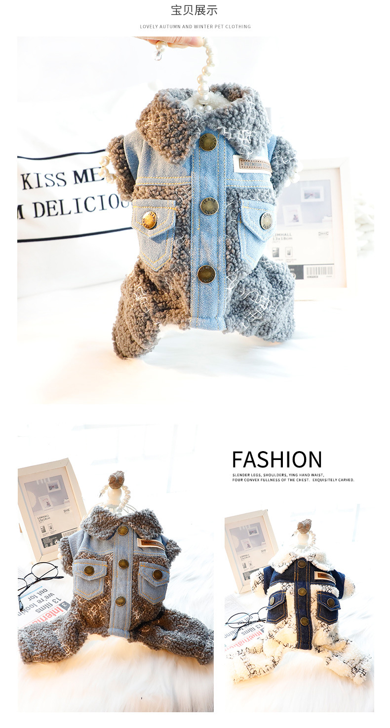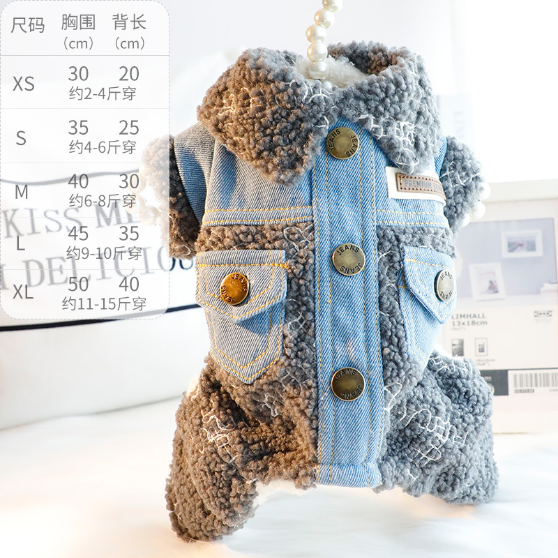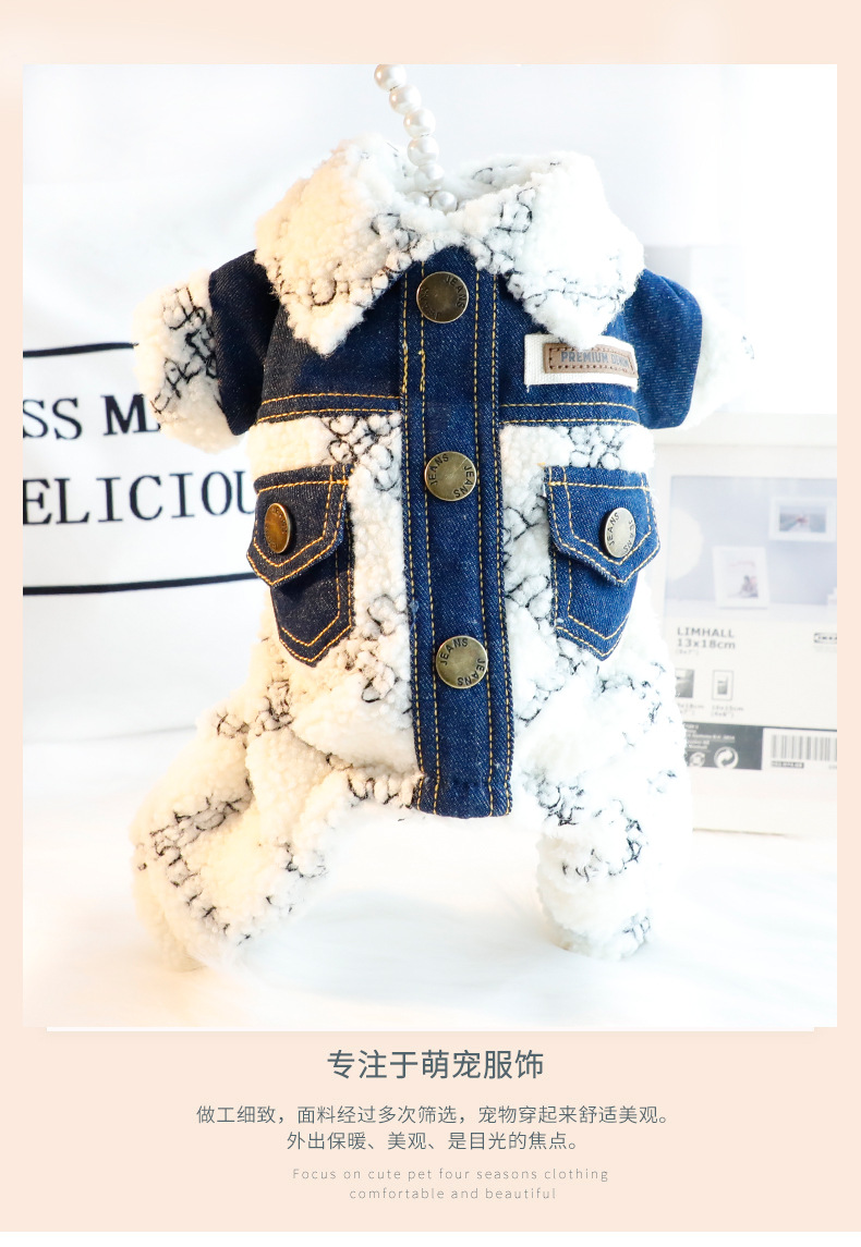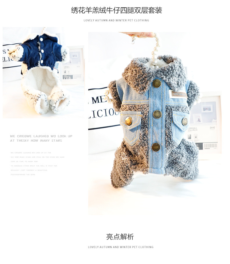 개 옷 가을과 겨울 두꺼운 양고기 벨벳 데님 수 놓은 네 다리 기모 따뜻한 작은 개 테디 애완 동물 4788