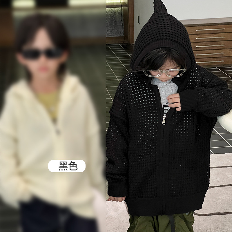 어린이 중공 니트 가디건 봄 한국 스타일 유행 중대형 어린이 후드 지퍼 셔츠 소년 솔리드 컬러 메쉬 재킷