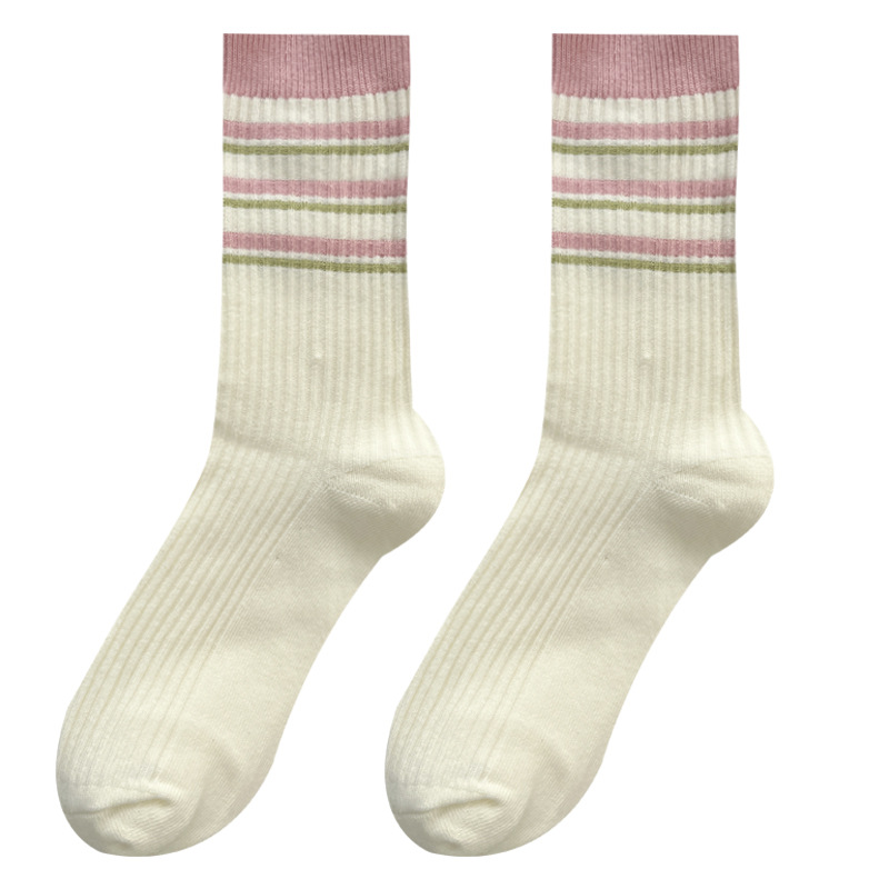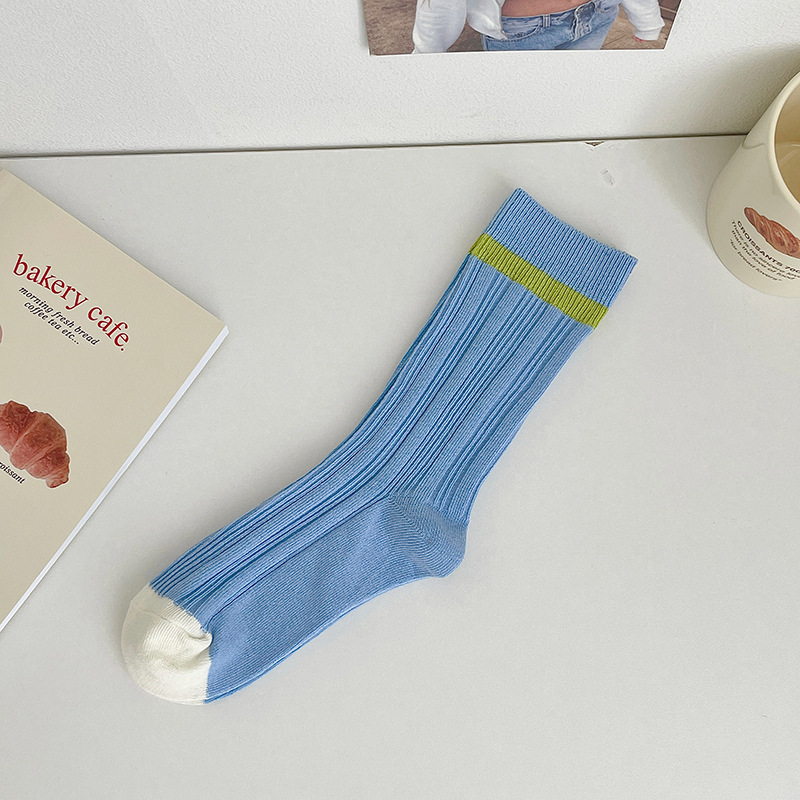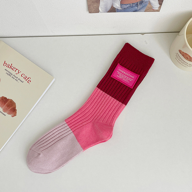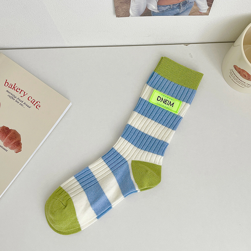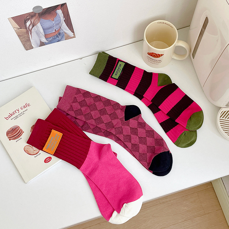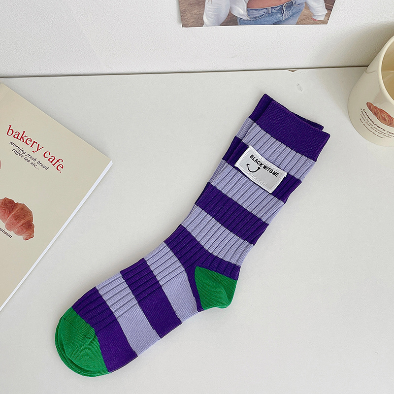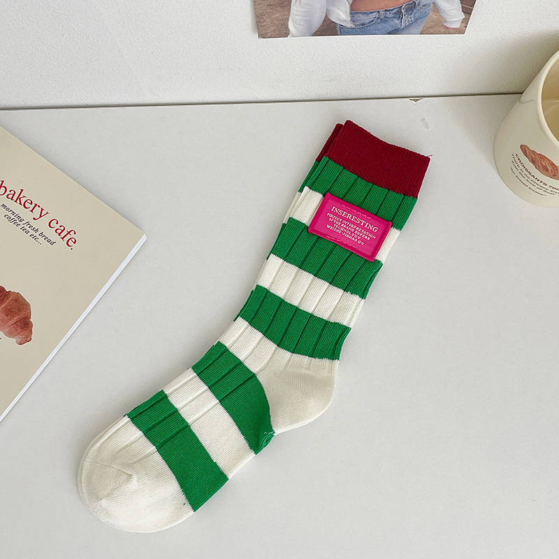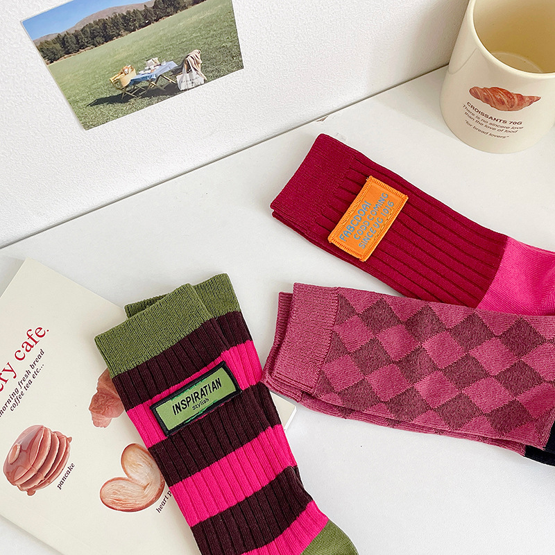 도파민 양말 여성용 중간 배럴 대조 색상 일본 스타일 유행 양말 봄과 가을 천 라벨 줄무늬 한국식 스택 양말 스타킹스토어 가기