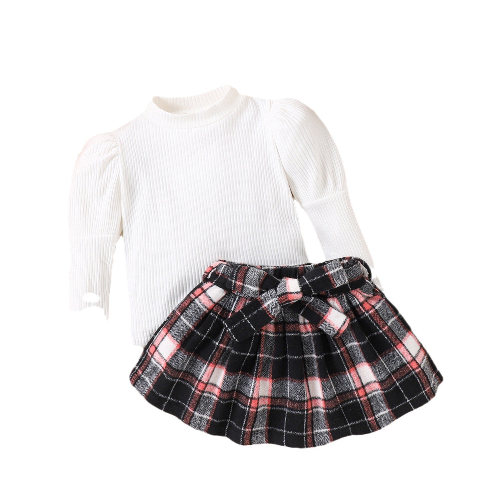 Baopin 어린이 착용 유럽과 미국 가을과 겨울 핏 스트립 격자 무늬 짧은 스커트 벨트 모자 포장 세트 긴 소매 탑