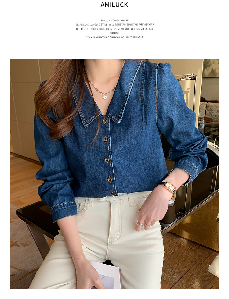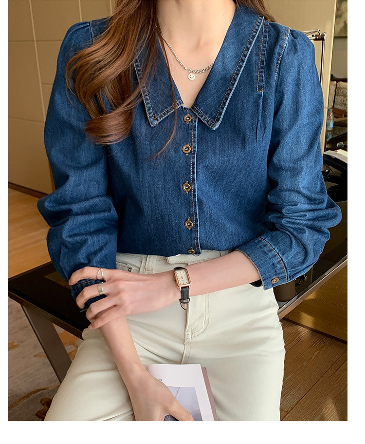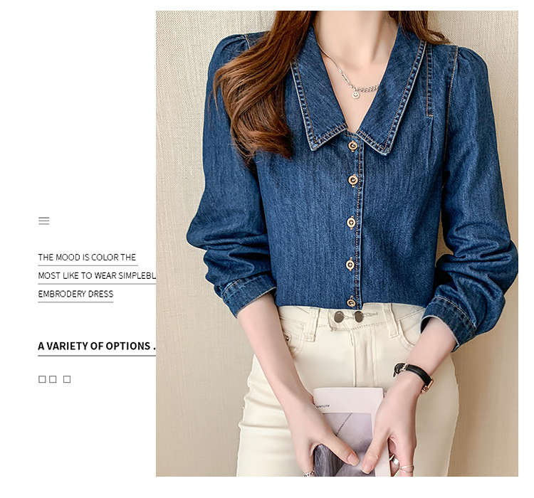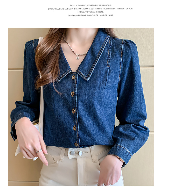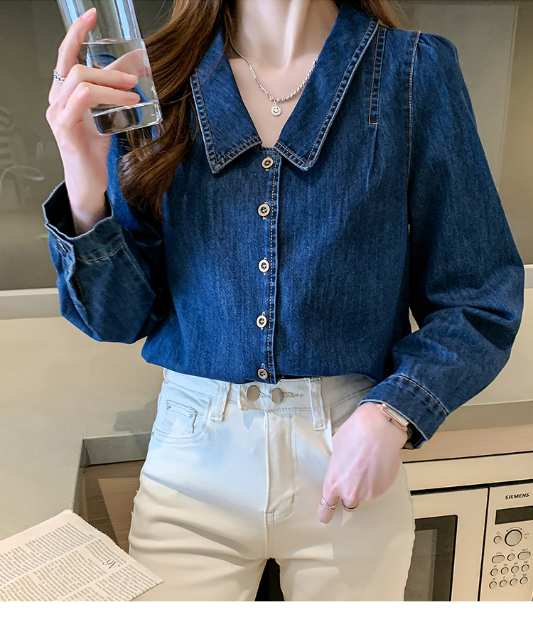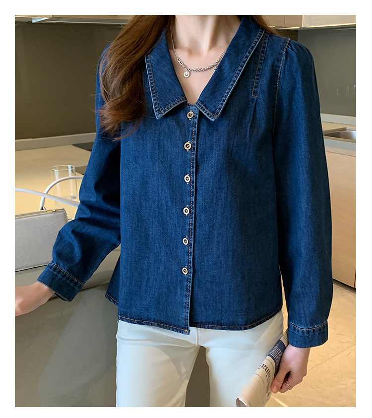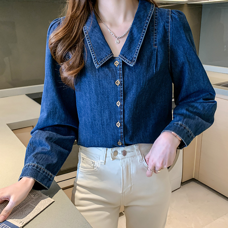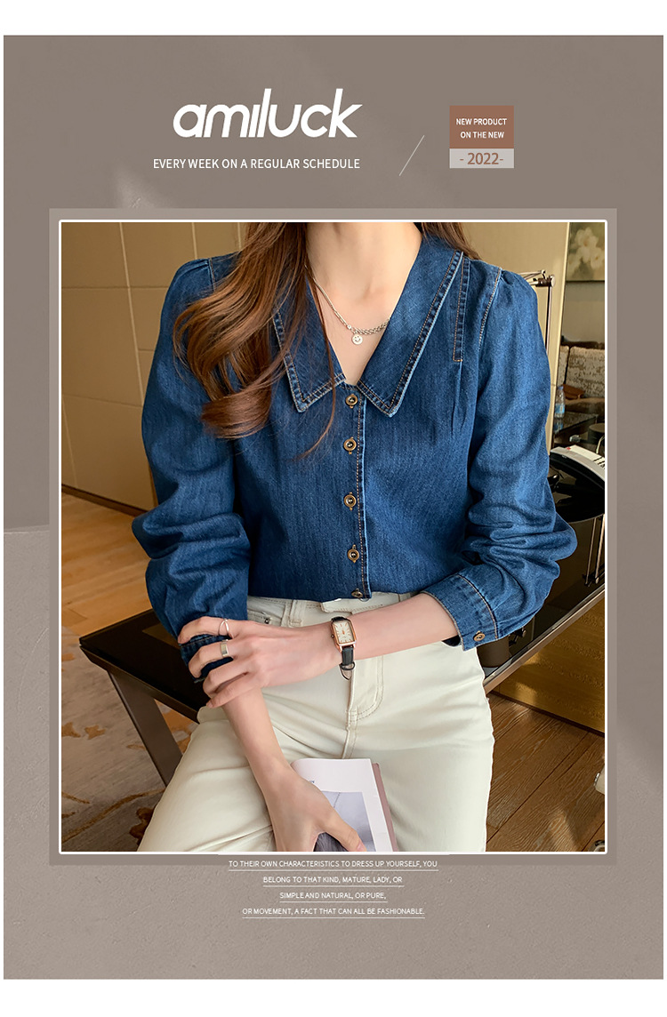 리얼 샷 클래식 복고풍 틈새 데님 셔츠 여성의 디자인 감각 2022 봄과 가을 뾰족한 칼라 긴 소매 느슨한 짧은 셔츠스토어 가기