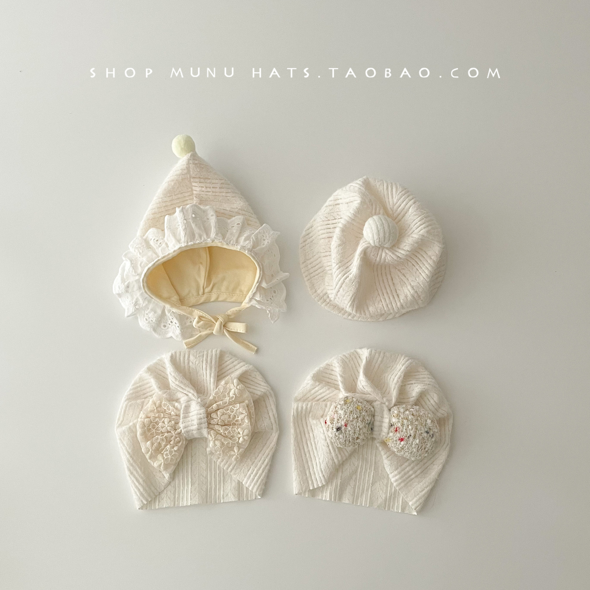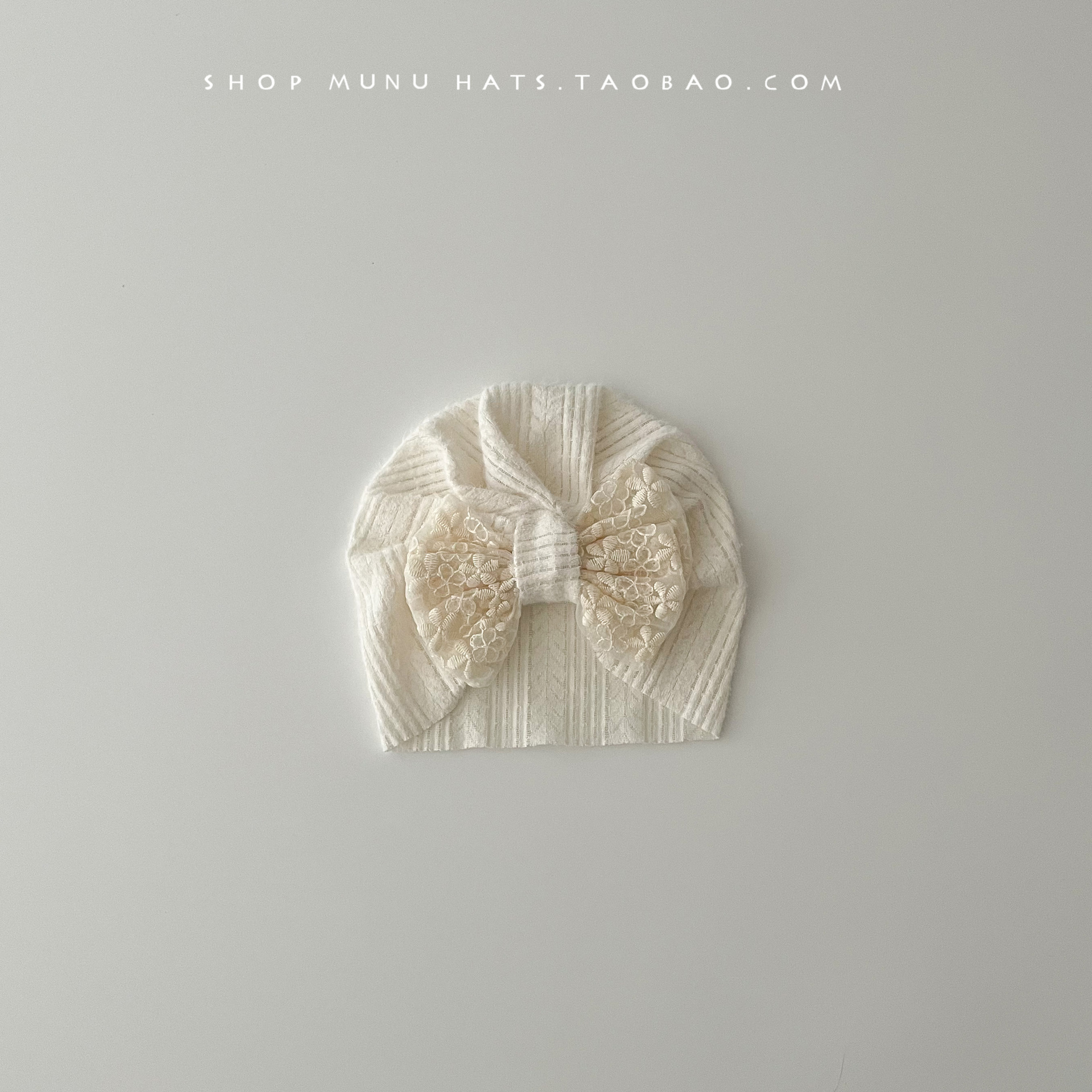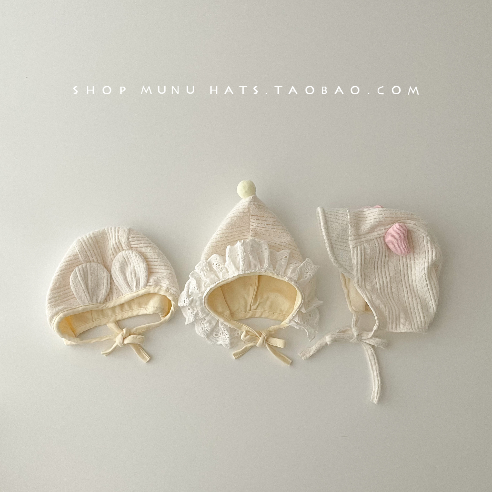 아기 모자 봄과 가을 한국 크림 화이트 레이스 스트랩 모자 아기 귀 보호 모자 신생아 인도 모자 태아 모자
