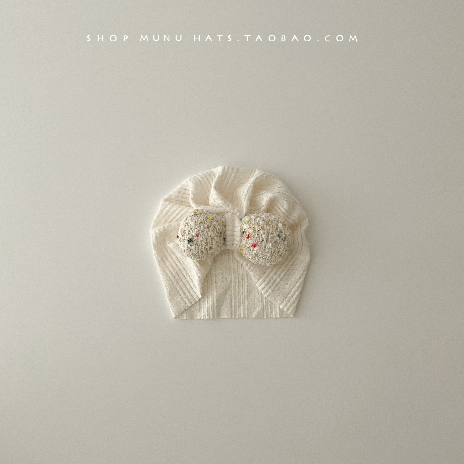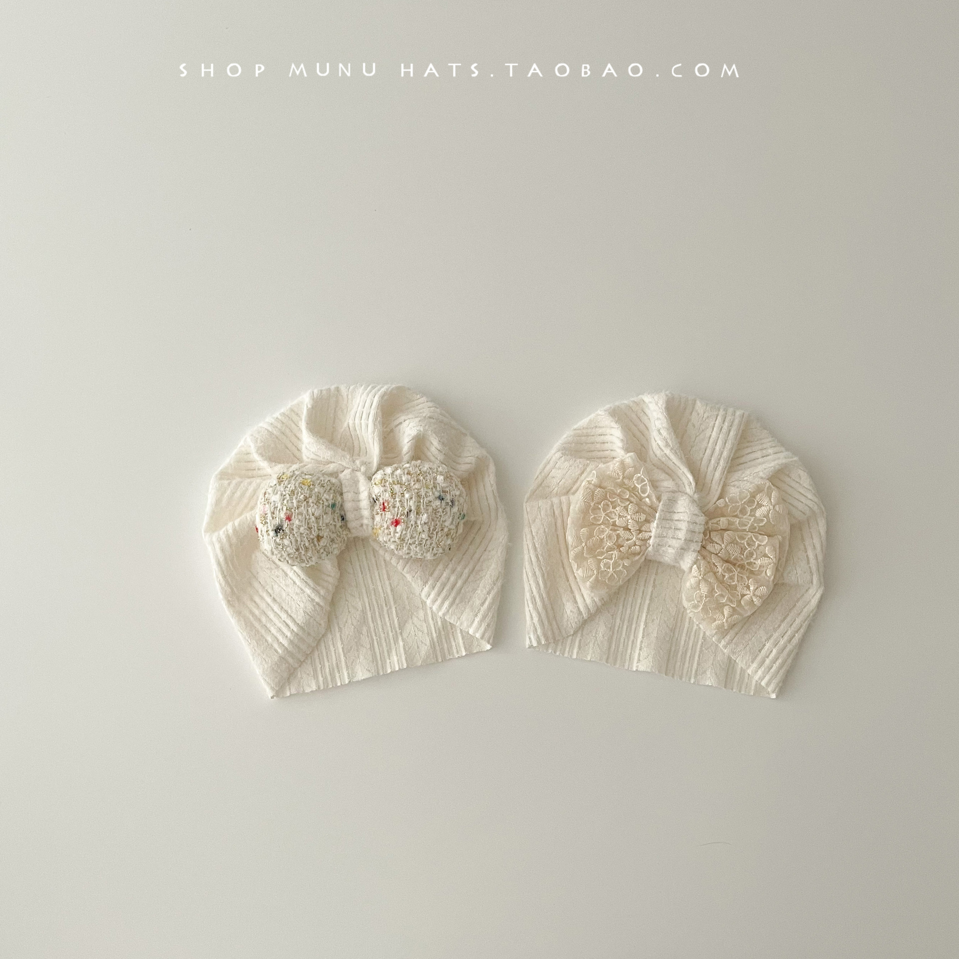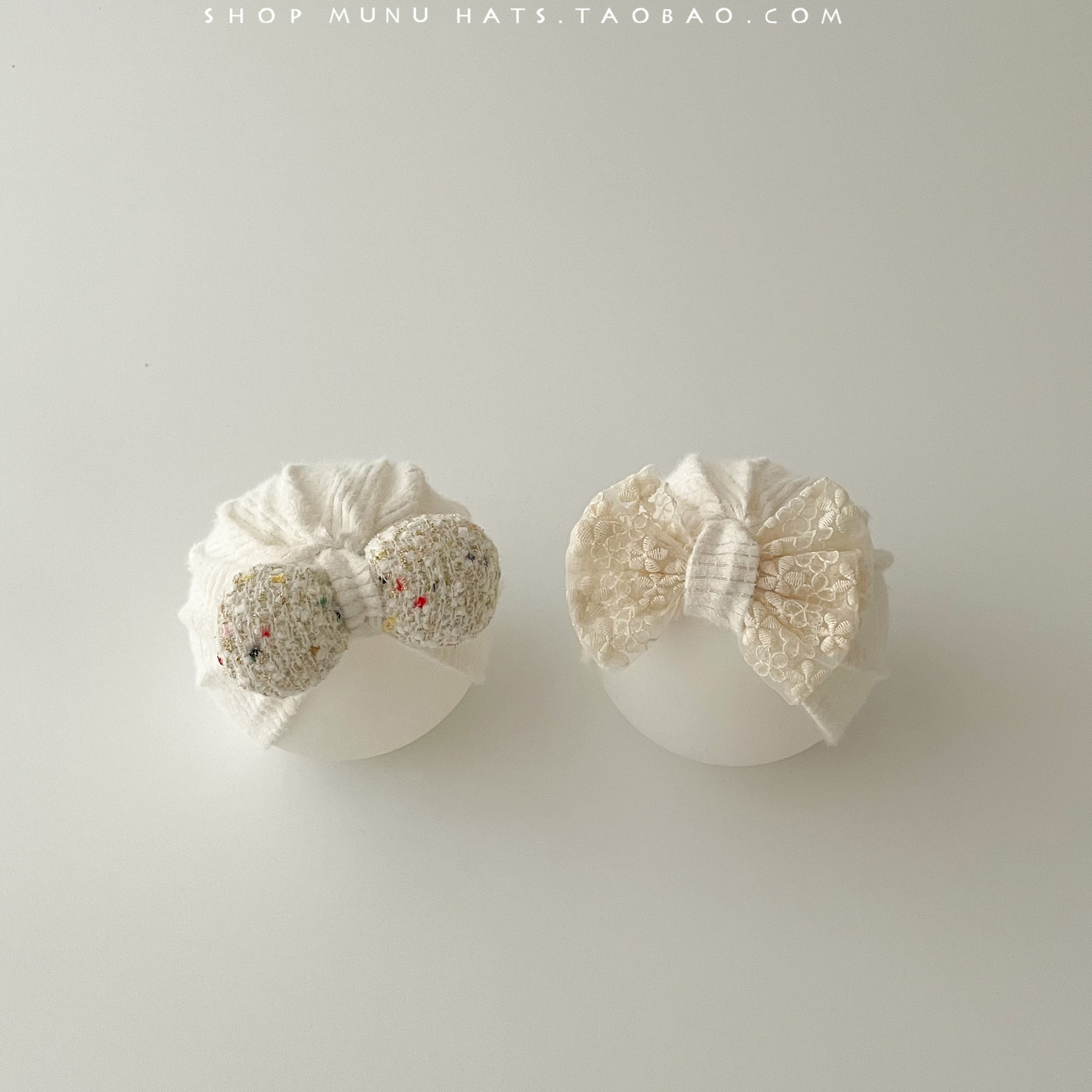아기 모자 봄과 가을 한국 크림 화이트 레이스 스트랩 모자 아기 귀 보호 모자 신생아 인도 모자 태아 모자