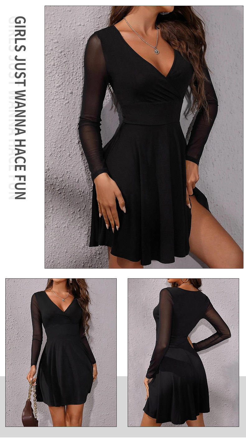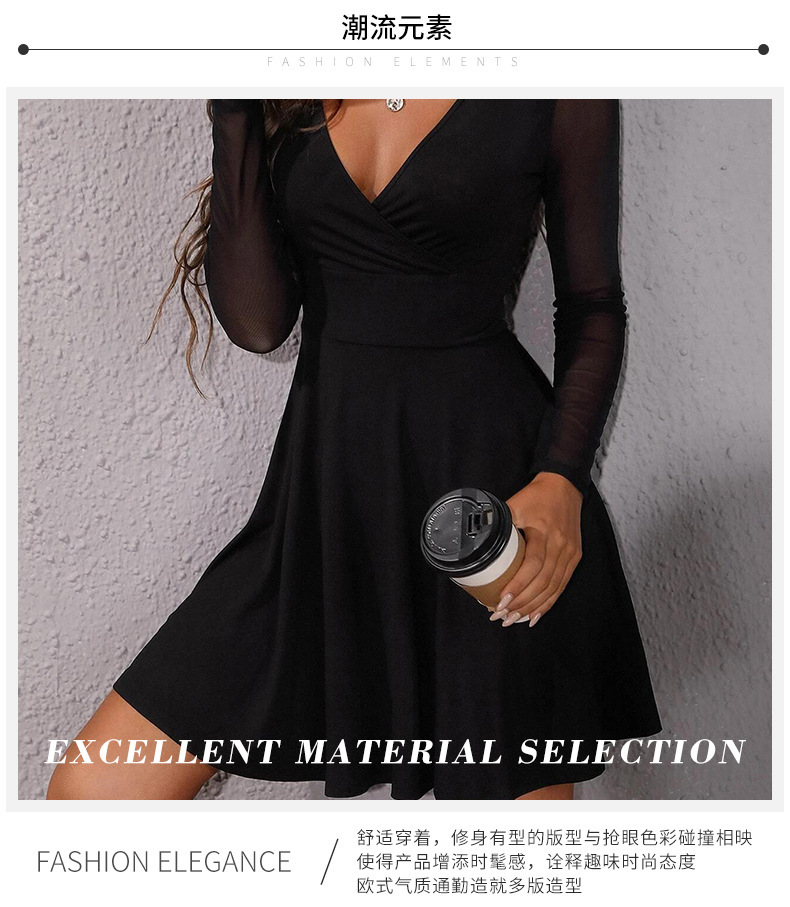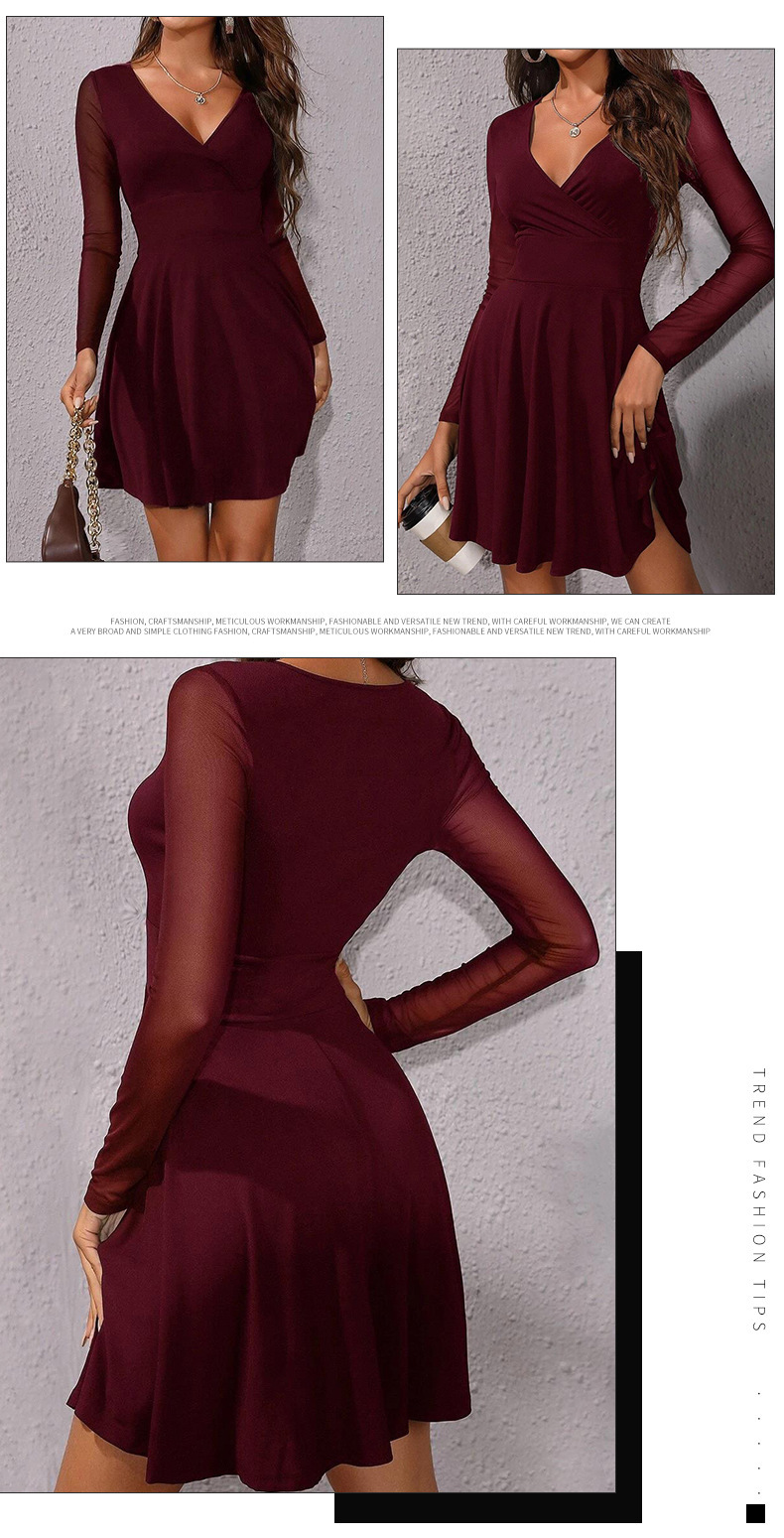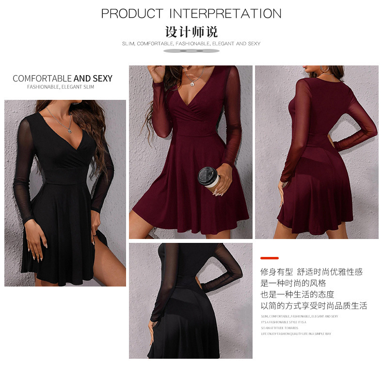 공장 공급 AliExpress 아마존 대외 무역 여성 슬림 핏 긴 소매 스티칭 메쉬 원피스 기질 원피스스토어 가기