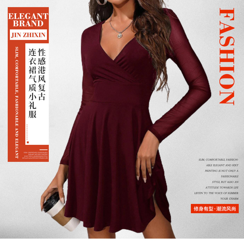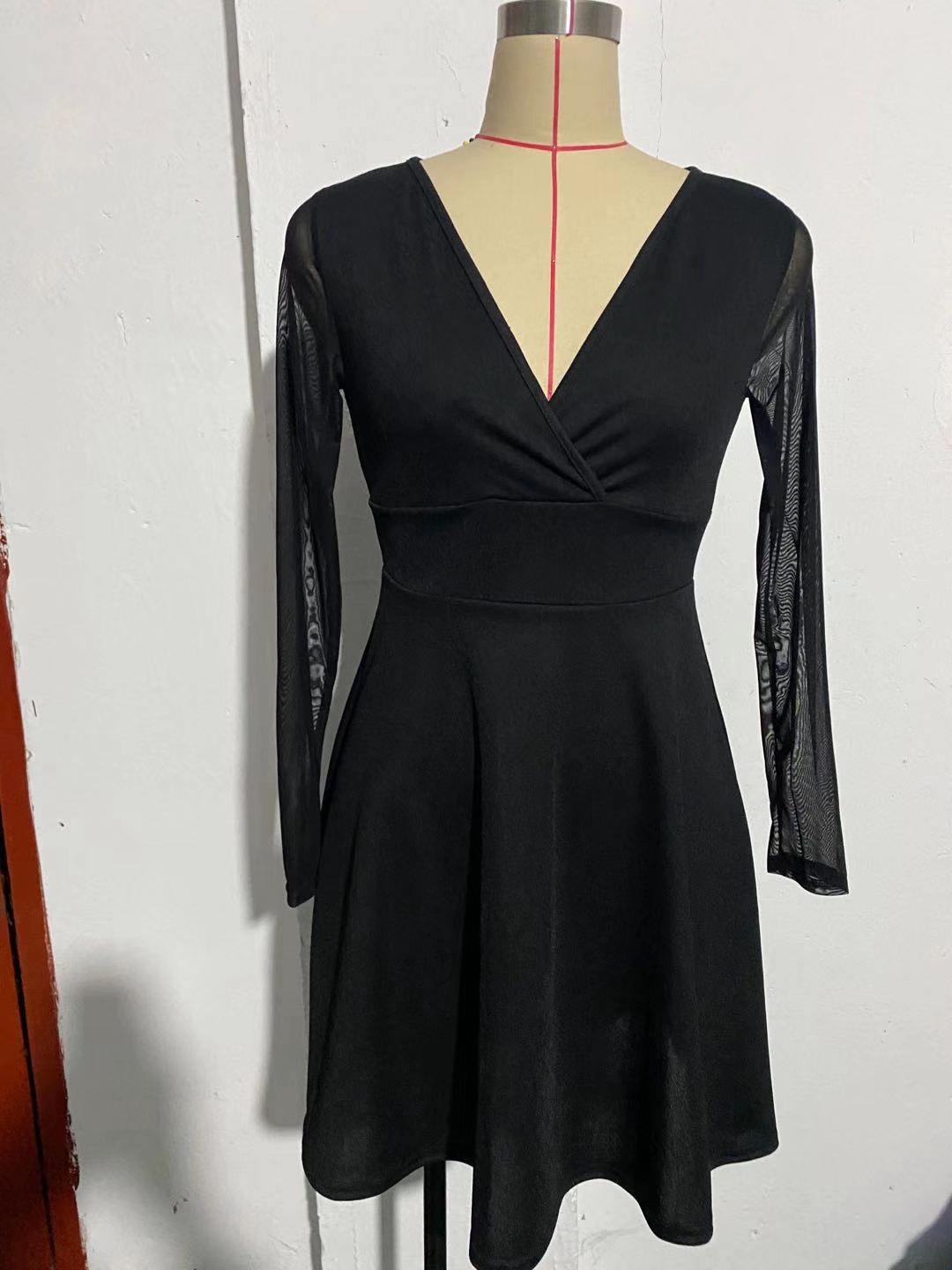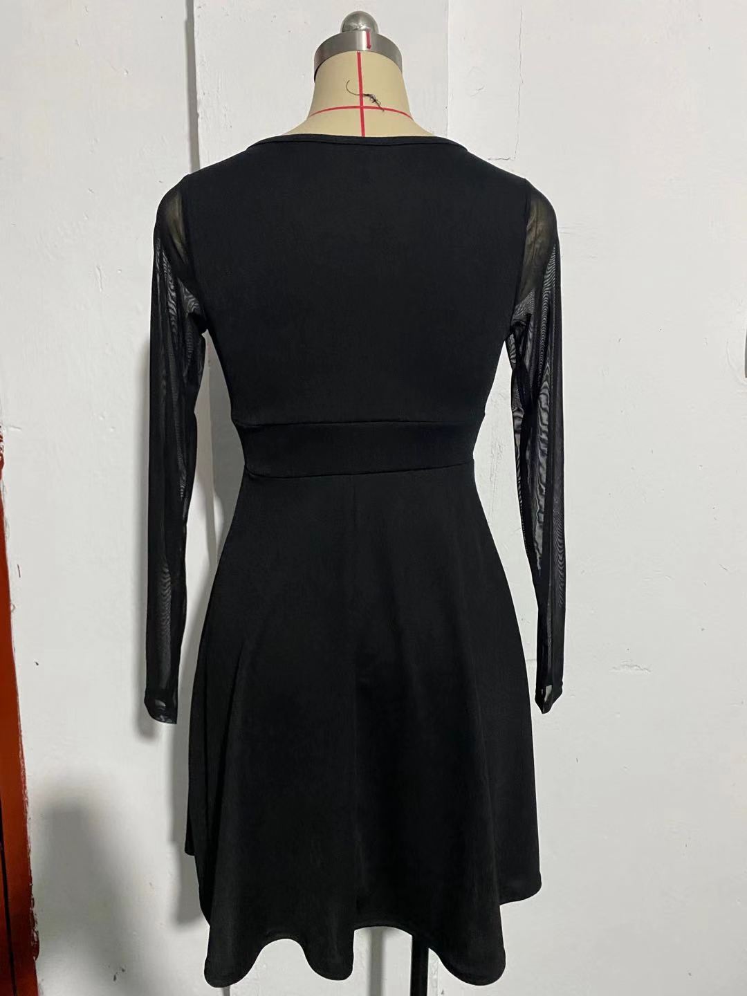 공장 공급 AliExpress 아마존 대외 무역 여성 슬림 핏 긴 소매 스티칭 메쉬 원피스 기질 원피스스토어 가기