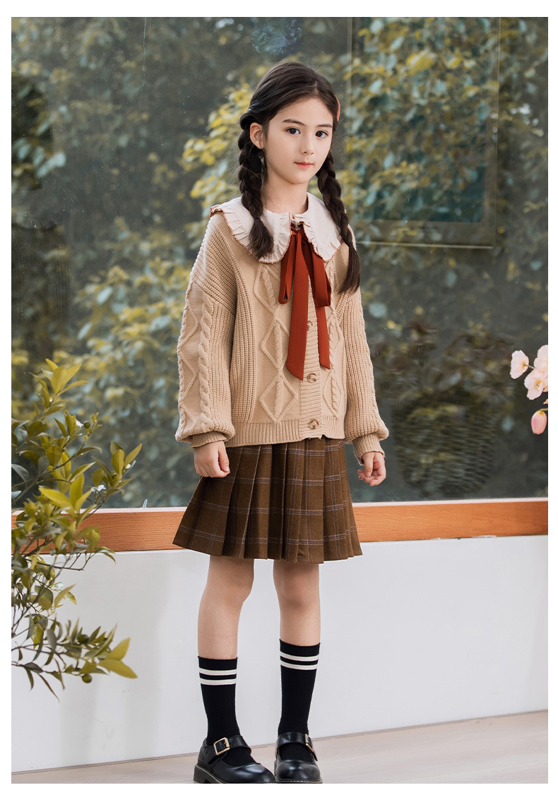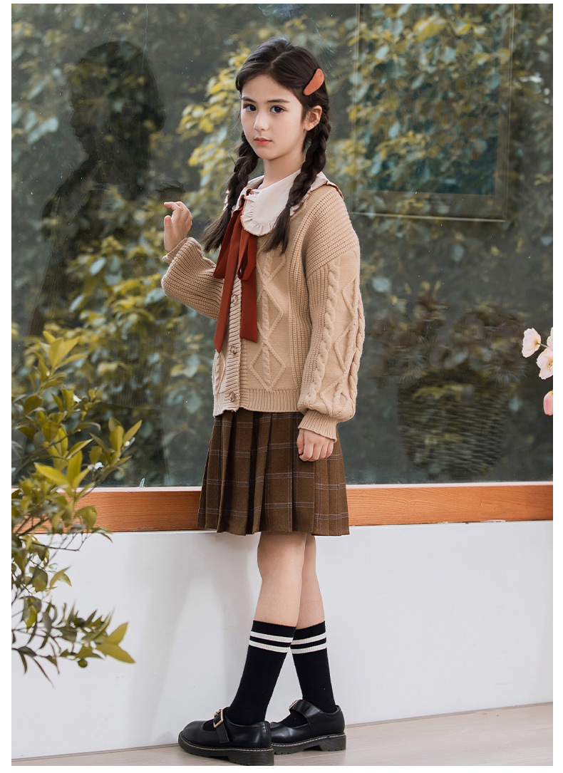 女童毛衣套装2024春秋季新款中大童开衫外套衬衫百褶裙童装三件套