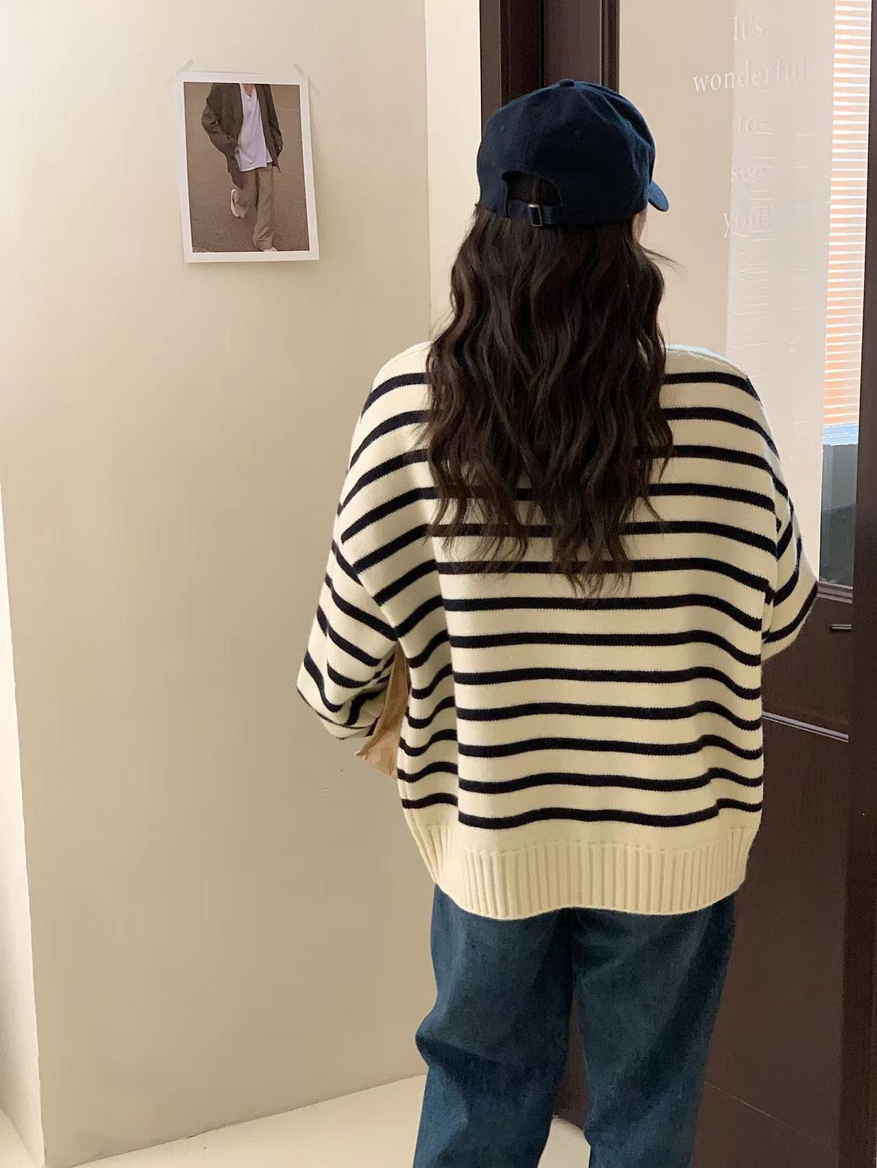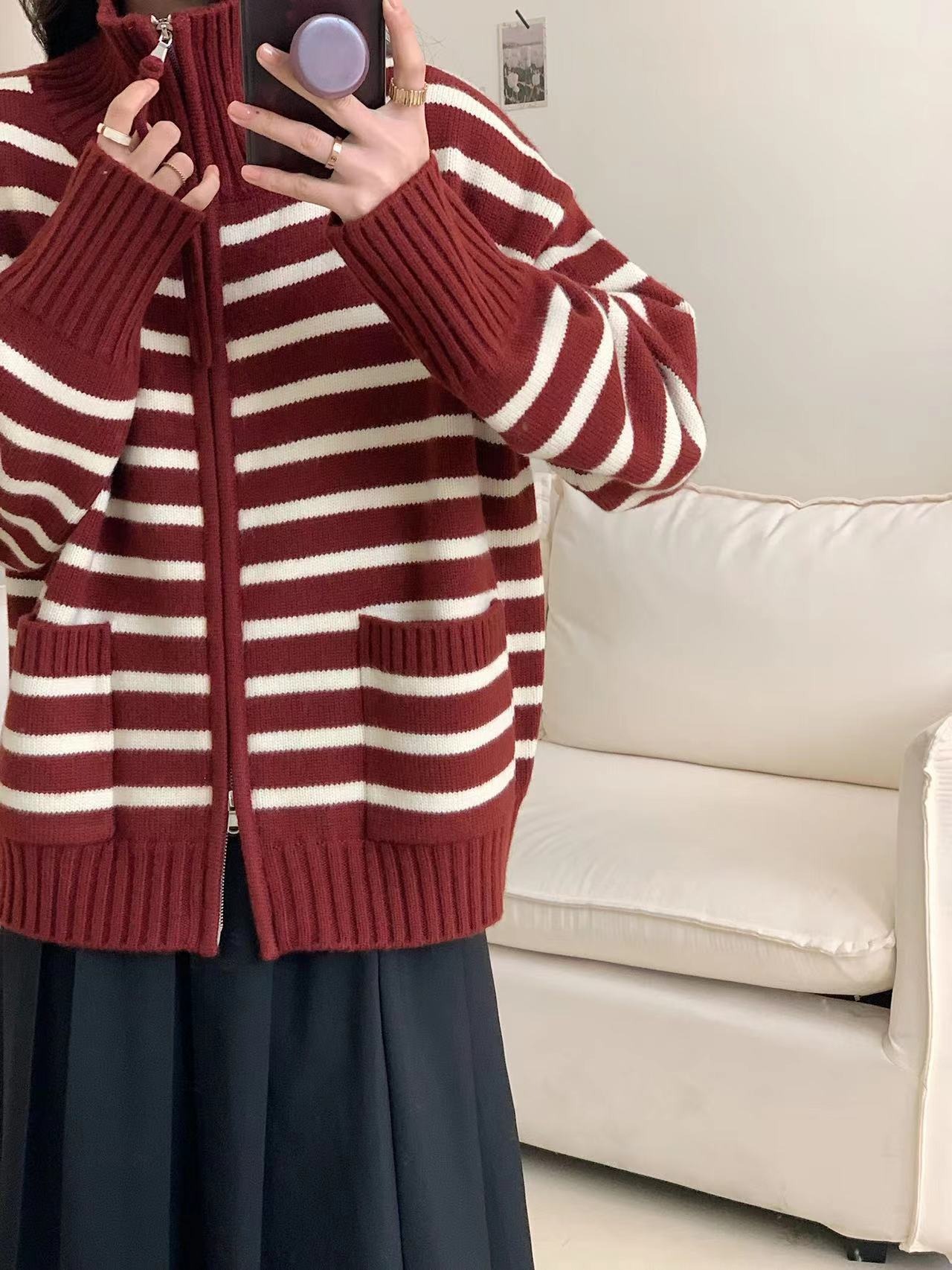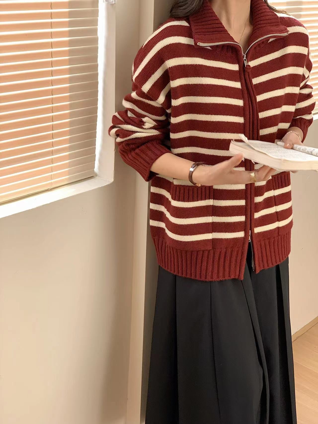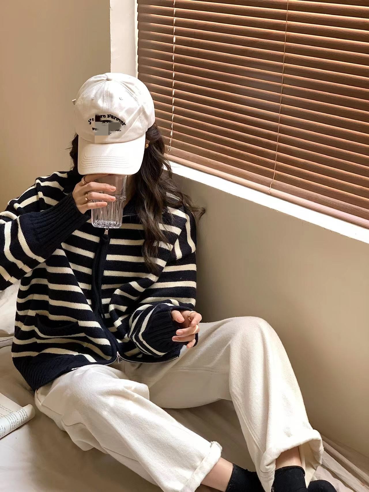 가을과 겨울 2023 여성을위한 한국식 옷깃 스트라이프 더블 지퍼 니트 카디건 새로운 느슨한 다목적 슬리밍 스웨터 코트스토어 가기