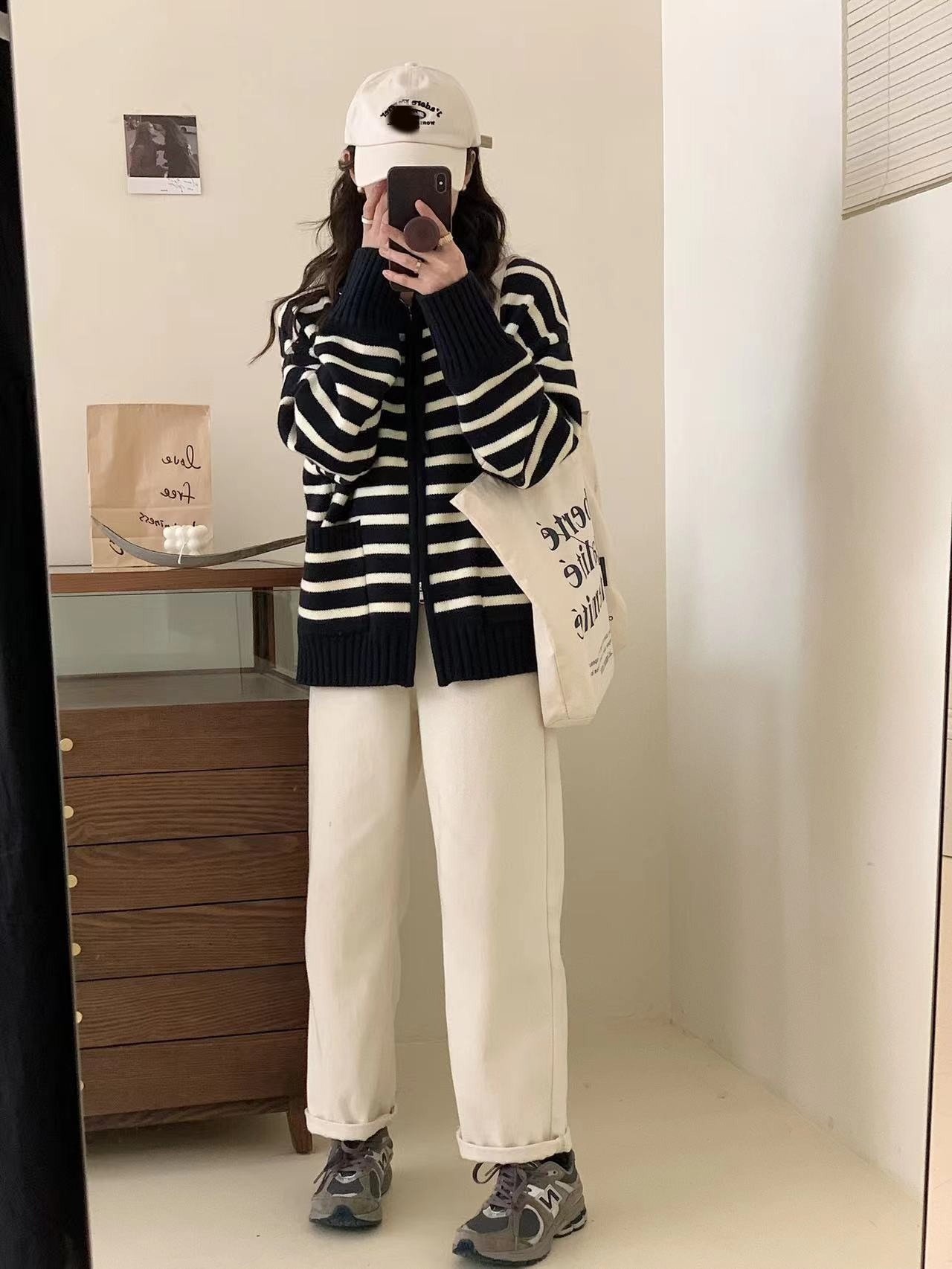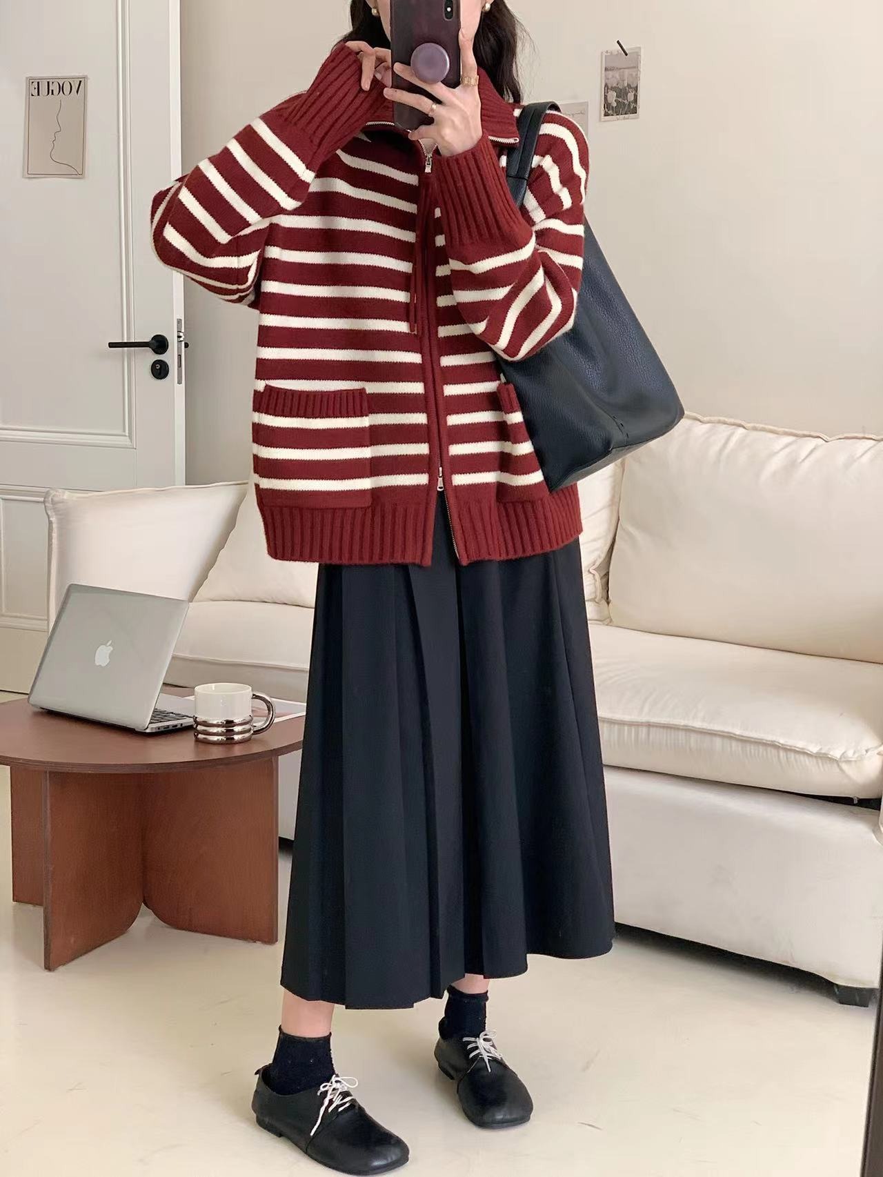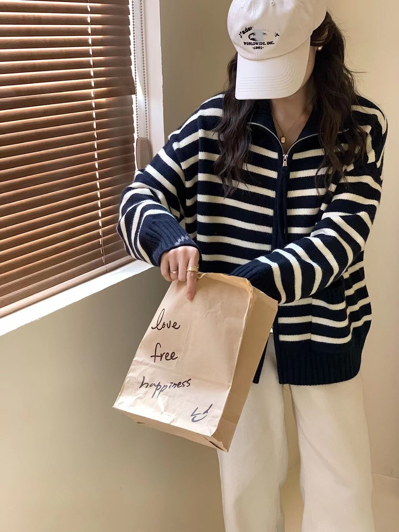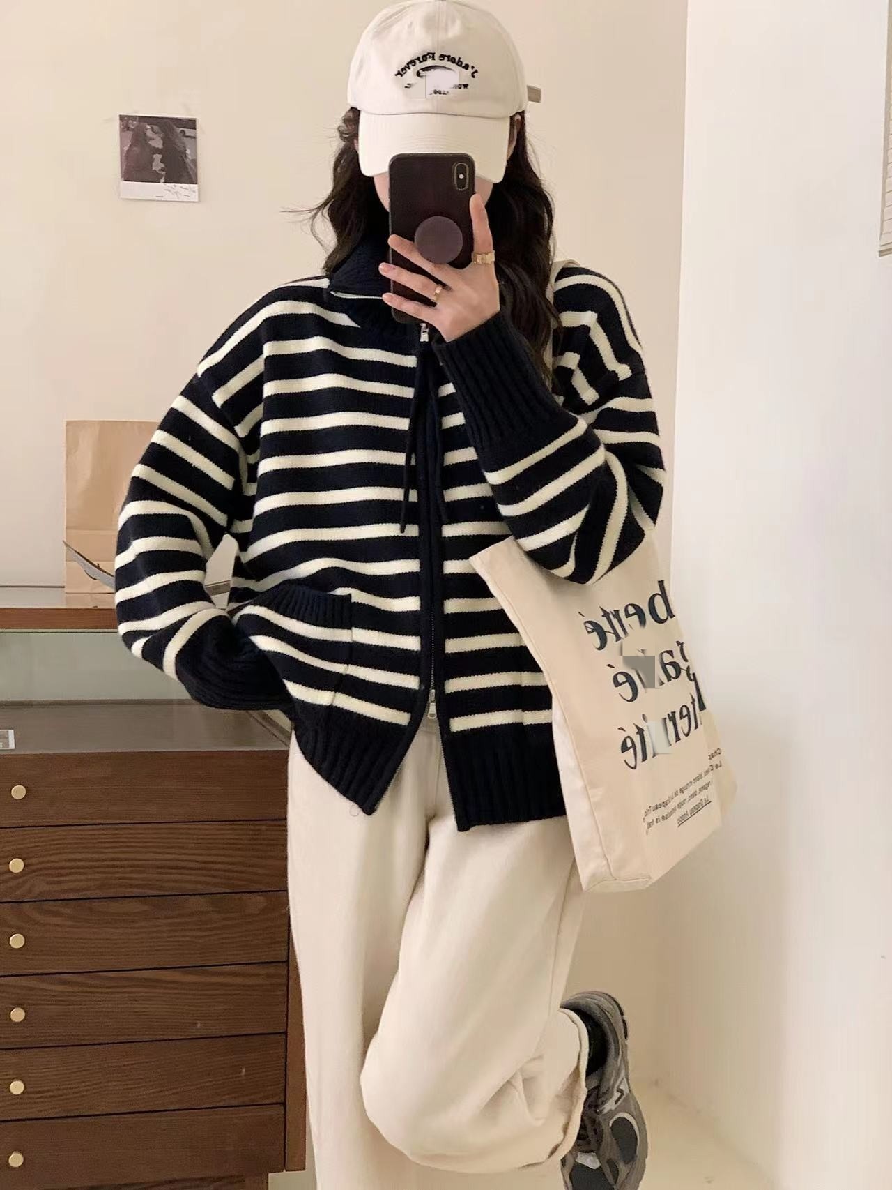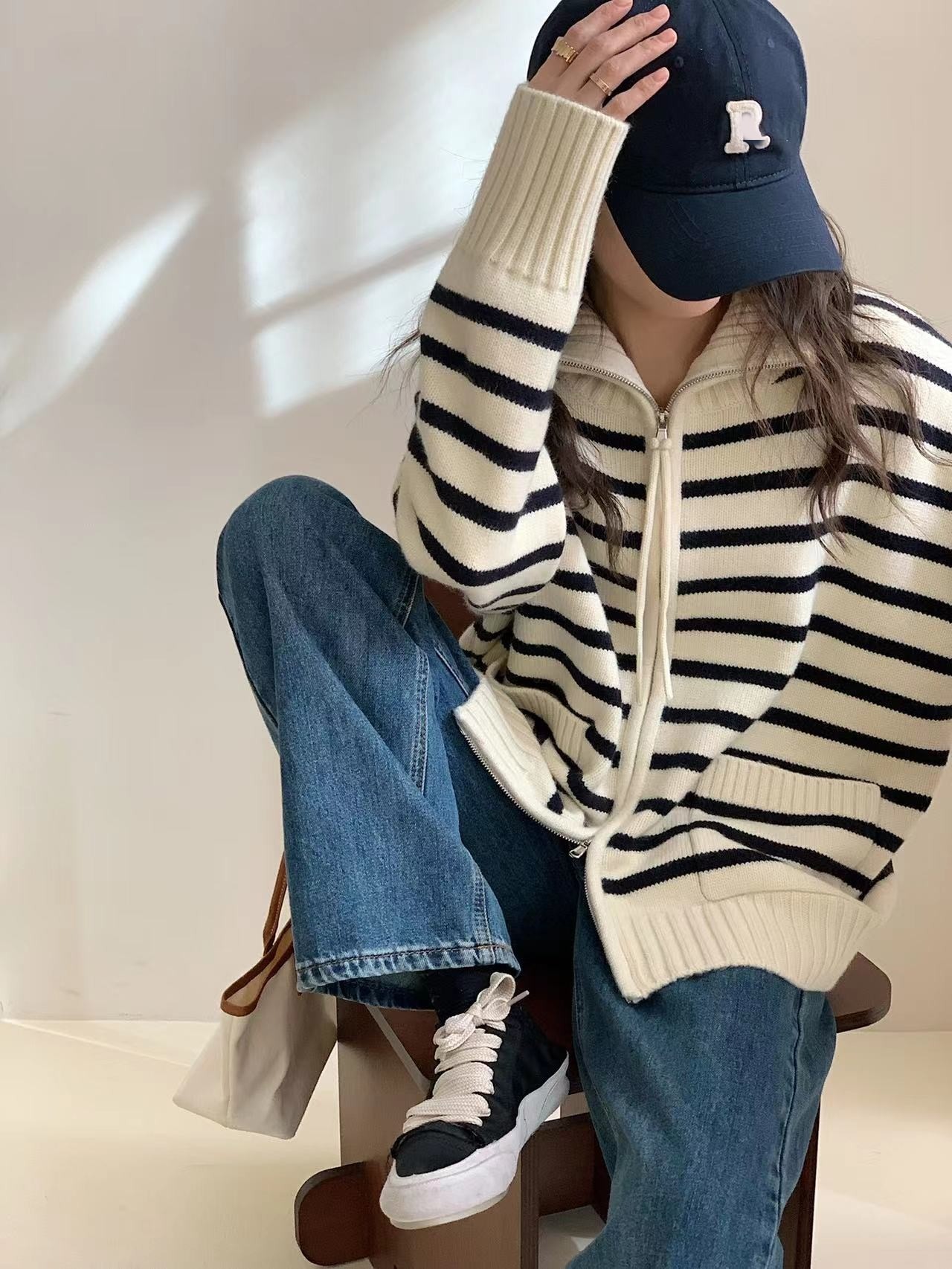 가을과 겨울 2023 여성을위한 한국식 옷깃 스트라이프 더블 지퍼 니트 카디건 새로운 느슨한 다목적 슬리밍 스웨터 코트스토어 가기
