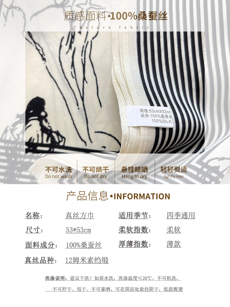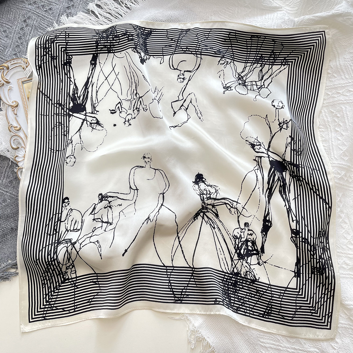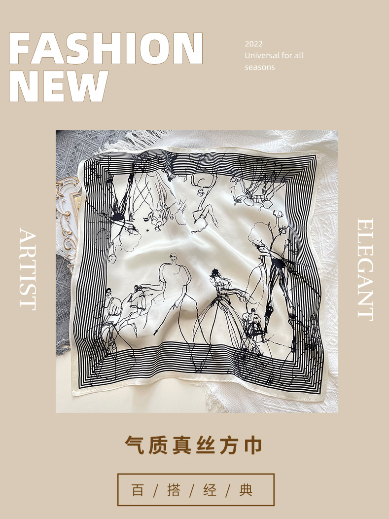 새로운 흑백 라인 미스 프린트 실크 스카프 유행 우아한 실크 53 작은 사각 스카프 틈새 장식 실크 스카프스토어 가기