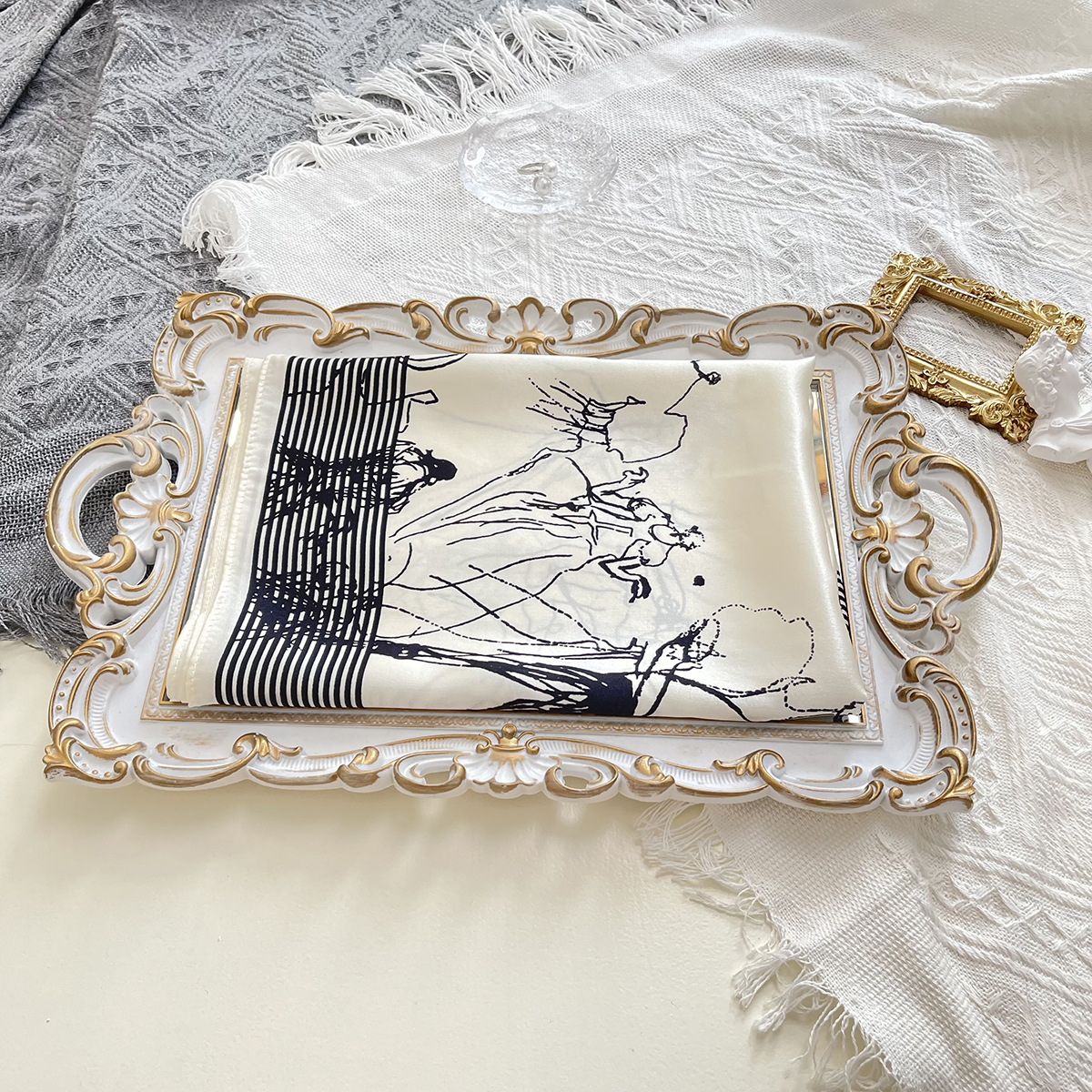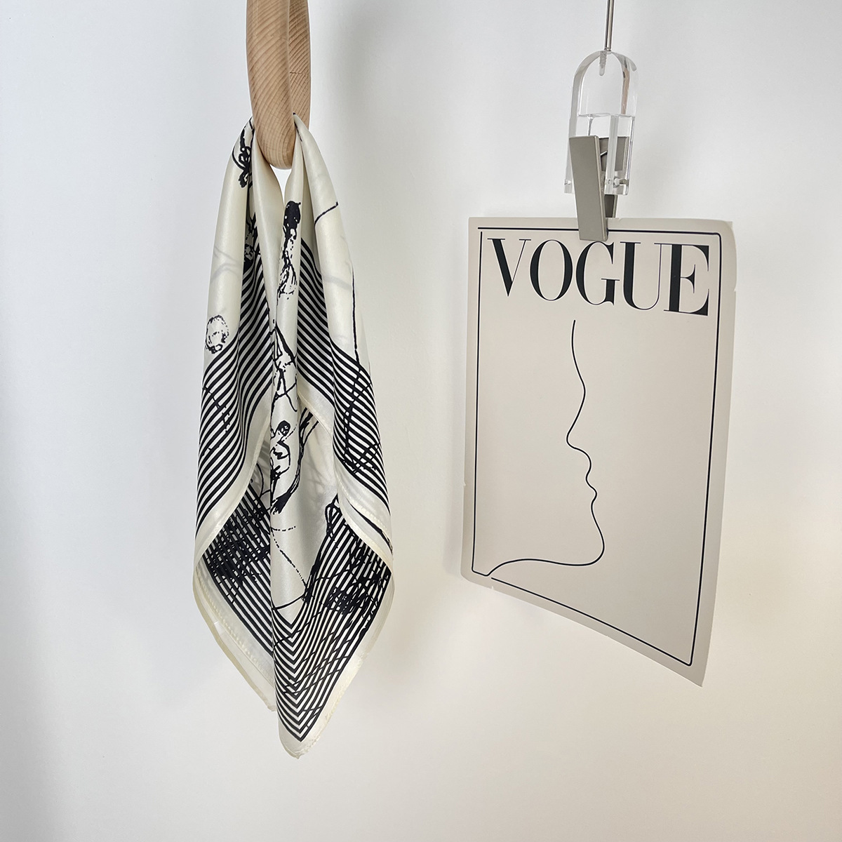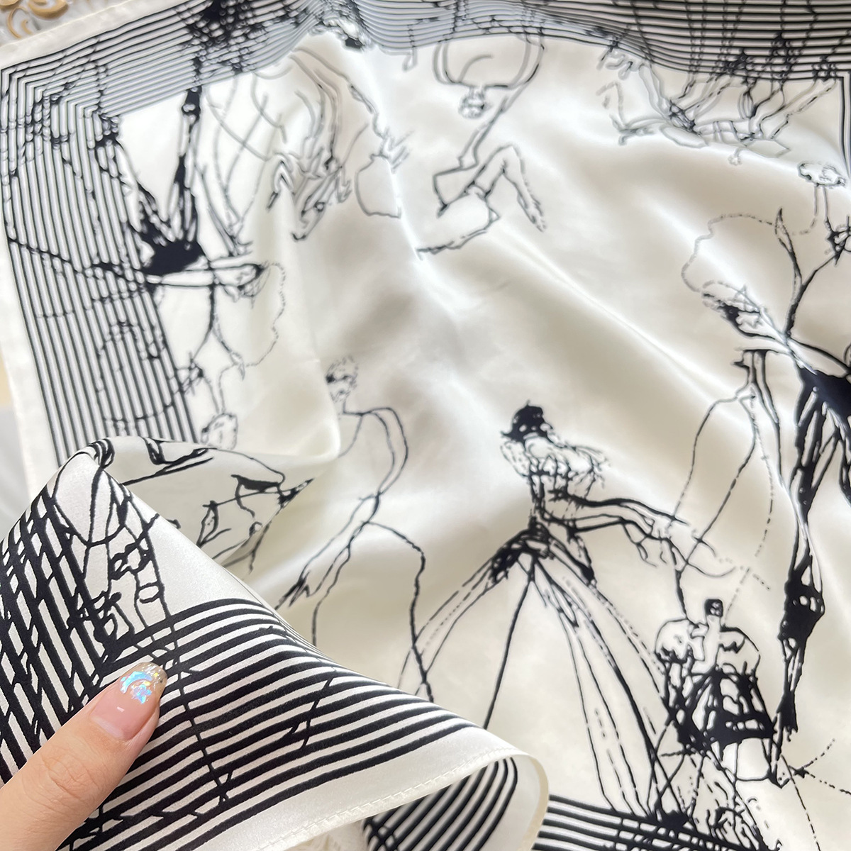 새로운 흑백 라인 미스 프린트 실크 스카프 유행 우아한 실크 53 작은 사각 스카프 틈새 장식 실크 스카프스토어 가기