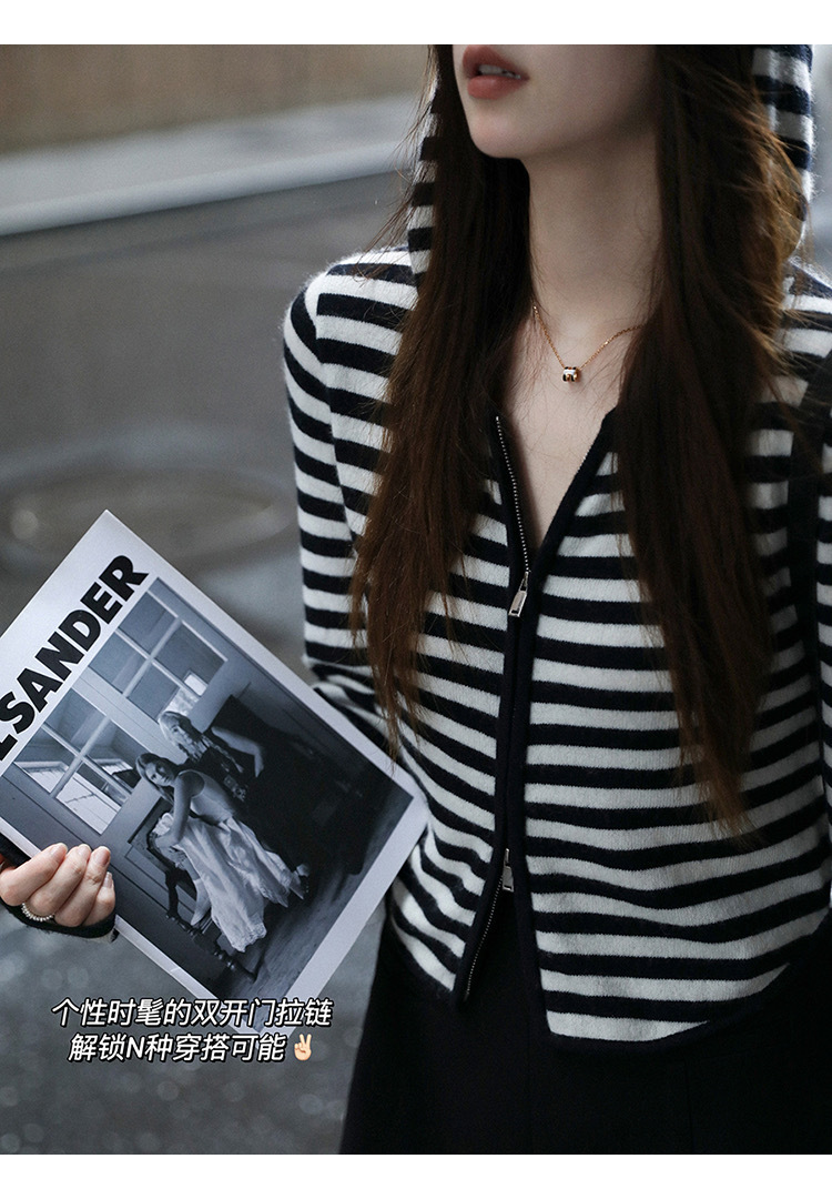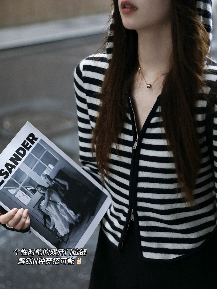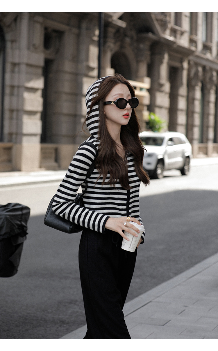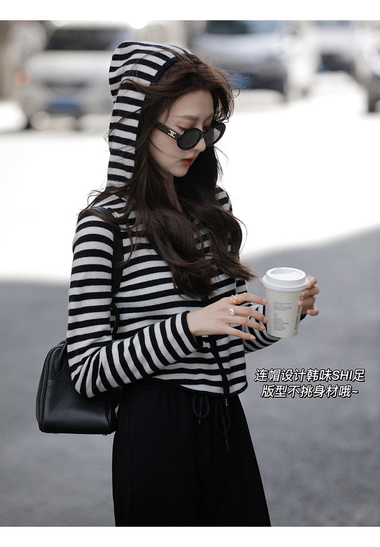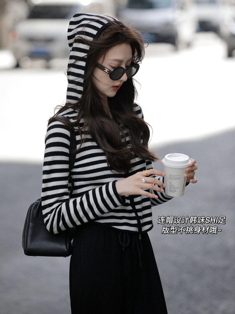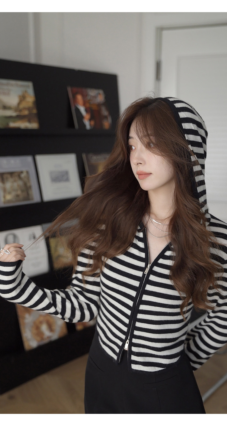흑백 스트라이프 얇은 체인 후드 니트웨어 여성용 여름 디자인 센스 슬림핏 슬림핏 짧은 가디건 코트 여성스토어 가기