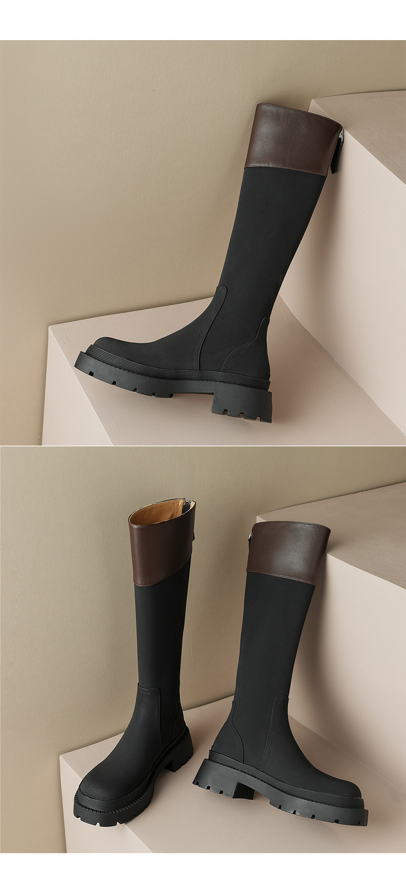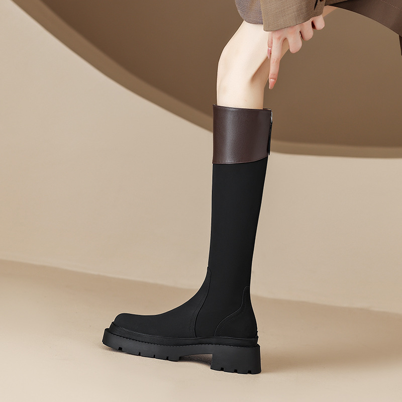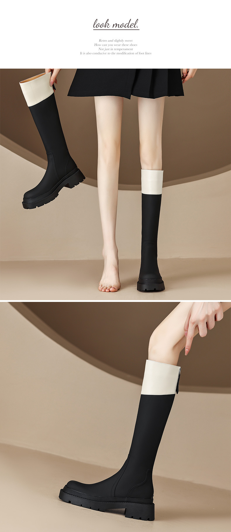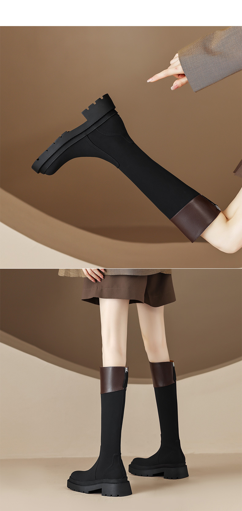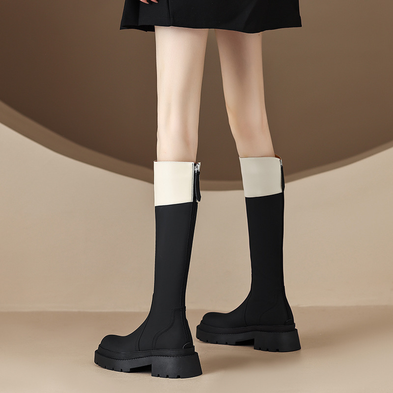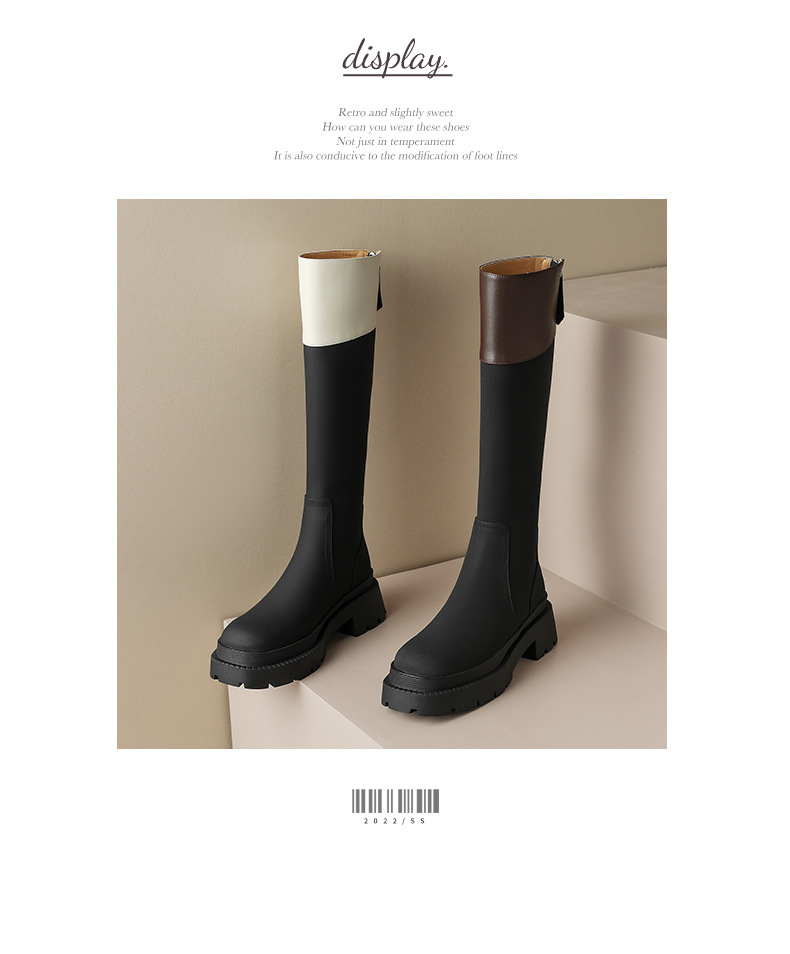 화려하지 않은 Feichi 긴 다리 ~ 가죽 라운드 헤드 컬러에 어울리는 두꺼운 밑창 나이트 부츠 여성용 2023 다용도 청키 힐 부츠