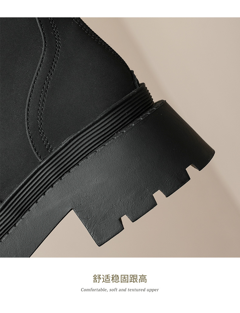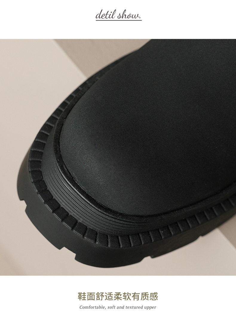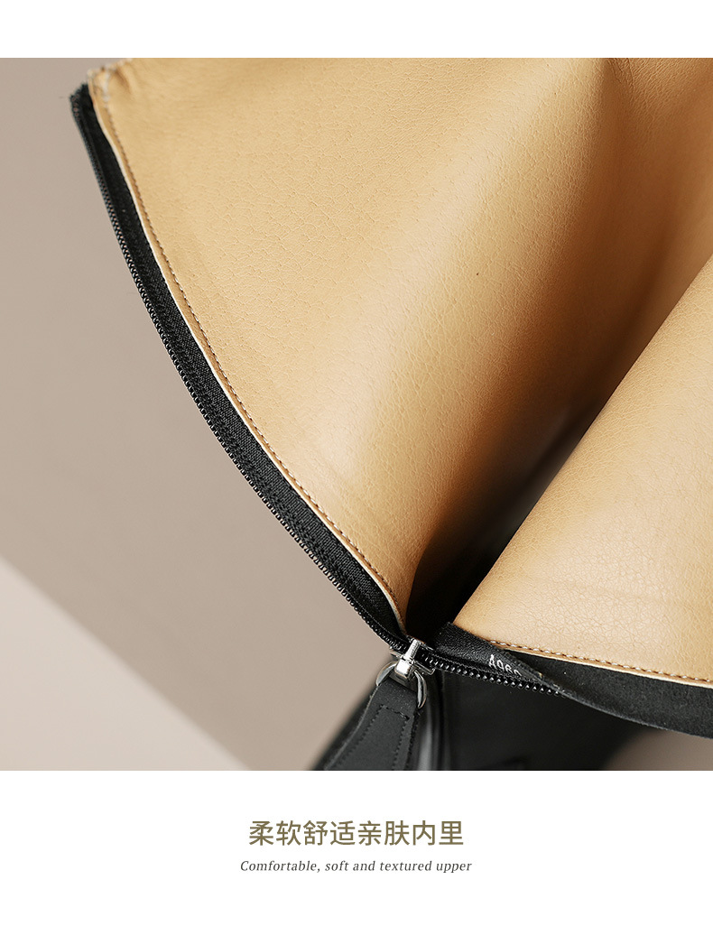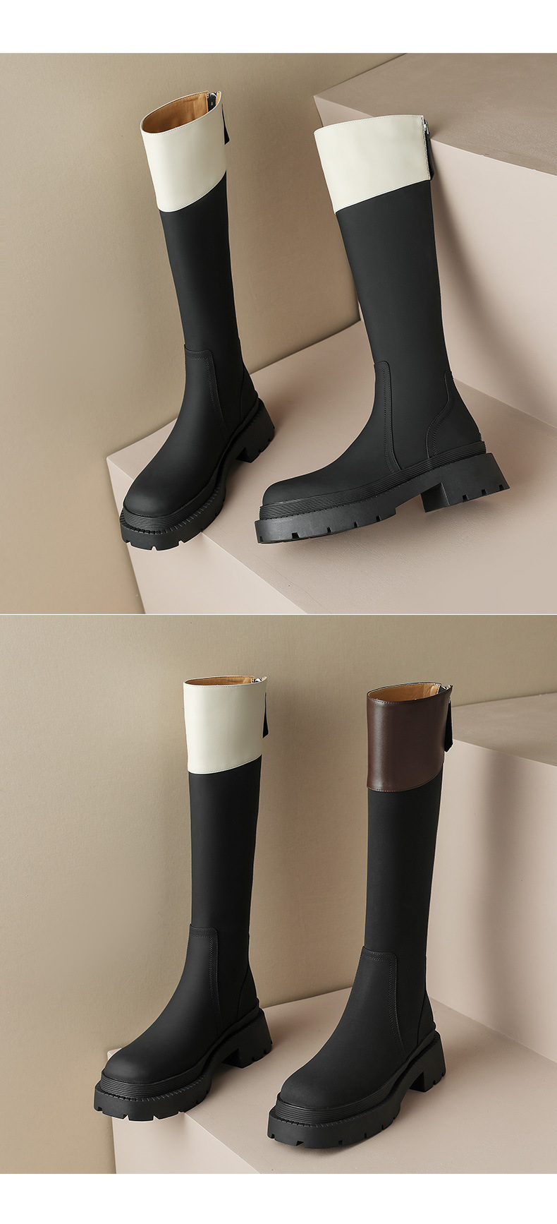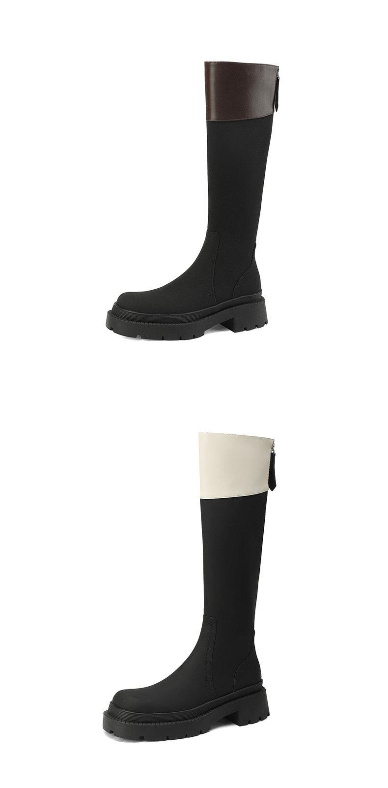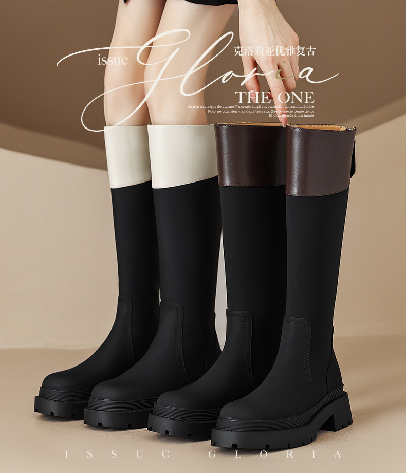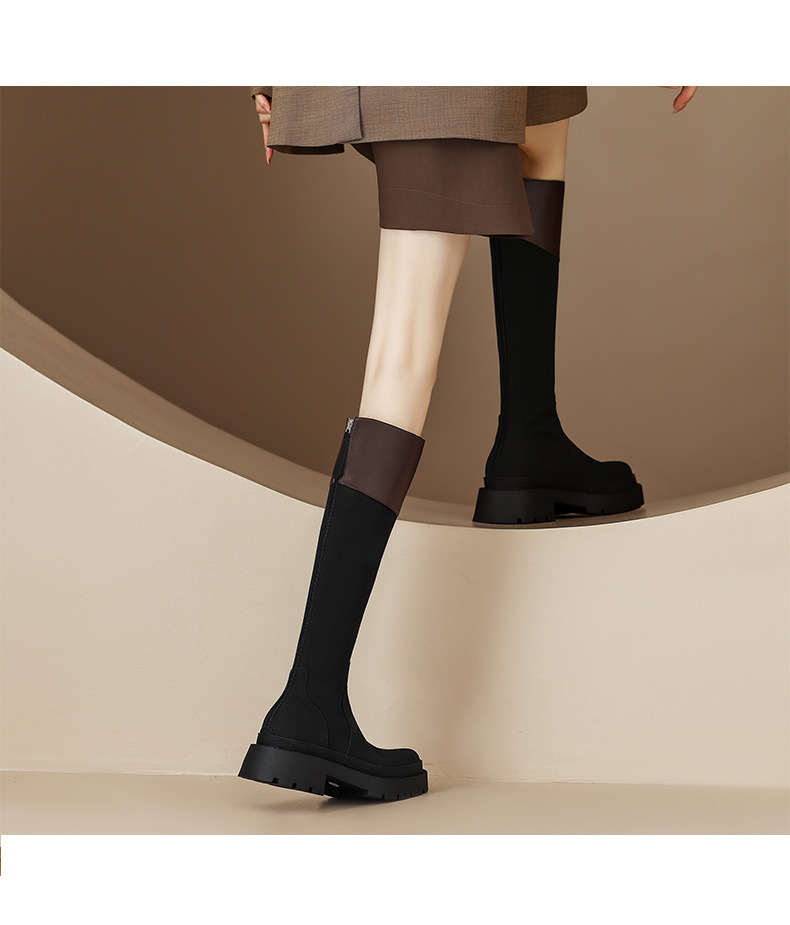 화려하지 않은 Feichi 긴 다리 ~ 가죽 라운드 헤드 컬러에 어울리는 두꺼운 밑창 나이트 부츠 여성용 2023 다용도 청키 힐 부츠
