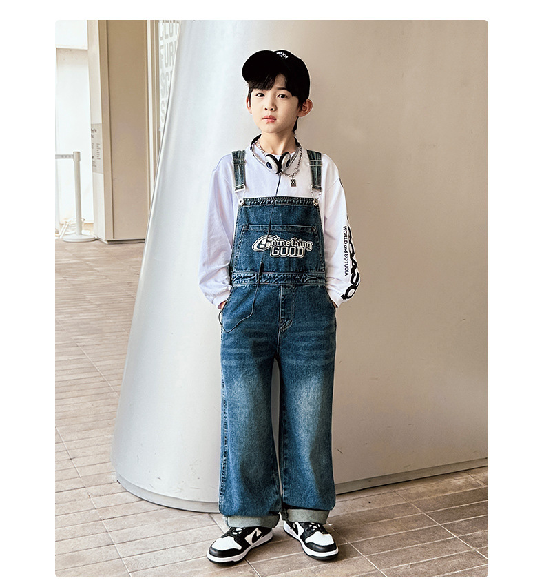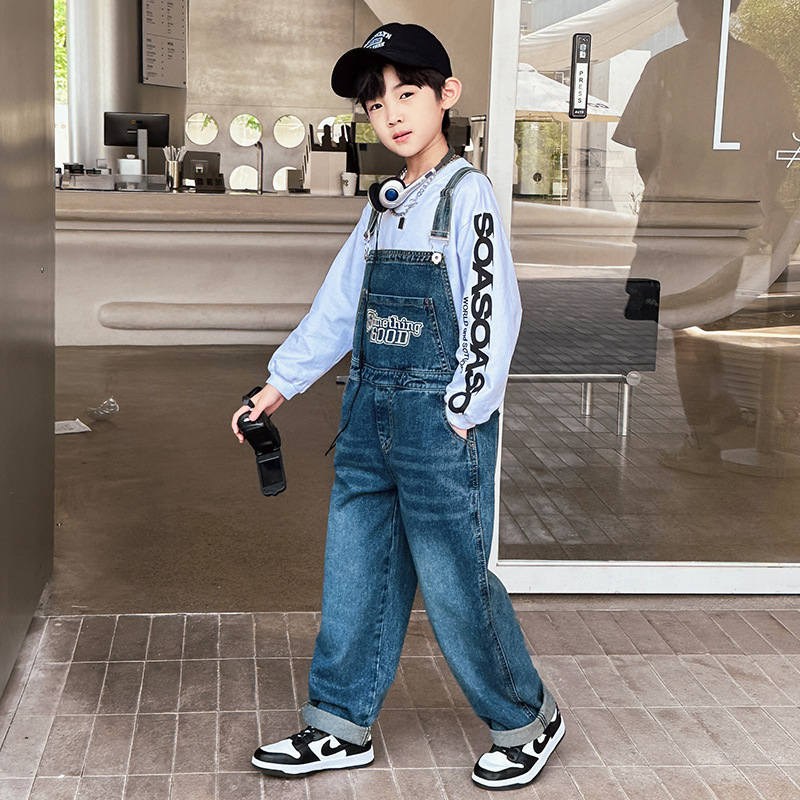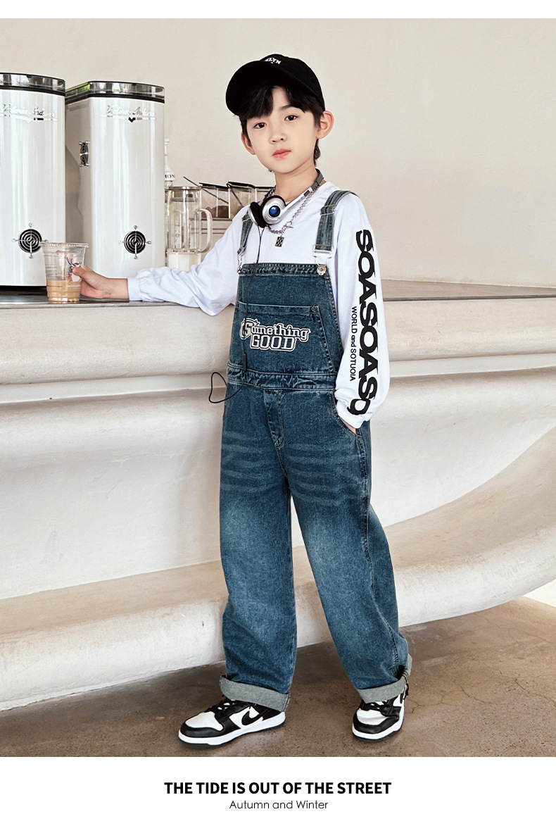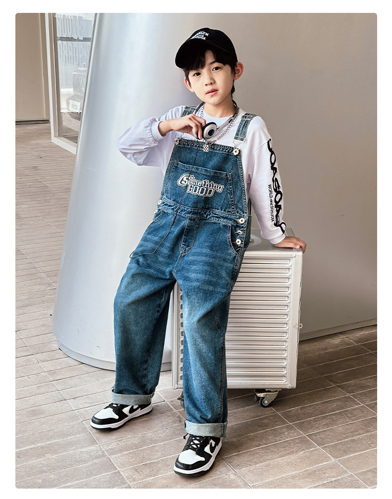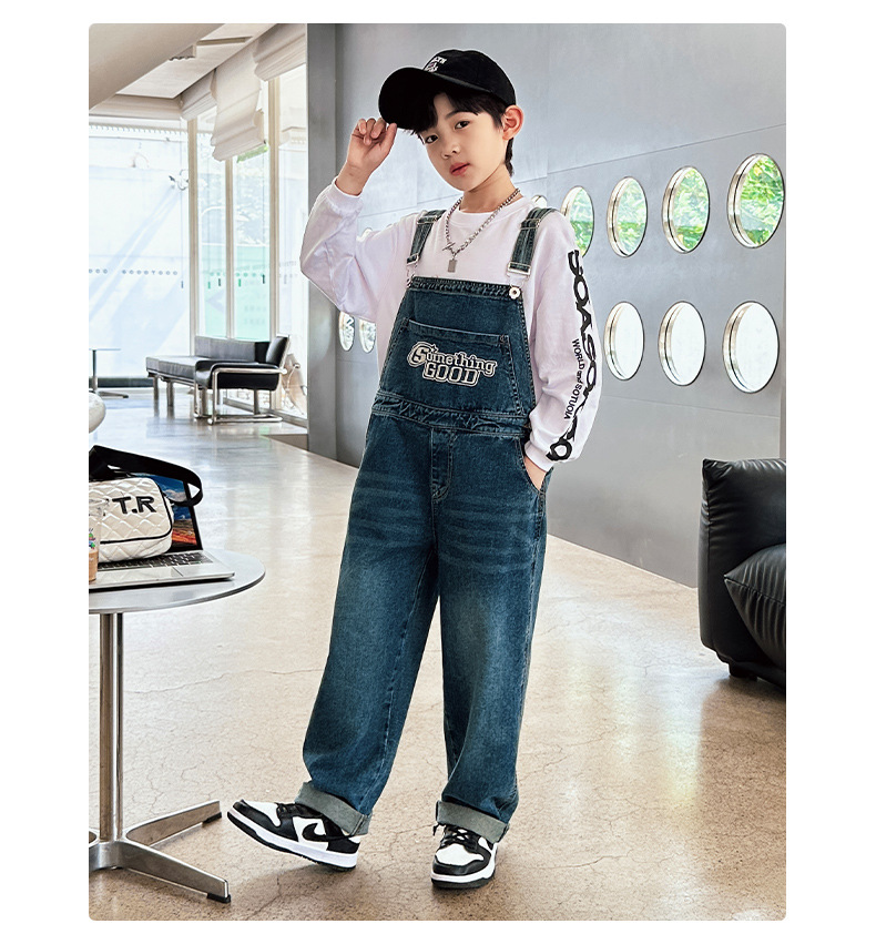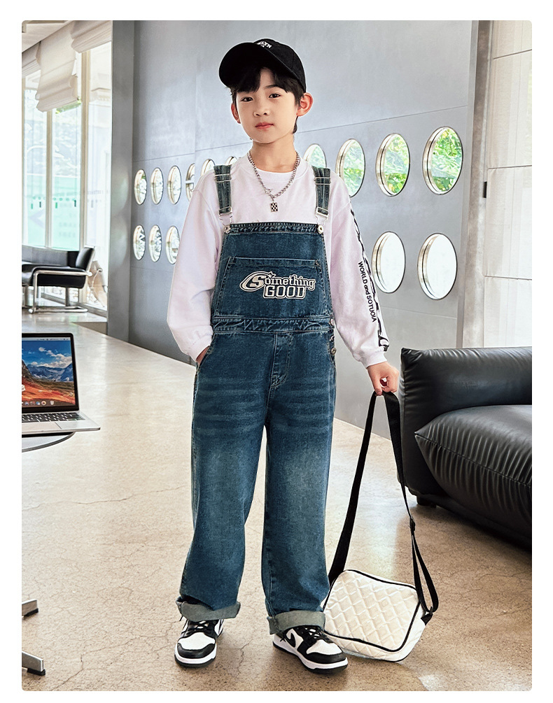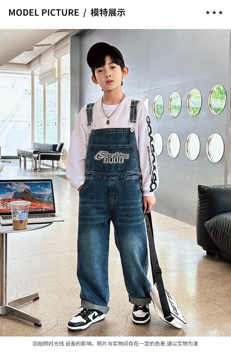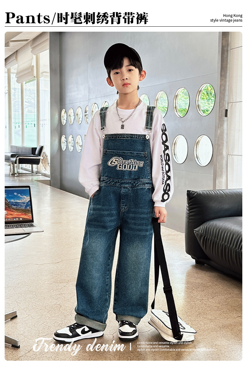 Z1013-조양통2024 봄 신상 중대형 아동용 패셔너블하고 멋진 레터 자수 데님 멜빵바지 남아용스토어 가기