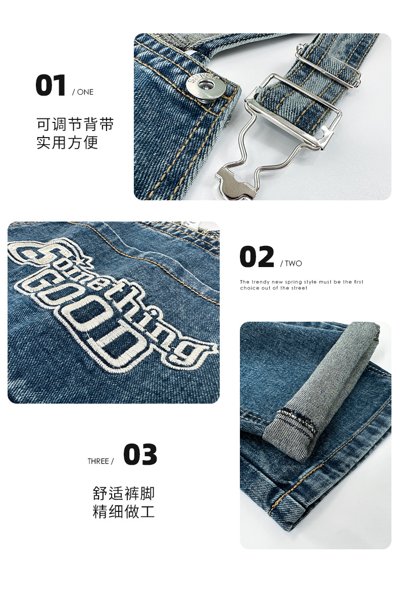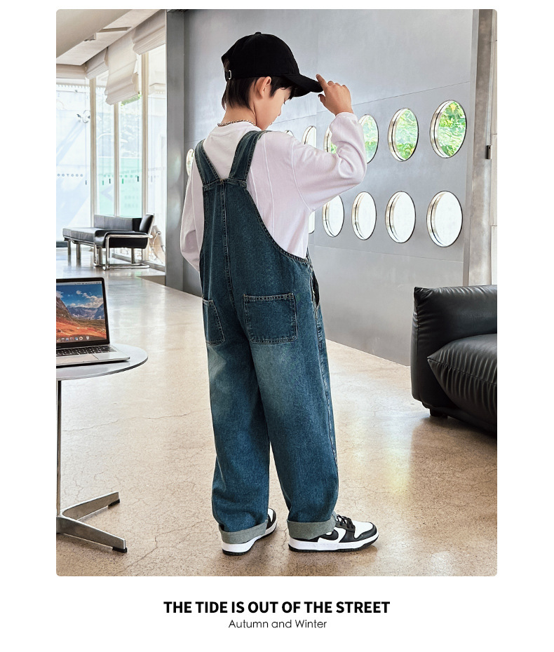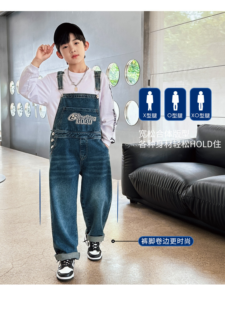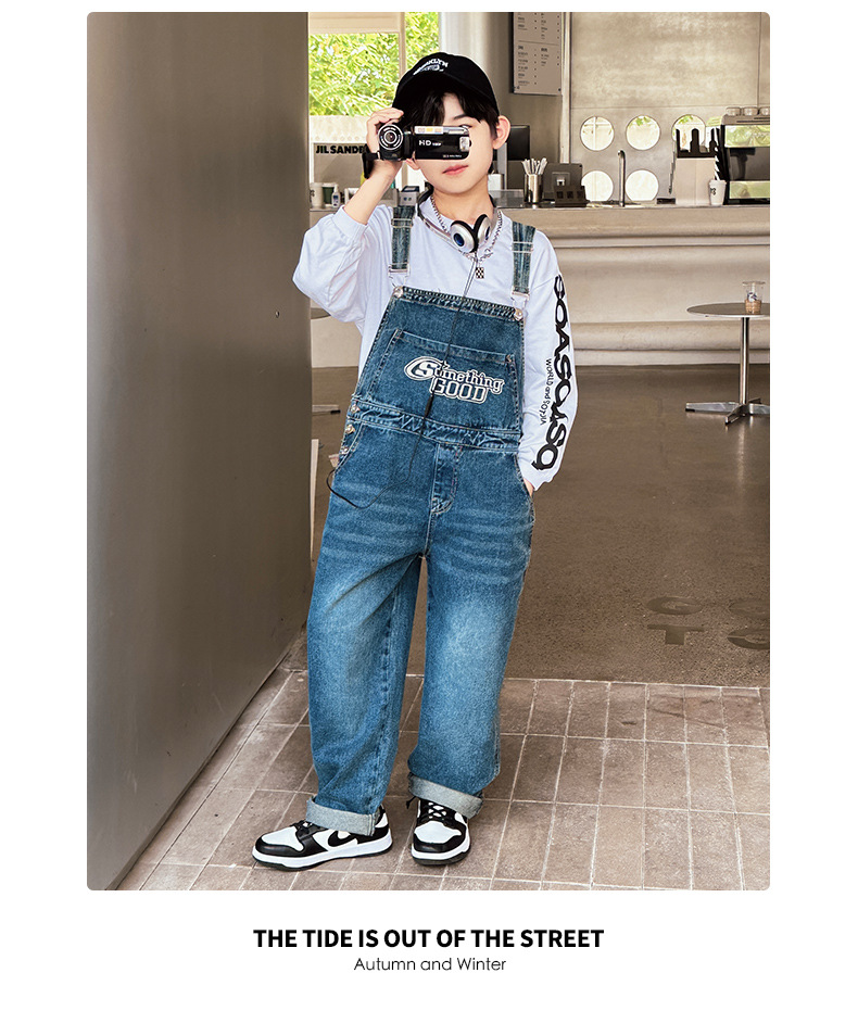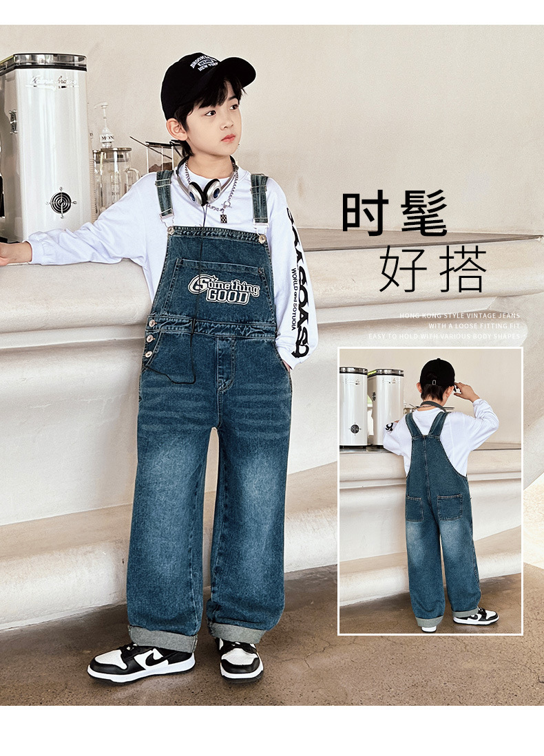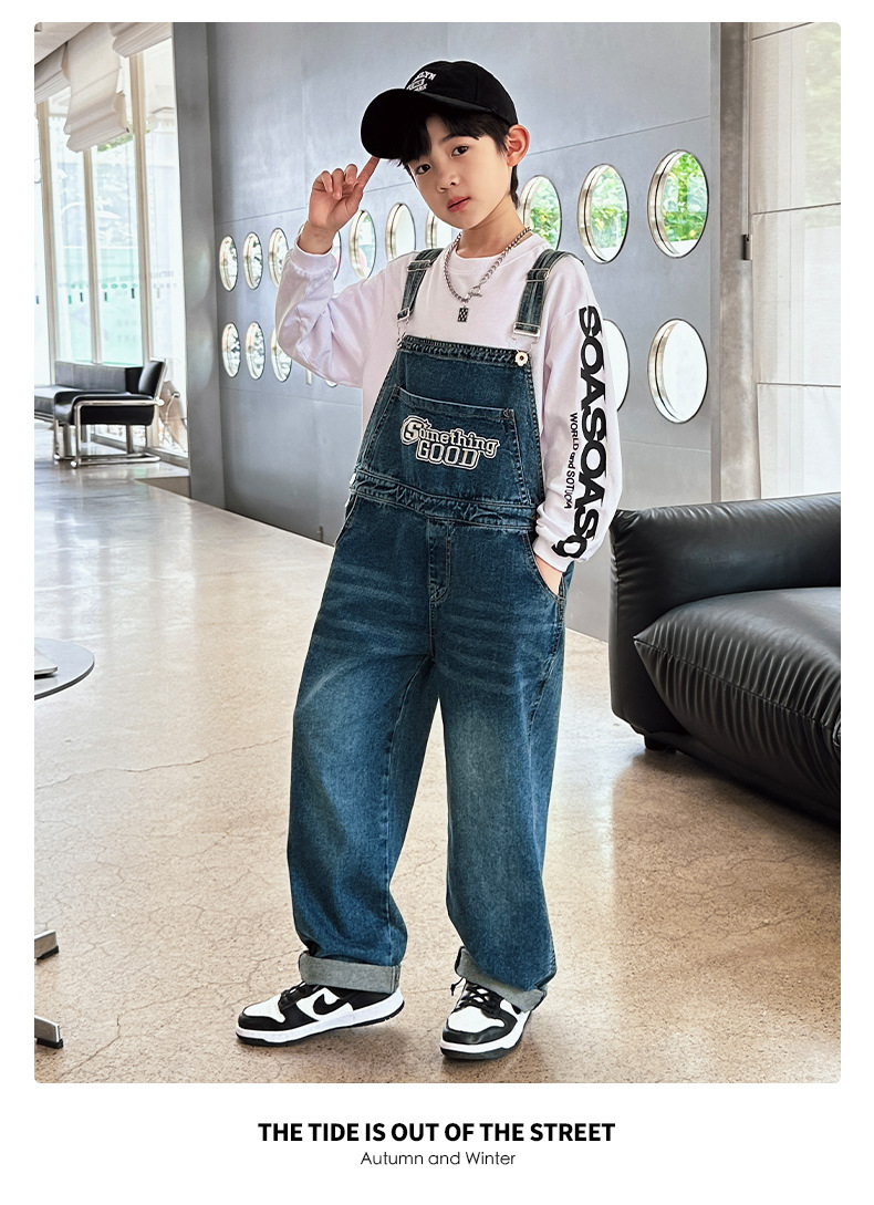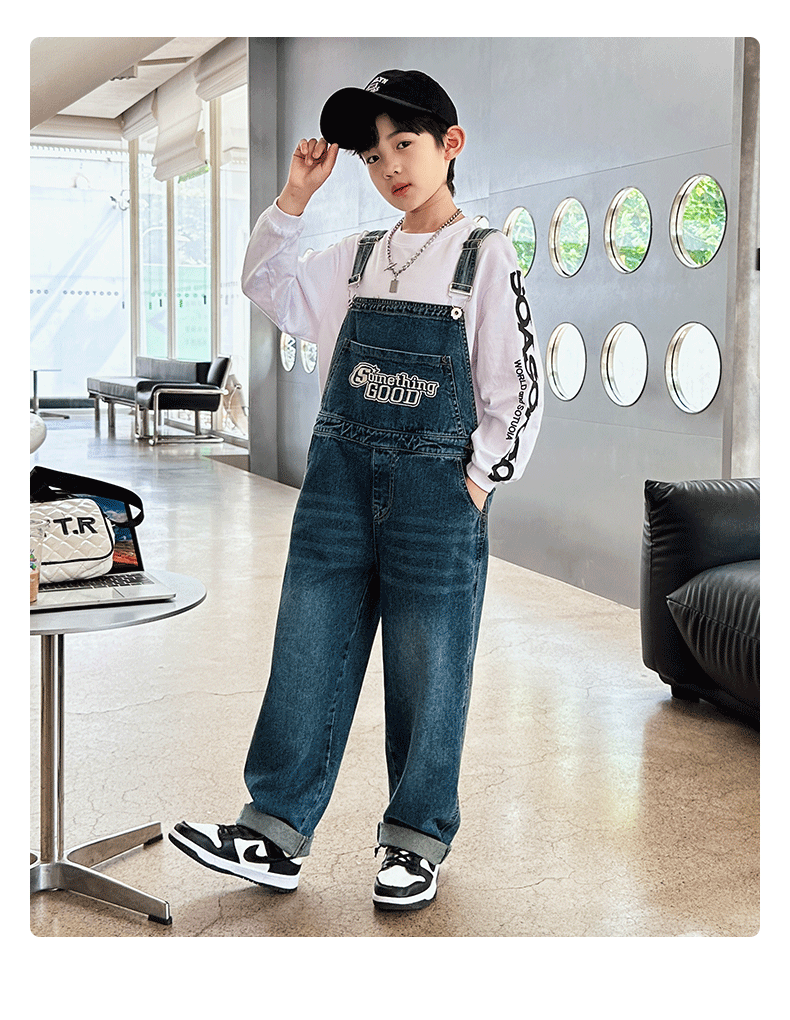 Z1013-조양통2024 봄 신상 중대형 아동용 패셔너블하고 멋진 레터 자수 데님 멜빵바지 남아용스토어 가기