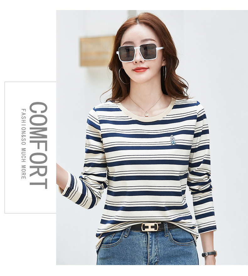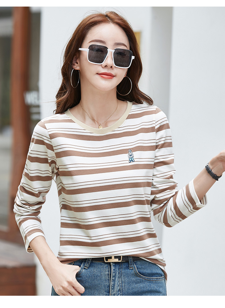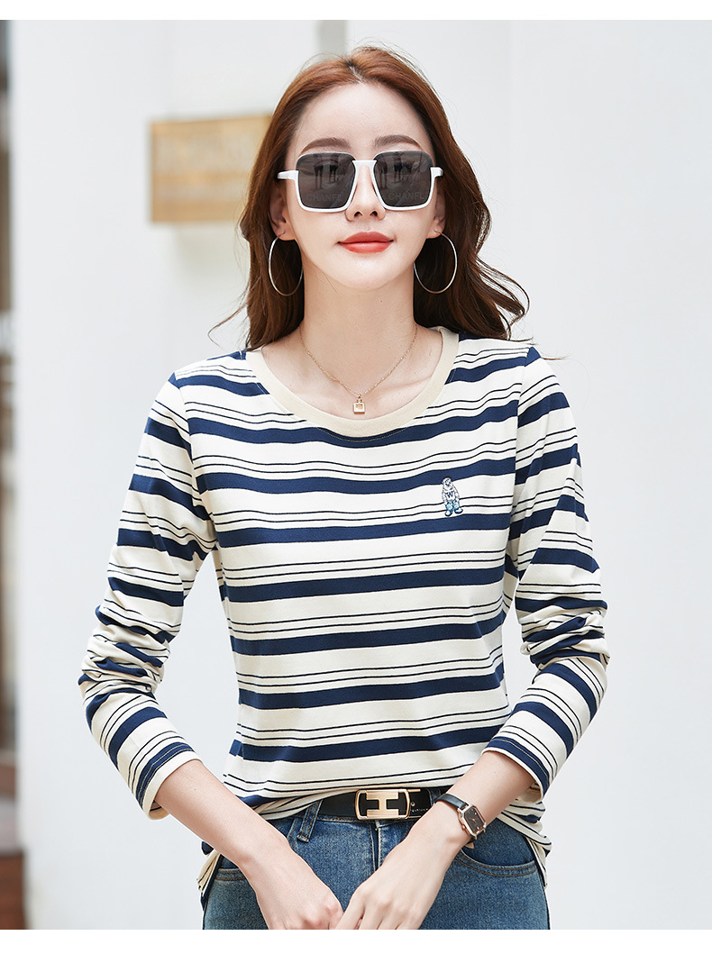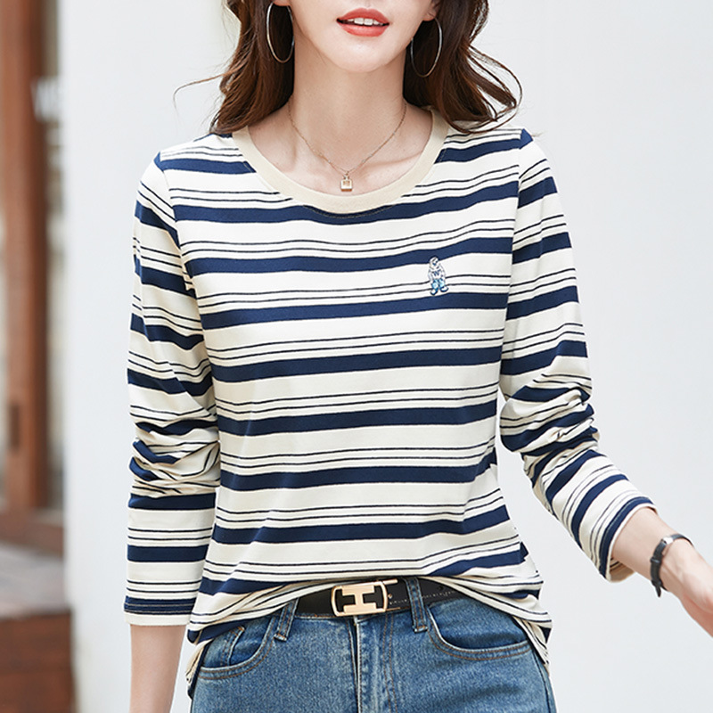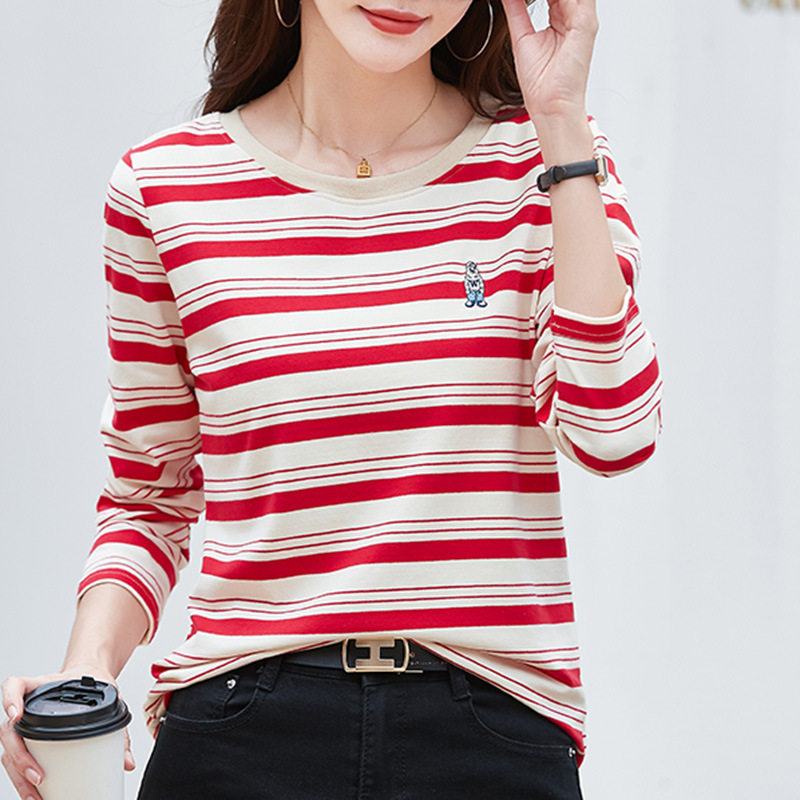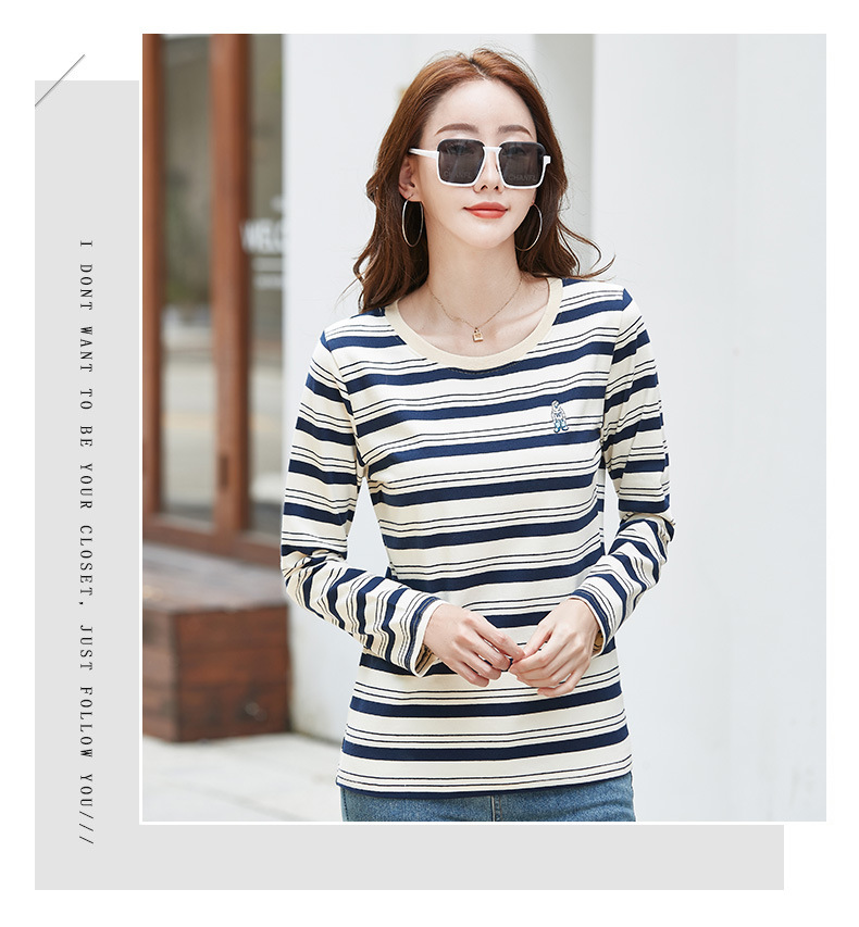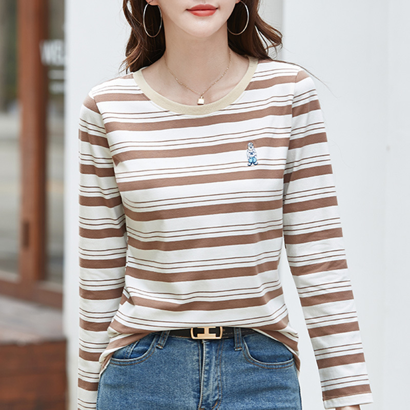 419 가을과 겨울 새로운 스트라이프 자수 인형 크루넥 긴 소매 베이스 셔츠 겉옷 탑 여성 캐주얼 슬리밍 티셔츠