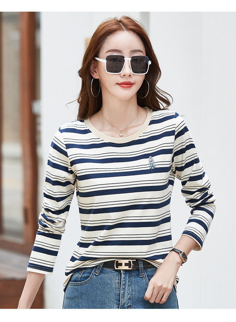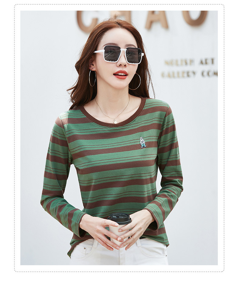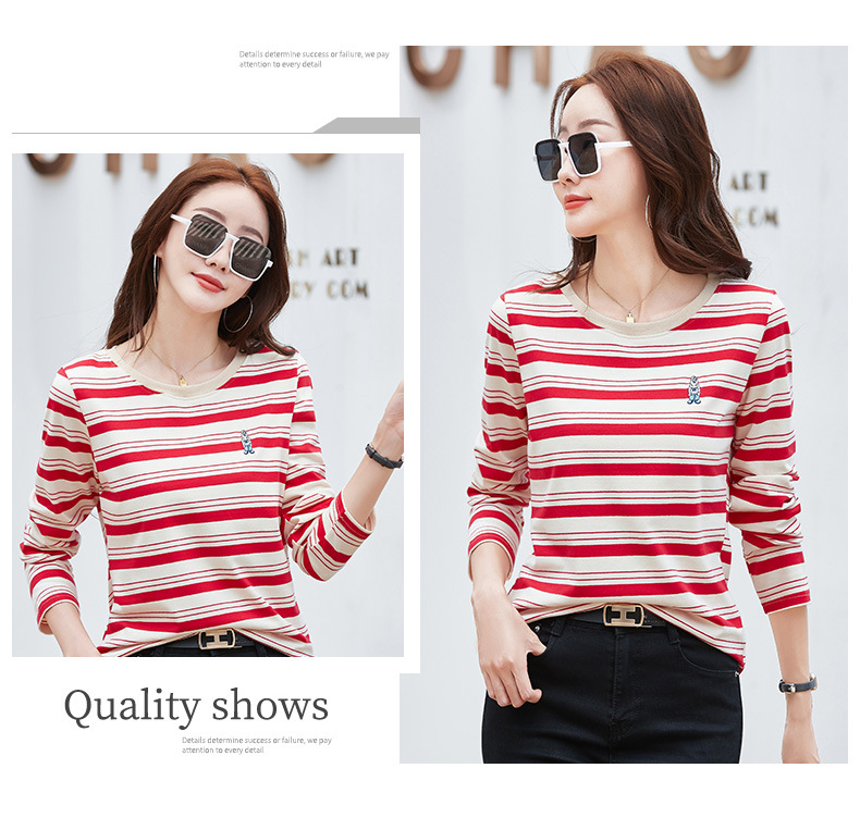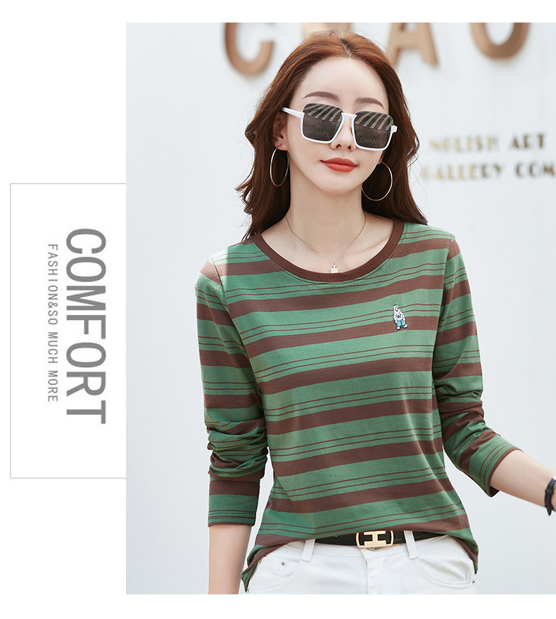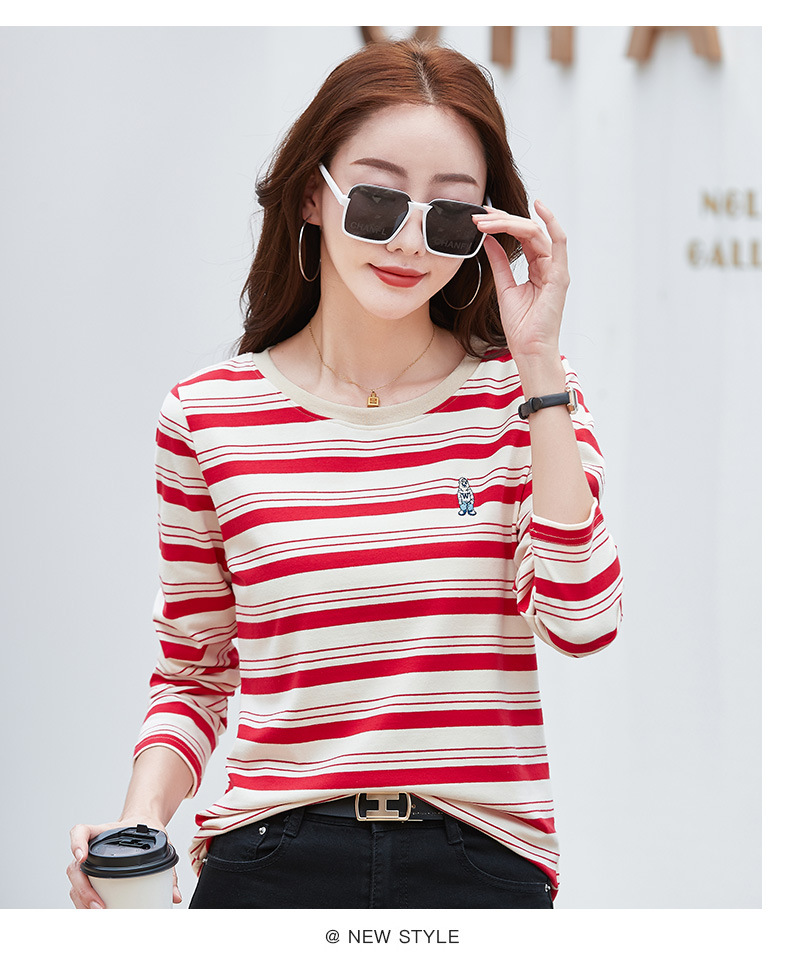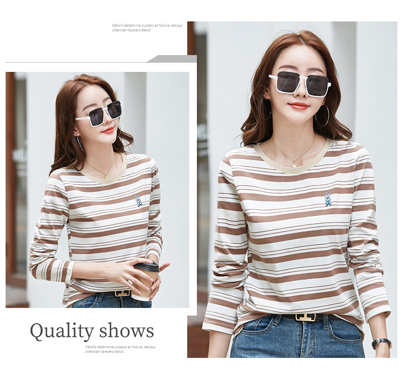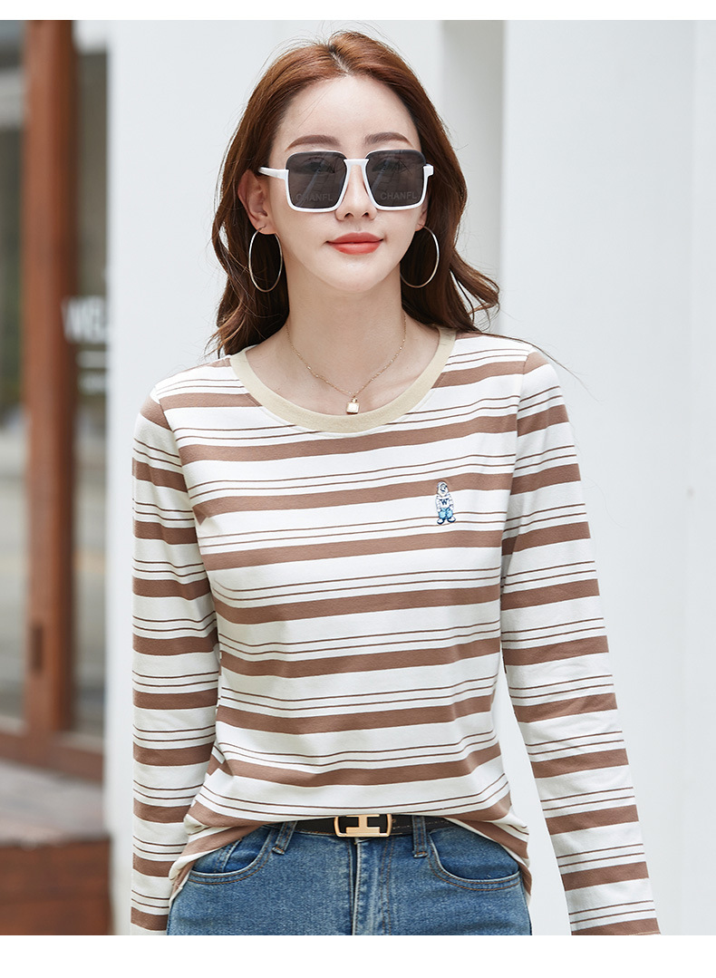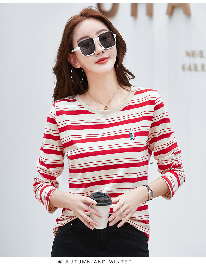 419 가을과 겨울 새로운 스트라이프 자수 인형 크루넥 긴 소매 베이스 셔츠 겉옷 탑 여성 캐주얼 슬리밍 티셔츠