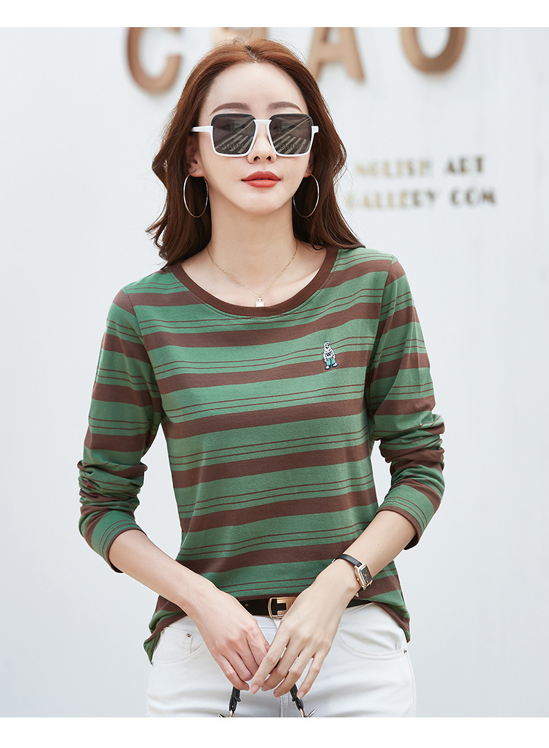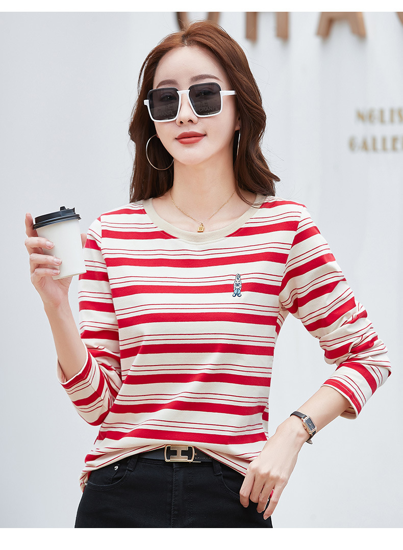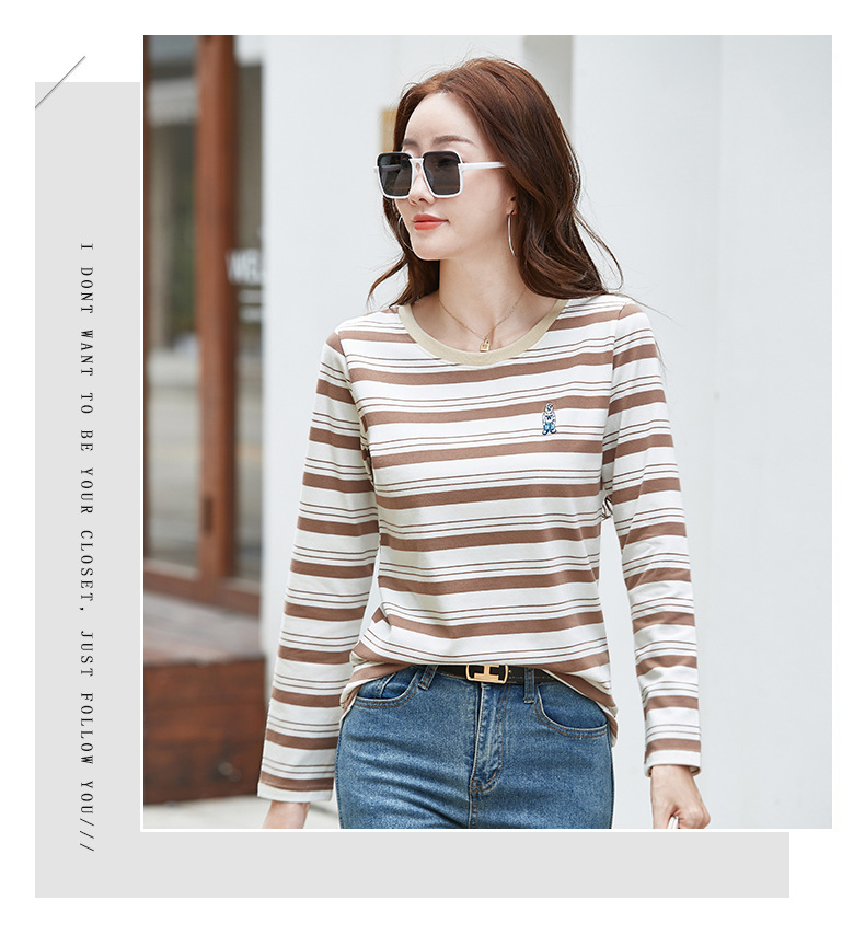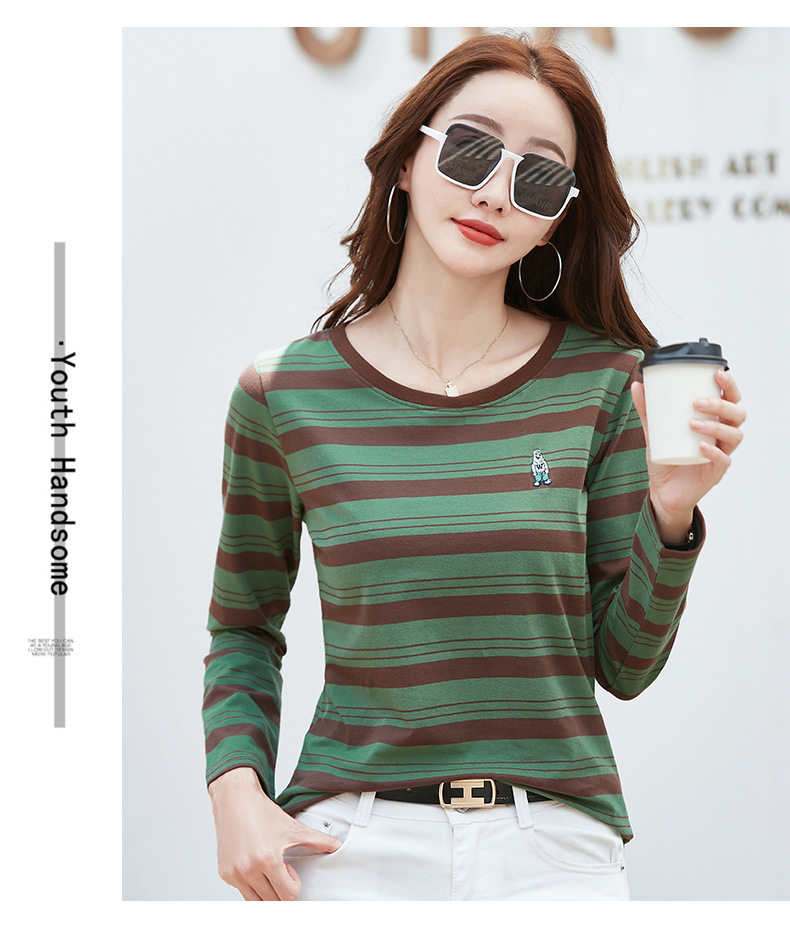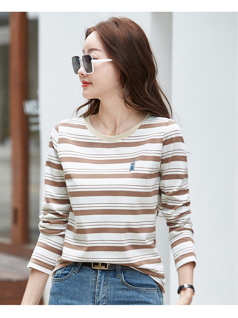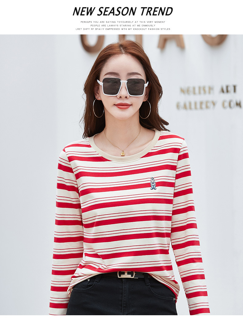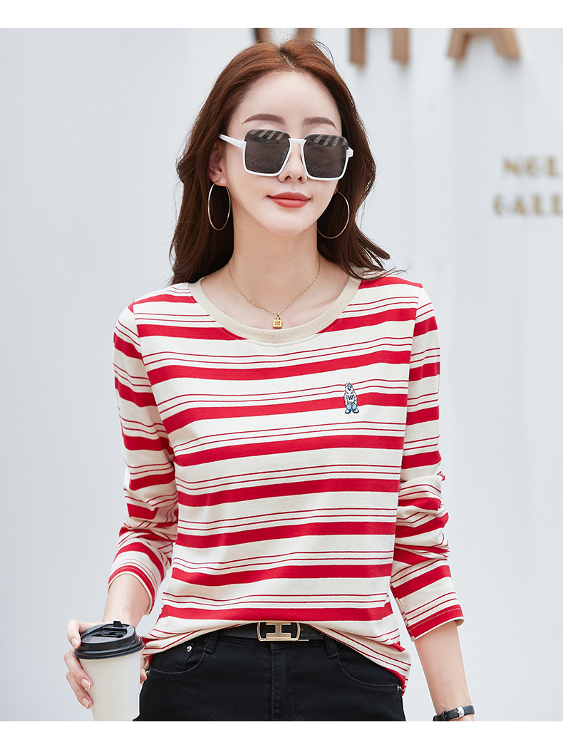 419 가을과 겨울 새로운 스트라이프 자수 인형 크루넥 긴 소매 베이스 셔츠 겉옷 탑 여성 캐주얼 슬리밍 티셔츠