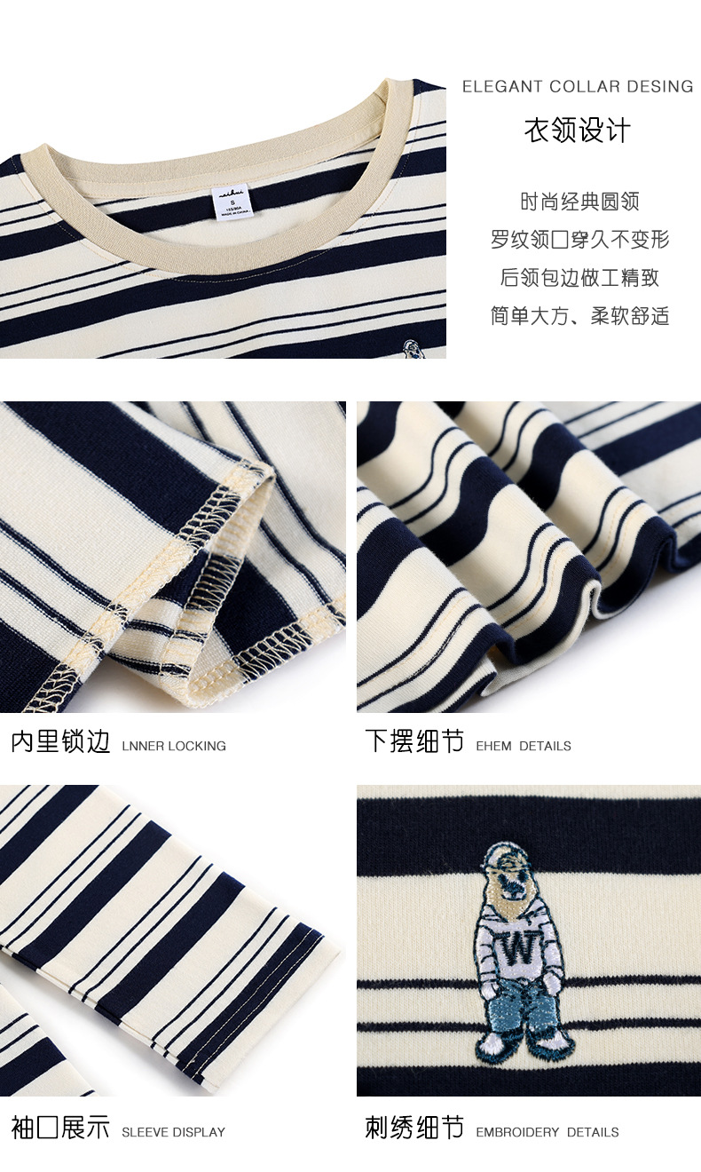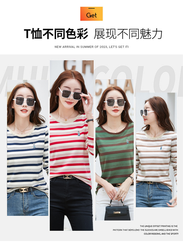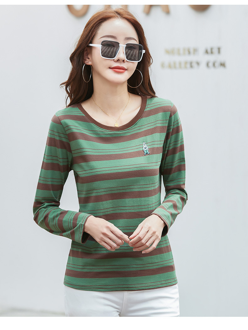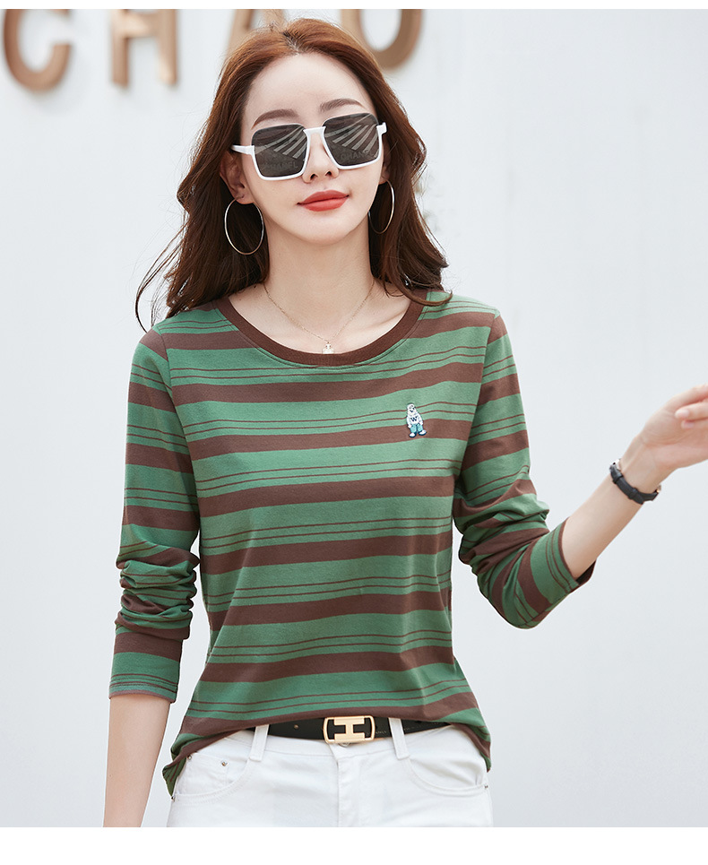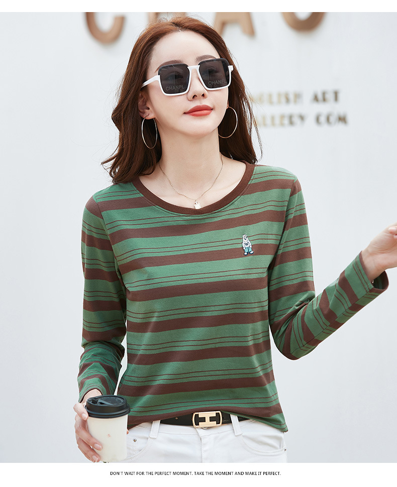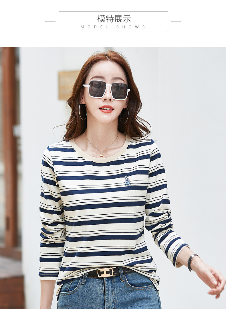 419 가을과 겨울 새로운 스트라이프 자수 인형 크루넥 긴 소매 베이스 셔츠 겉옷 탑 여성 캐주얼 슬리밍 티셔츠