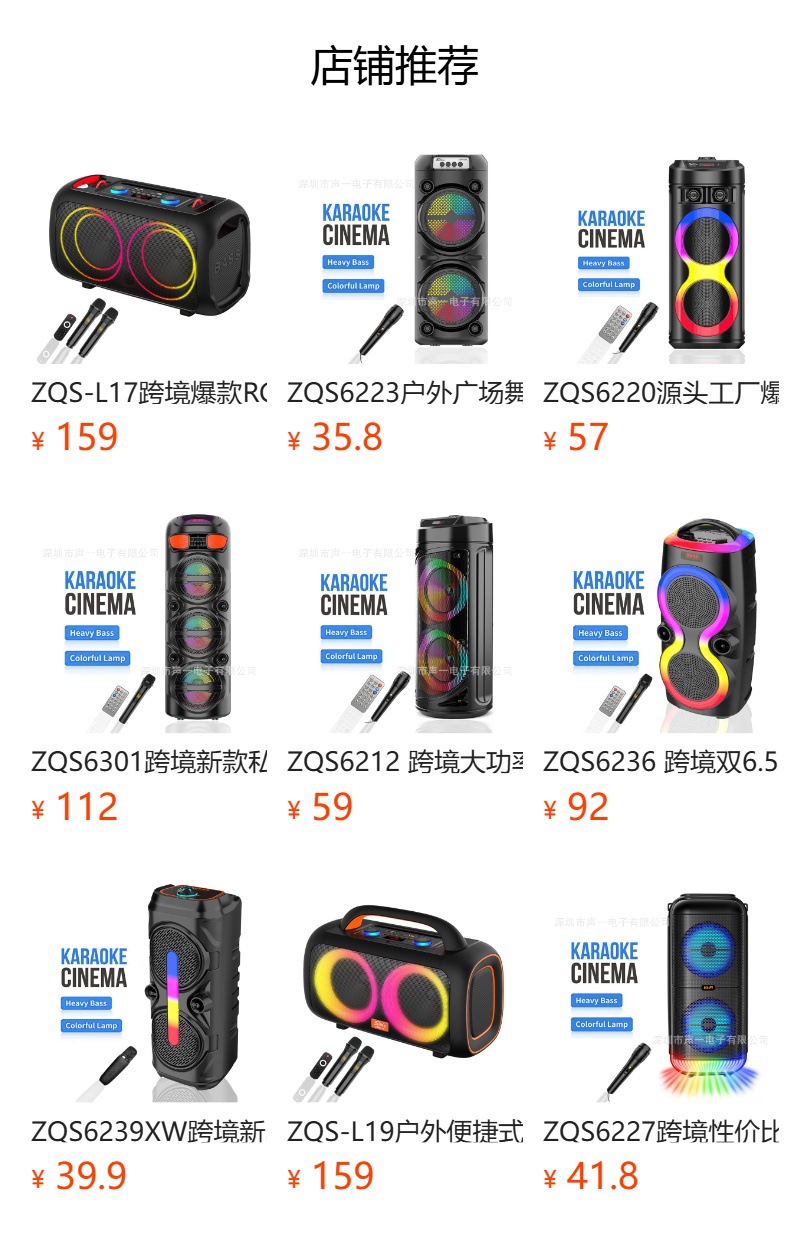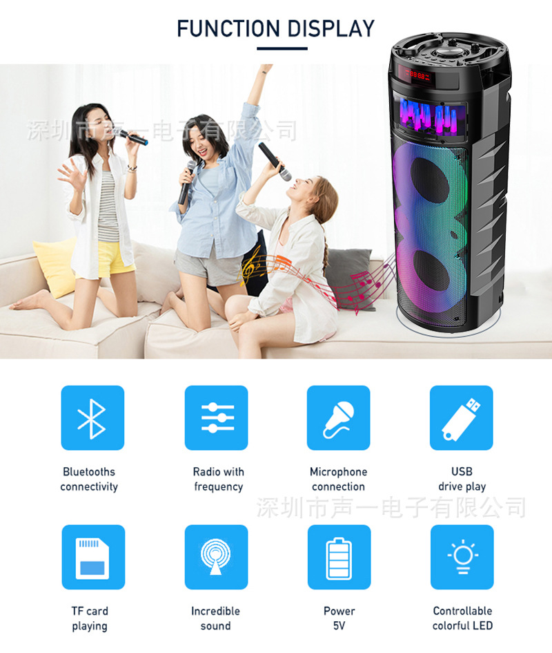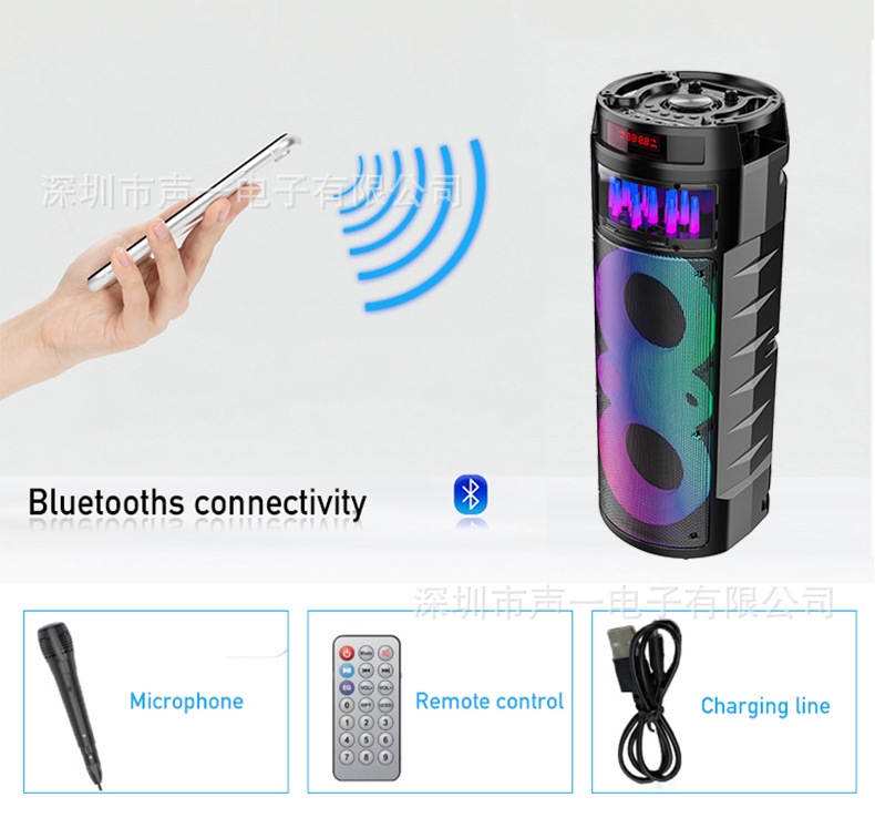Equipped with BT/USB/TF/FM/AUX/MIC, DC-5V charging (Type-C charging stand), display screen/remote control (both display screen and receiver head are equipped with motherboard), dual power amplifier+tweeter, with lithium battery protection, USB with 5V boost, box to box function, potentiometer volume, with phantom and phantom controlled by MODE