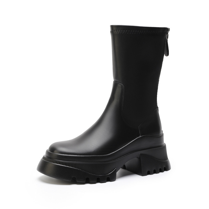 2023 새로운 가을과 겨울 부츠 정품 가죽 미디 부츠 짧은 부츠 여성용 스트레치 얇은 부츠 작은 두꺼운 바닥 마틴 부츠