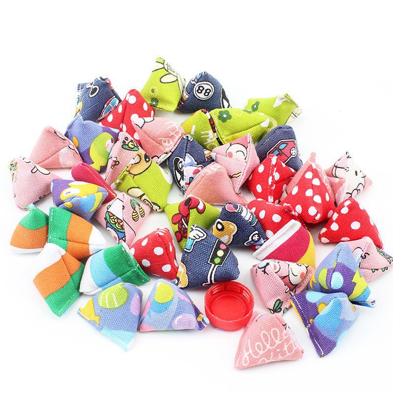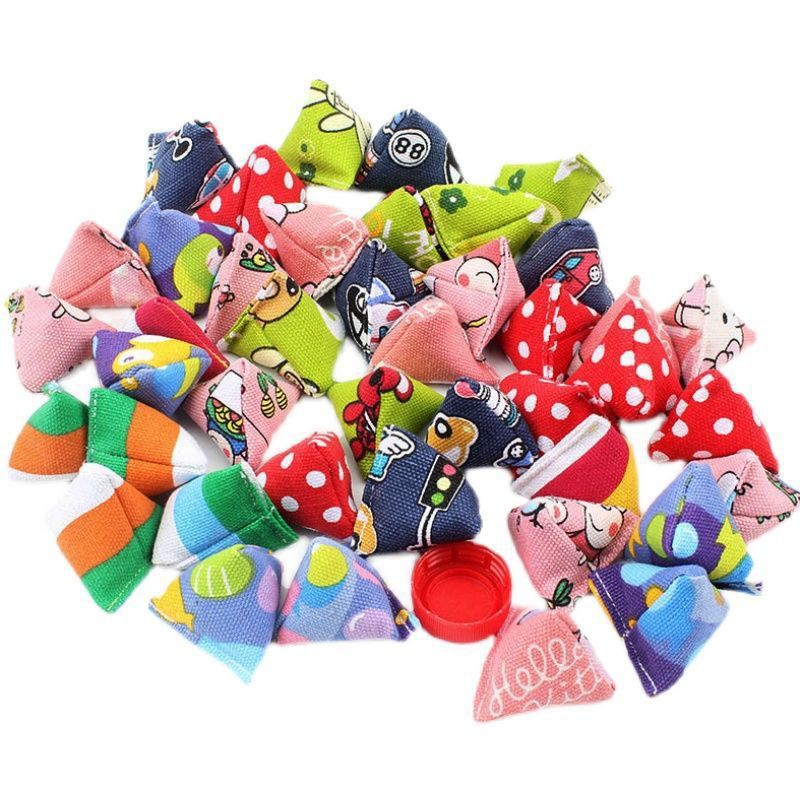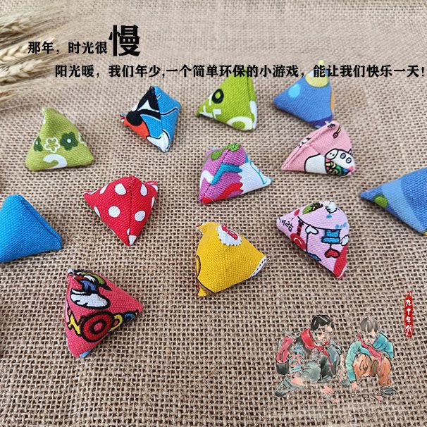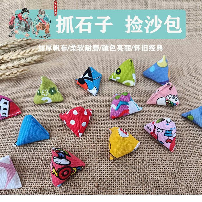 어린이가 작은 삼각형 모래주머니를 잡을 수 있는 삼각형 모래주머니, 유치원 초등학생이 모래주머니를 잡고 돌을 던지는 게임 장난감
